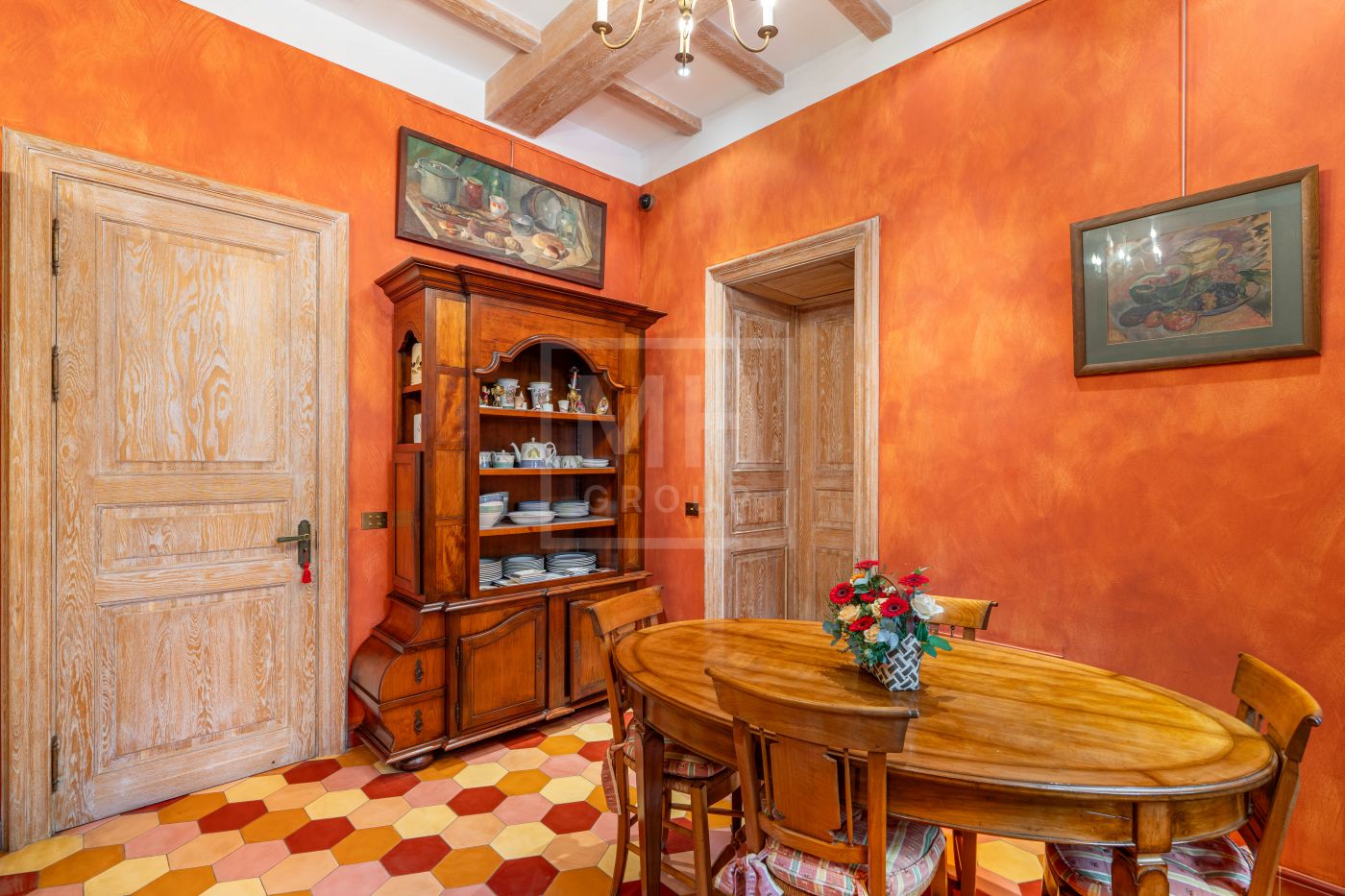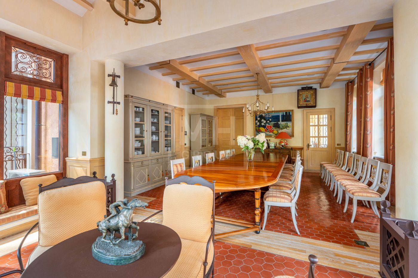 В окружении вековых сосен, на престижном Рублево-Успенском шоссе, всего в 24 км от Москвы, расположено загородное имение в поселке "Сосновый Бор" - полноценная резиденция площадью 1018 м на участке 75 соток с профессиональным ландшафтным дизайном. Это не просто дом, а тщательно выстроенное пространство для жизни в стиле приватного курорта - с комфортом, тишиной и возможностью уединиться в собственном лесу, не покидая столичного региона.Интерьеры выполнены в отделке "под ключ" с использованием премиальных материалов и укомплектованы мебелью. Планировка продумана как для представительного приема гостей, так и для спокойной семейной жизни. Центральным пространством первого этажа становится просторная гостиная с камином, переходящая в кухню-столовую с выходом на террасу - идеальное место для летних ужинов или неспешных утренних разговоров за кофе.