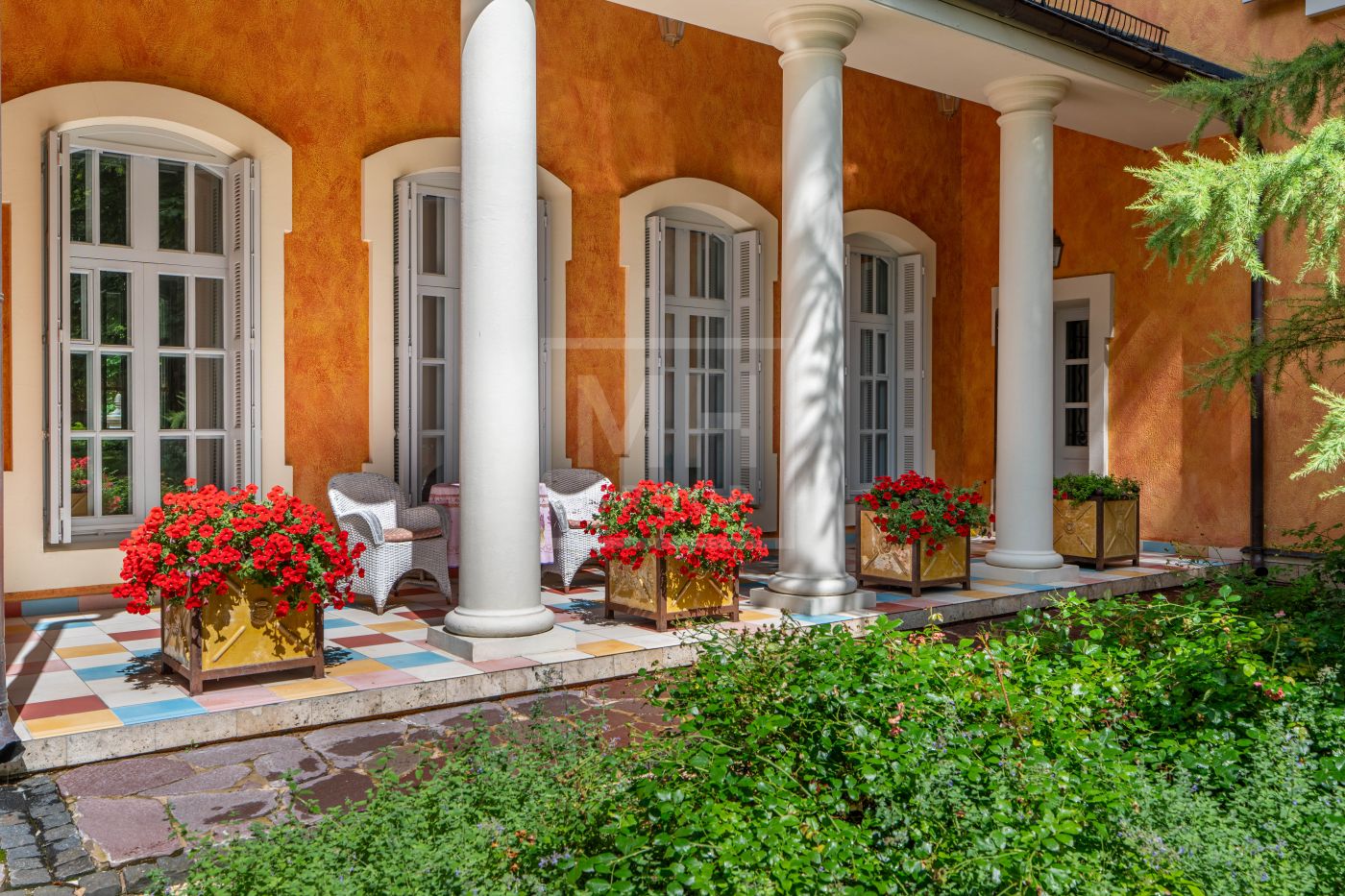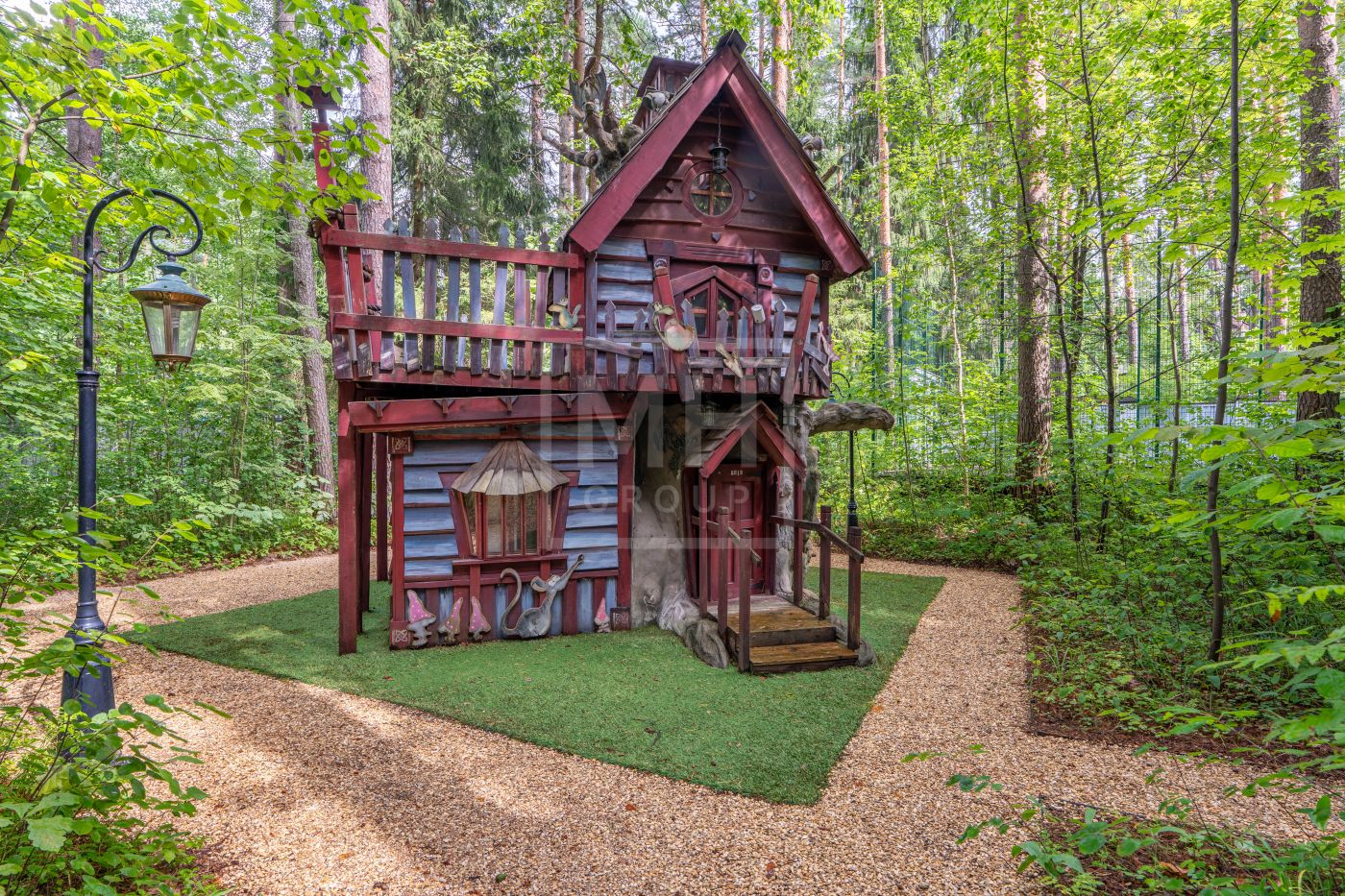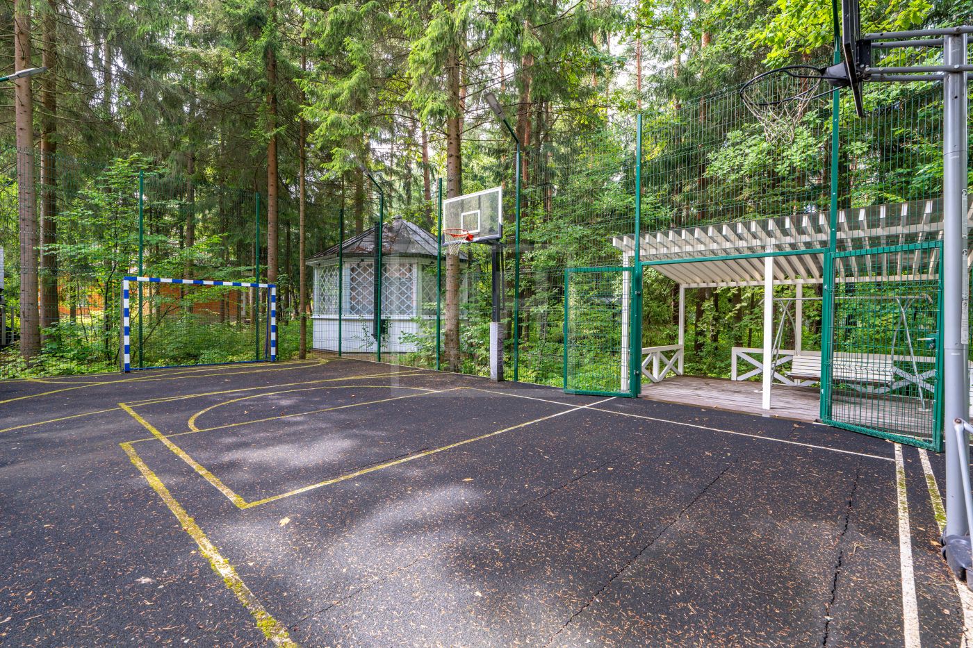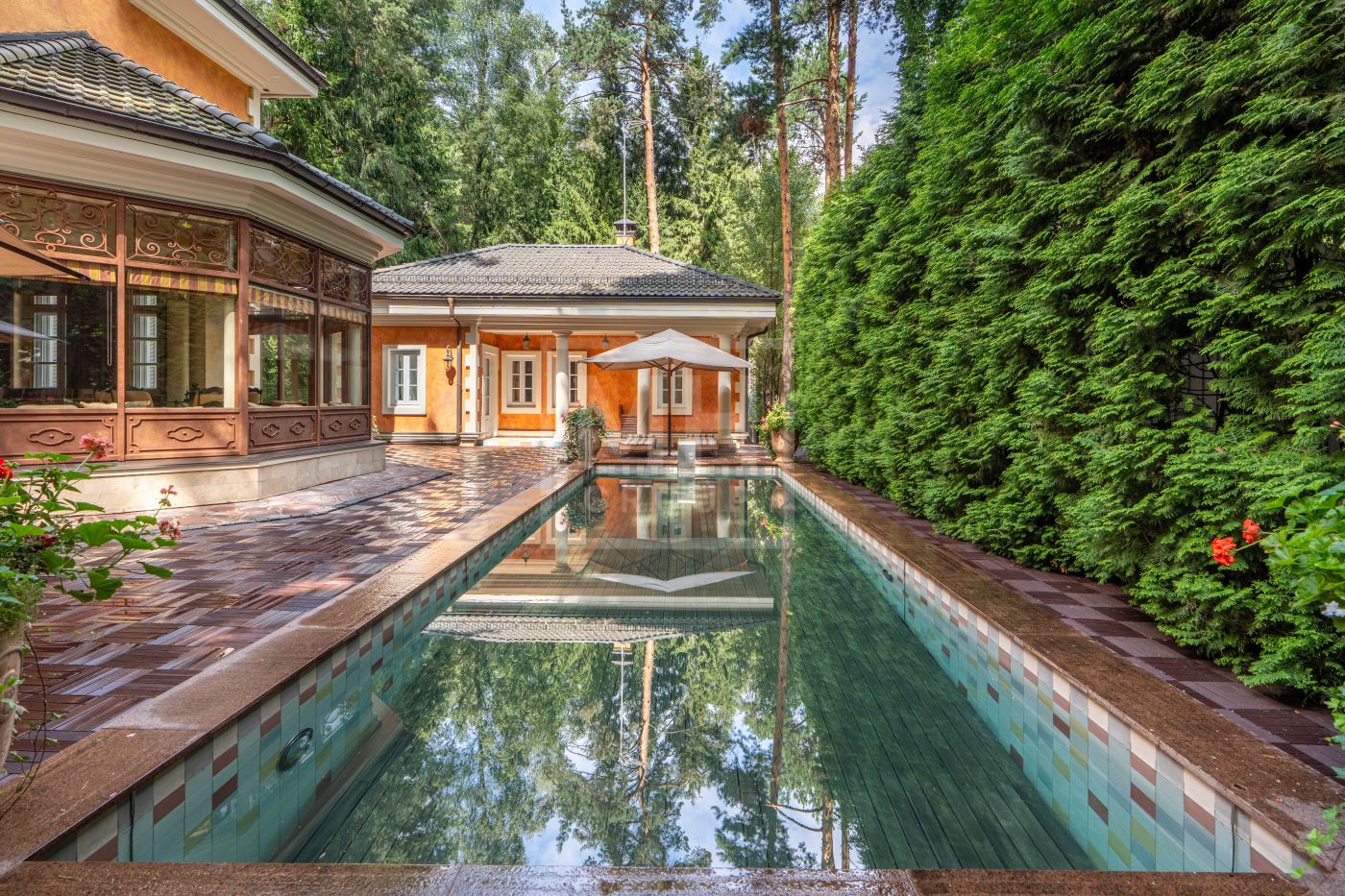 На территории расположены дополнительные постройки - отдельно стоящая баня, летний кинотеатр, теннисный корт, спортивная площадка, а также беседка с летней кухней для встреч в кругу семьи и друзей. Гараж на два автомобиля вынесен отдельно, что обеспечивает тишину в жилой части участка.