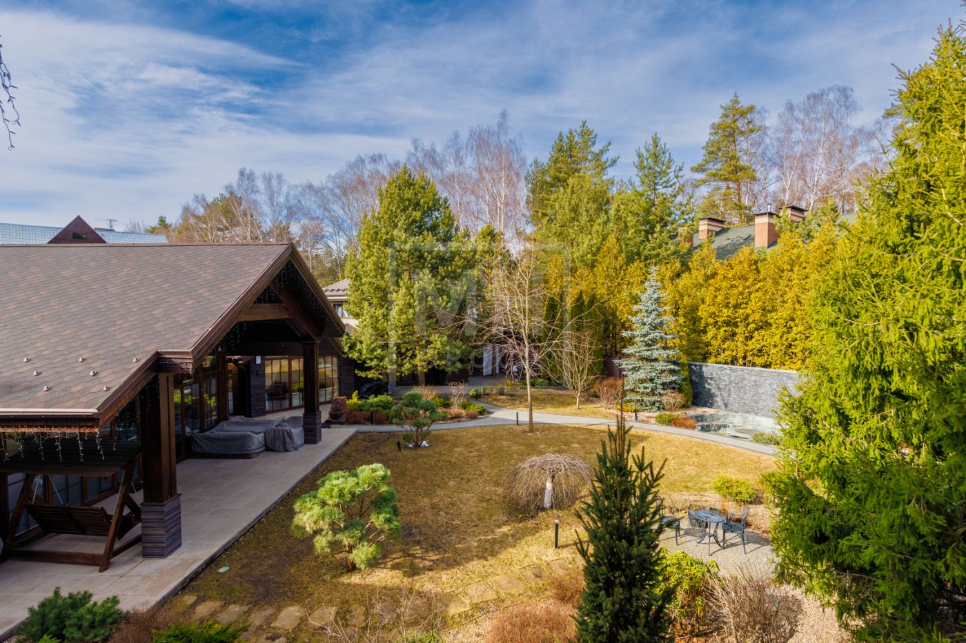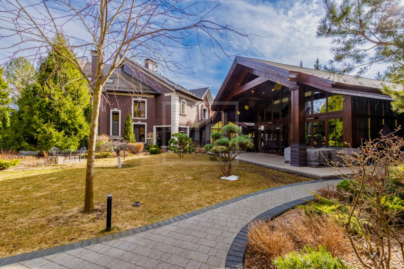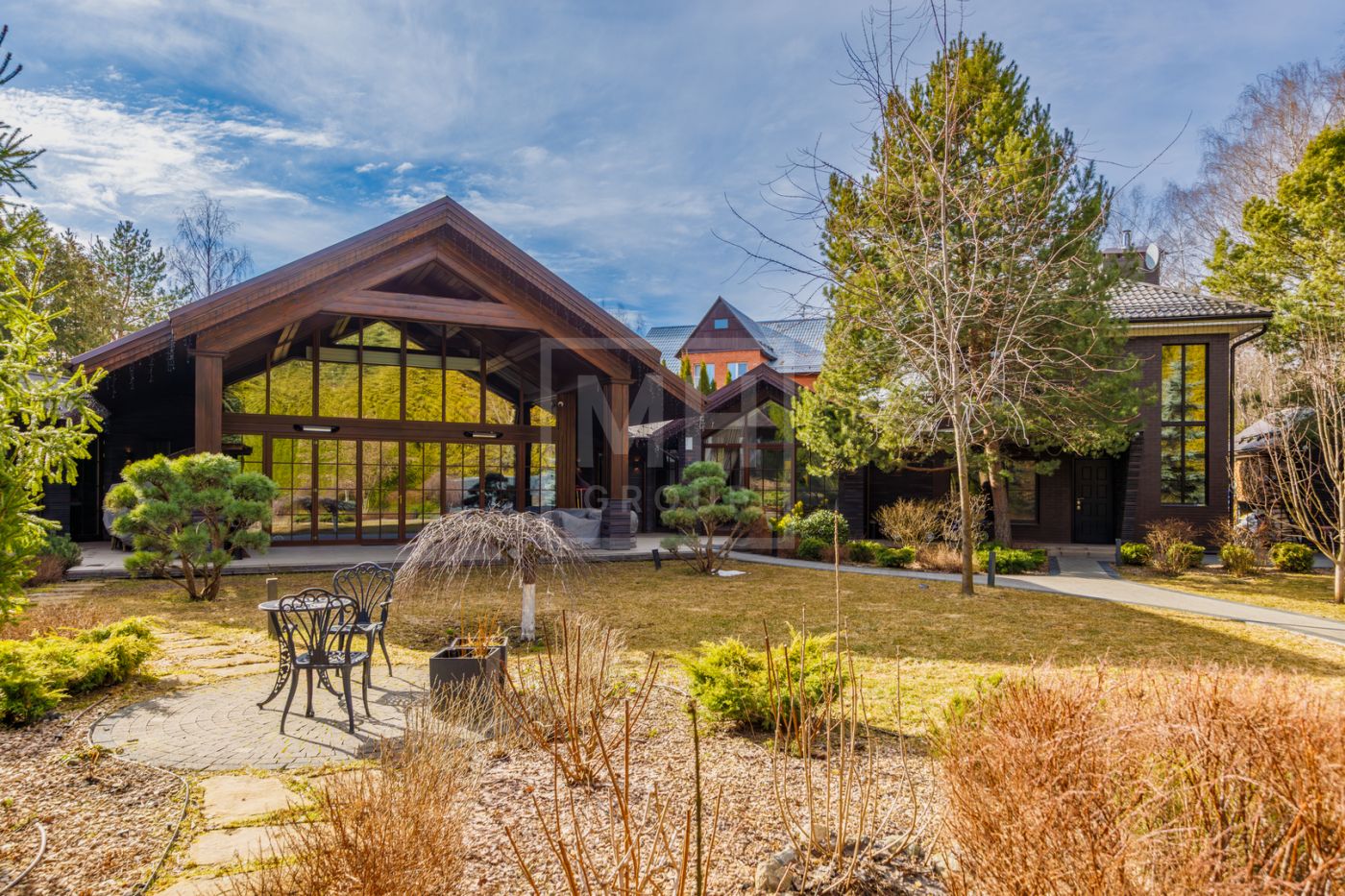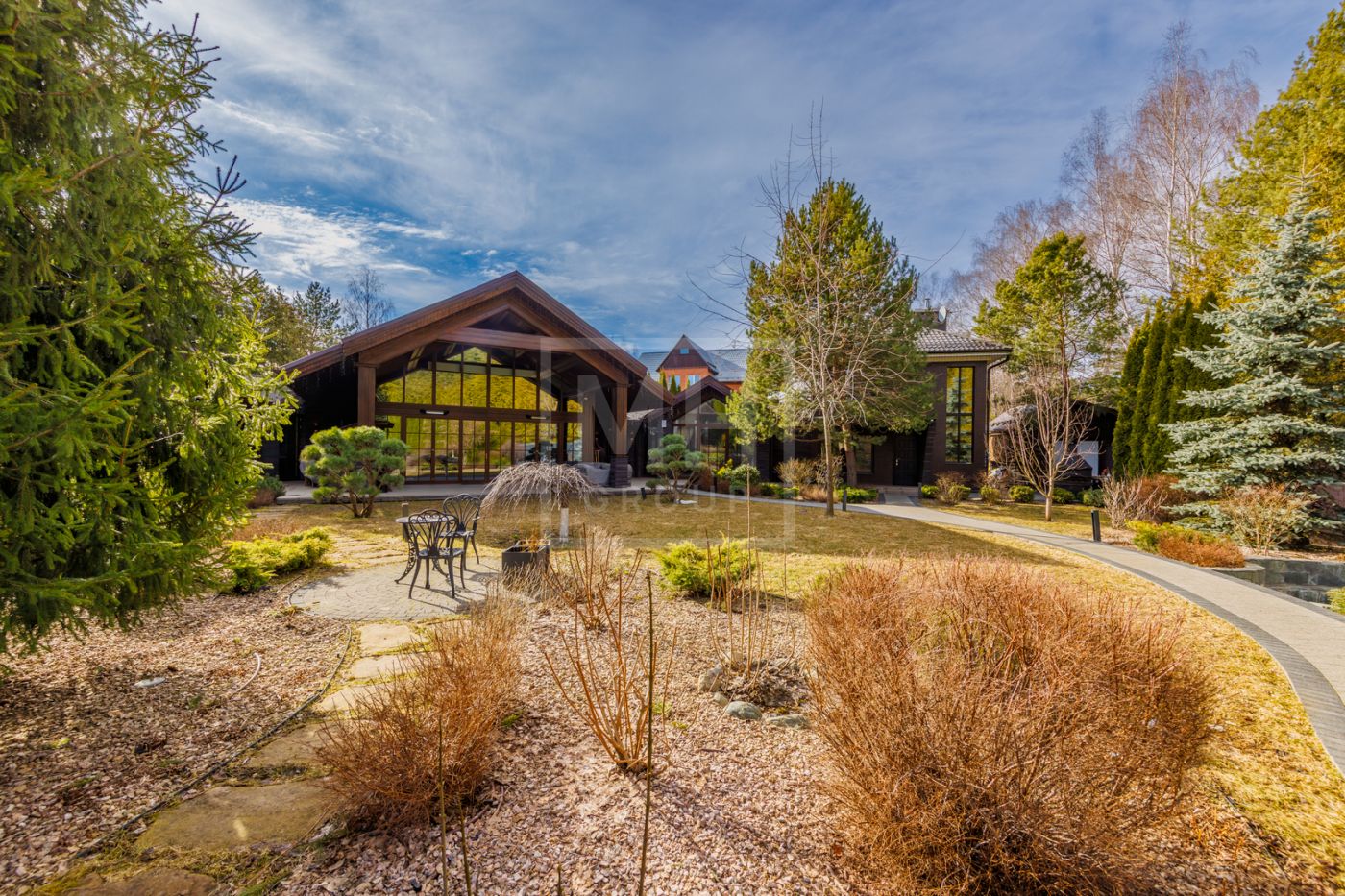 отдыха с камином, массажными креслами и кинозалом. Из основного дома можно перейти в дом-шале, где расположены гостиная, кабинет, большая профессиональная кухня-барбекю с залом для гостей. На участке также