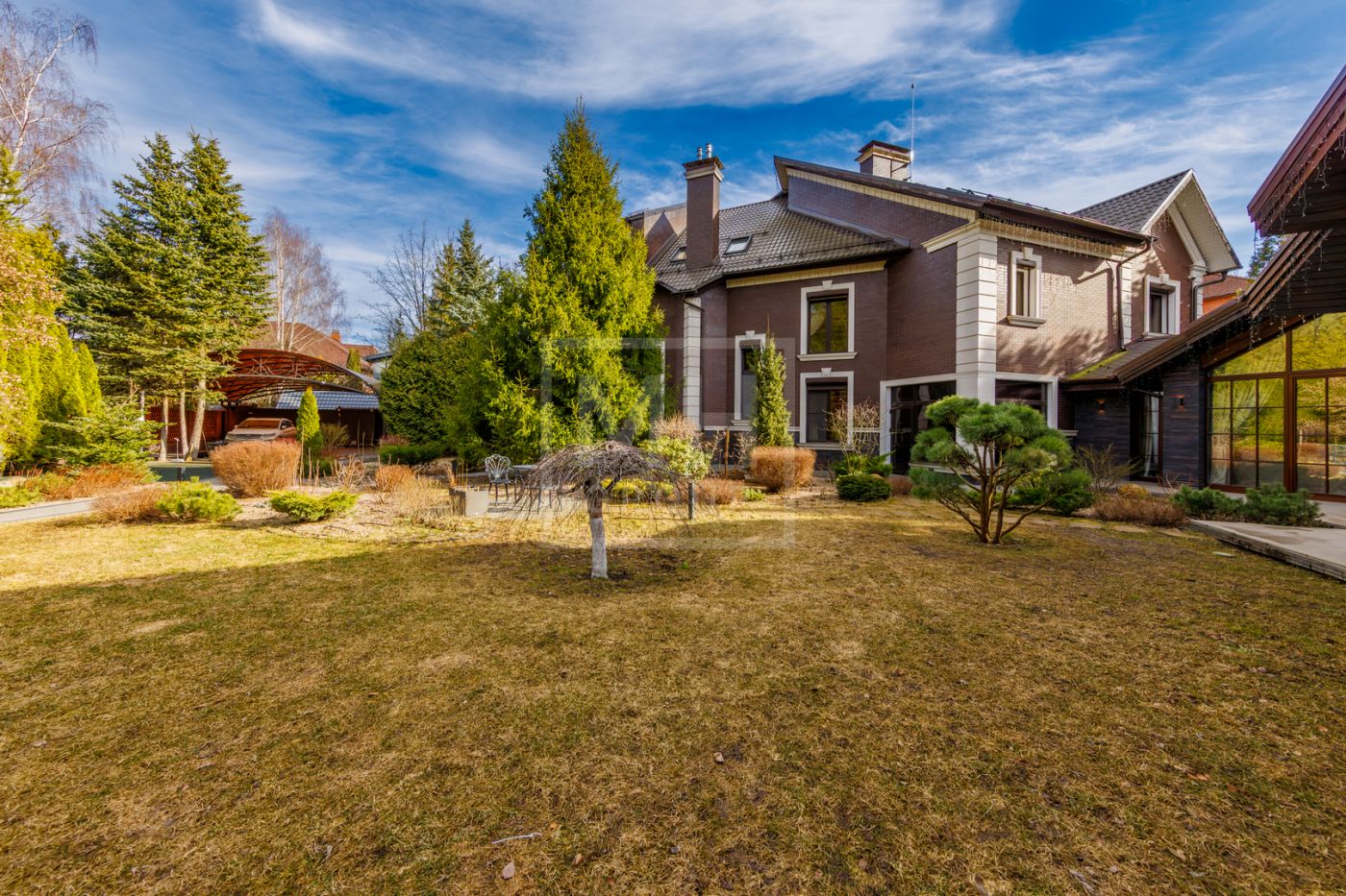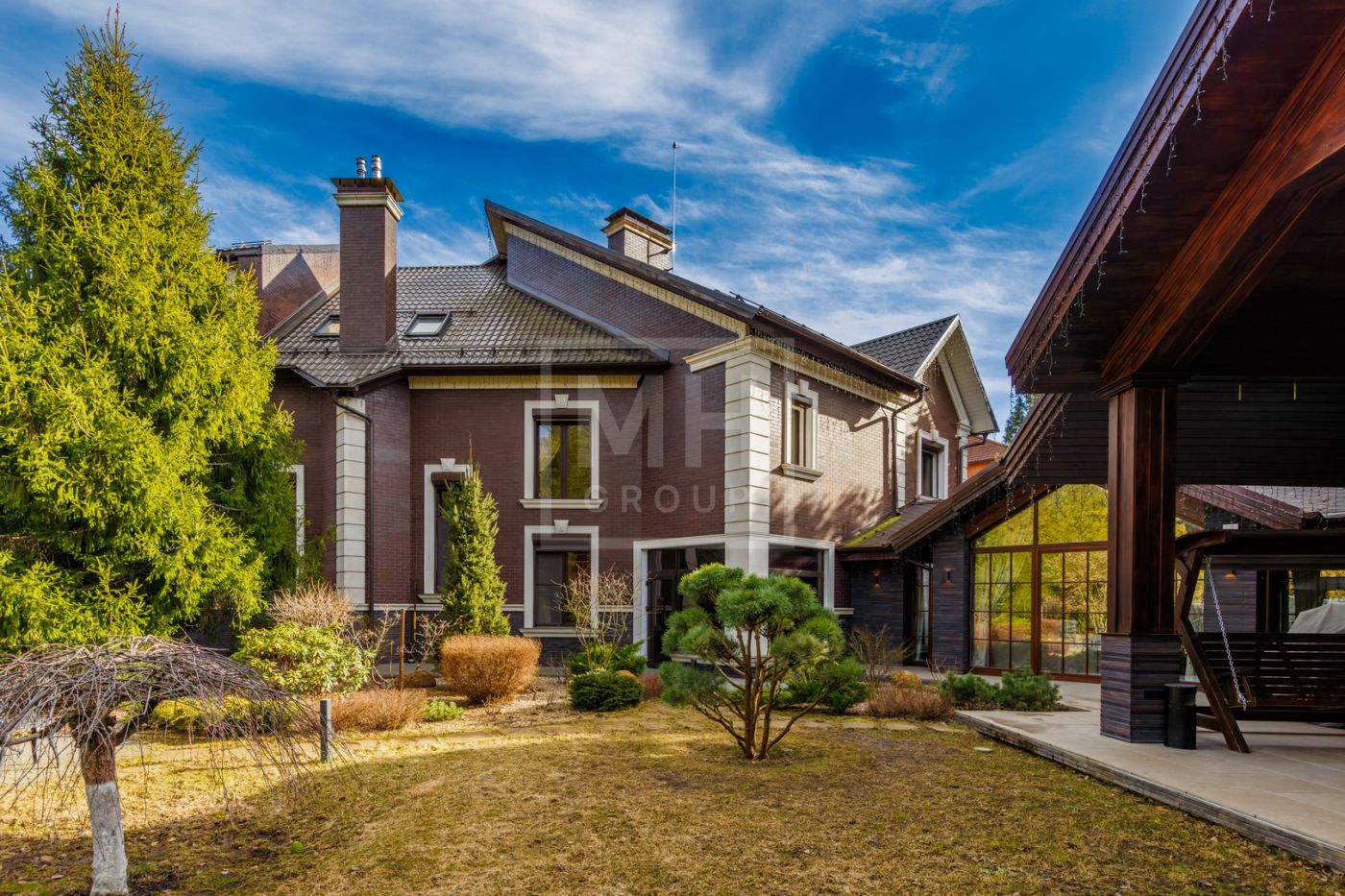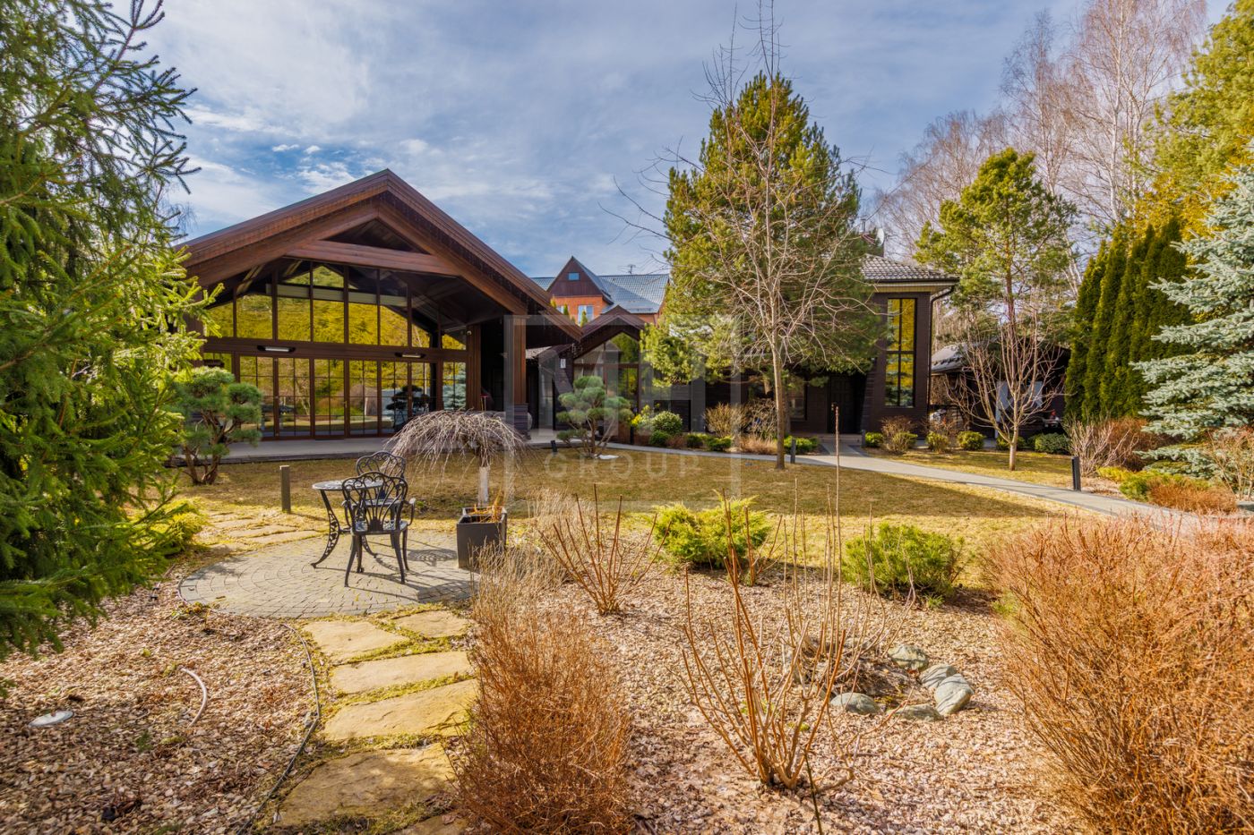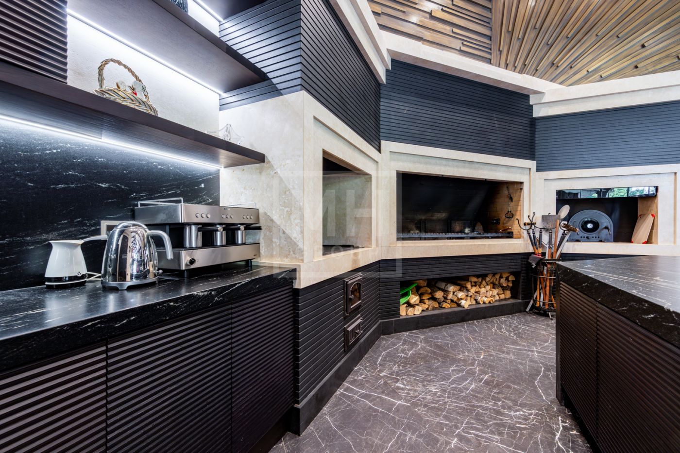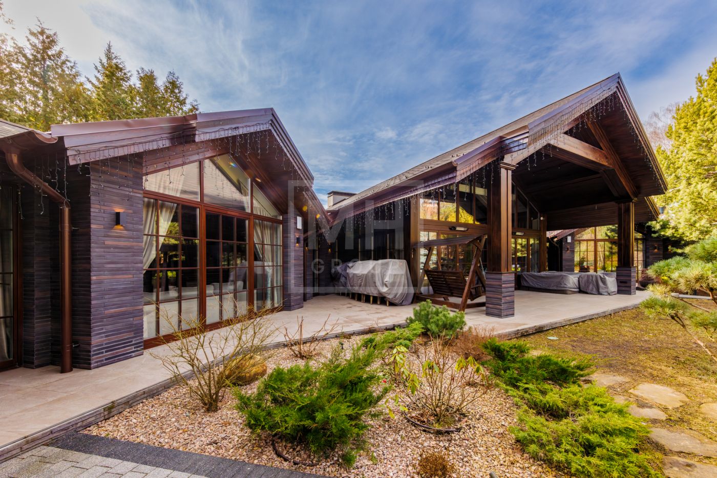 отдыха с камином, массажными креслами и кинозалом. Из основного дома можно перейти в дом-шале, где расположены гостиная, кабинет, большая профессиональная кухня-барбекю с залом для гостей. На участке также