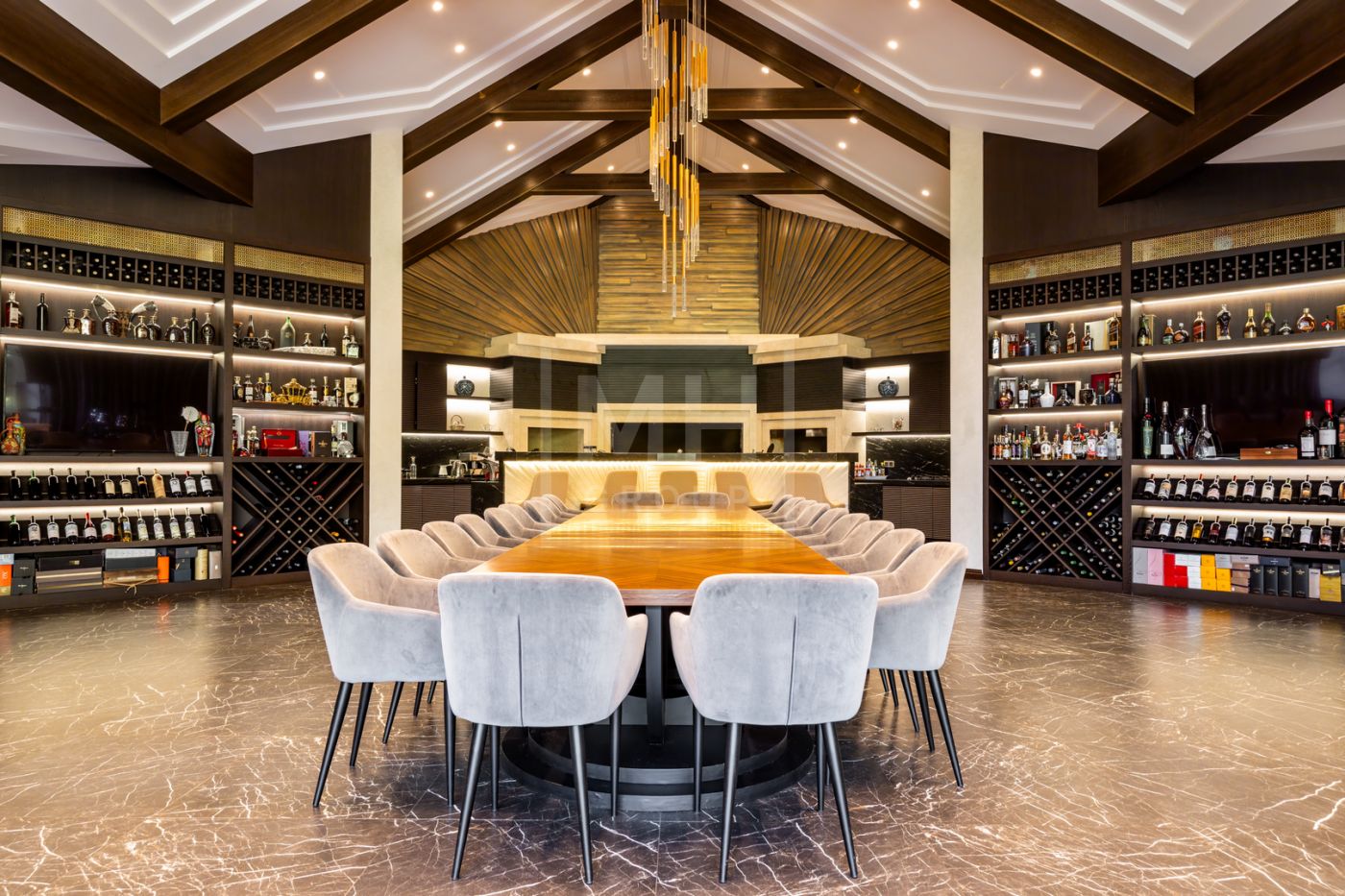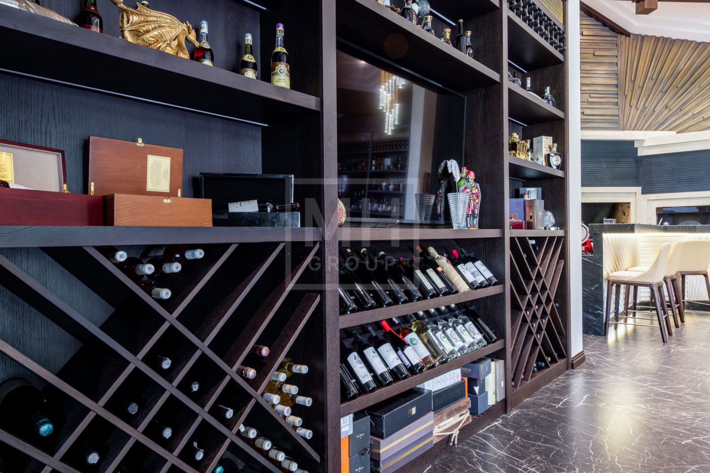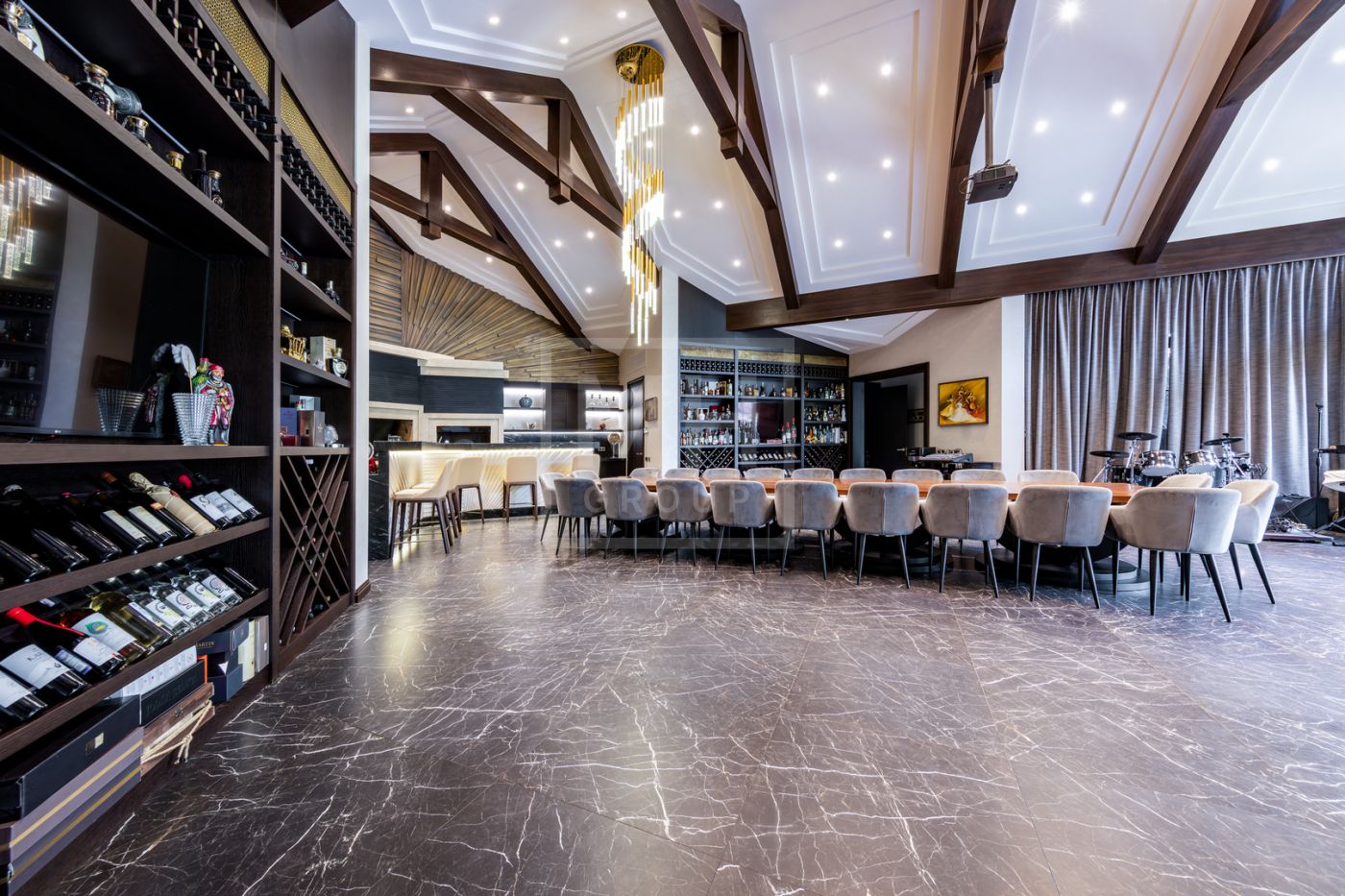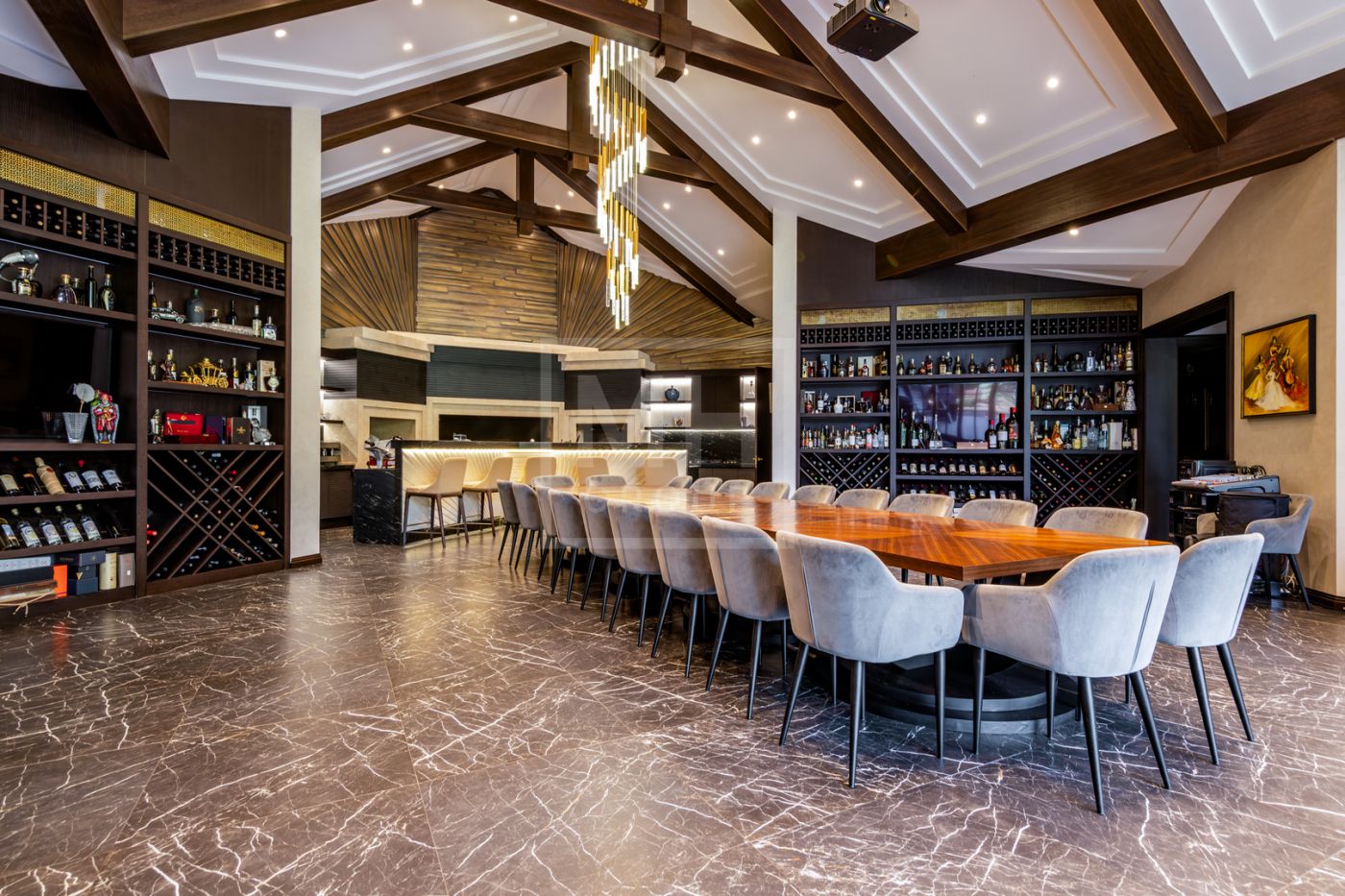 Этаж 3: гостиная с барной стойкой, спальня с с/у, гардеробной, тренажерный зал, чемоданная, серверная.