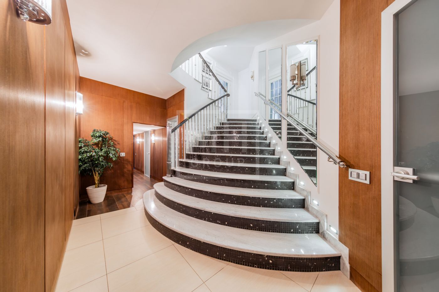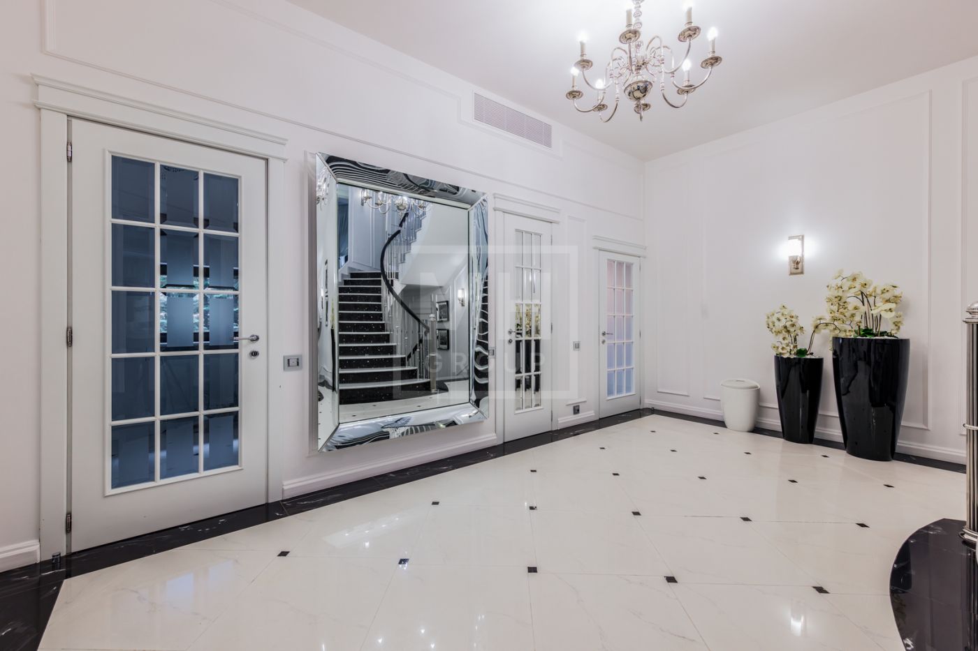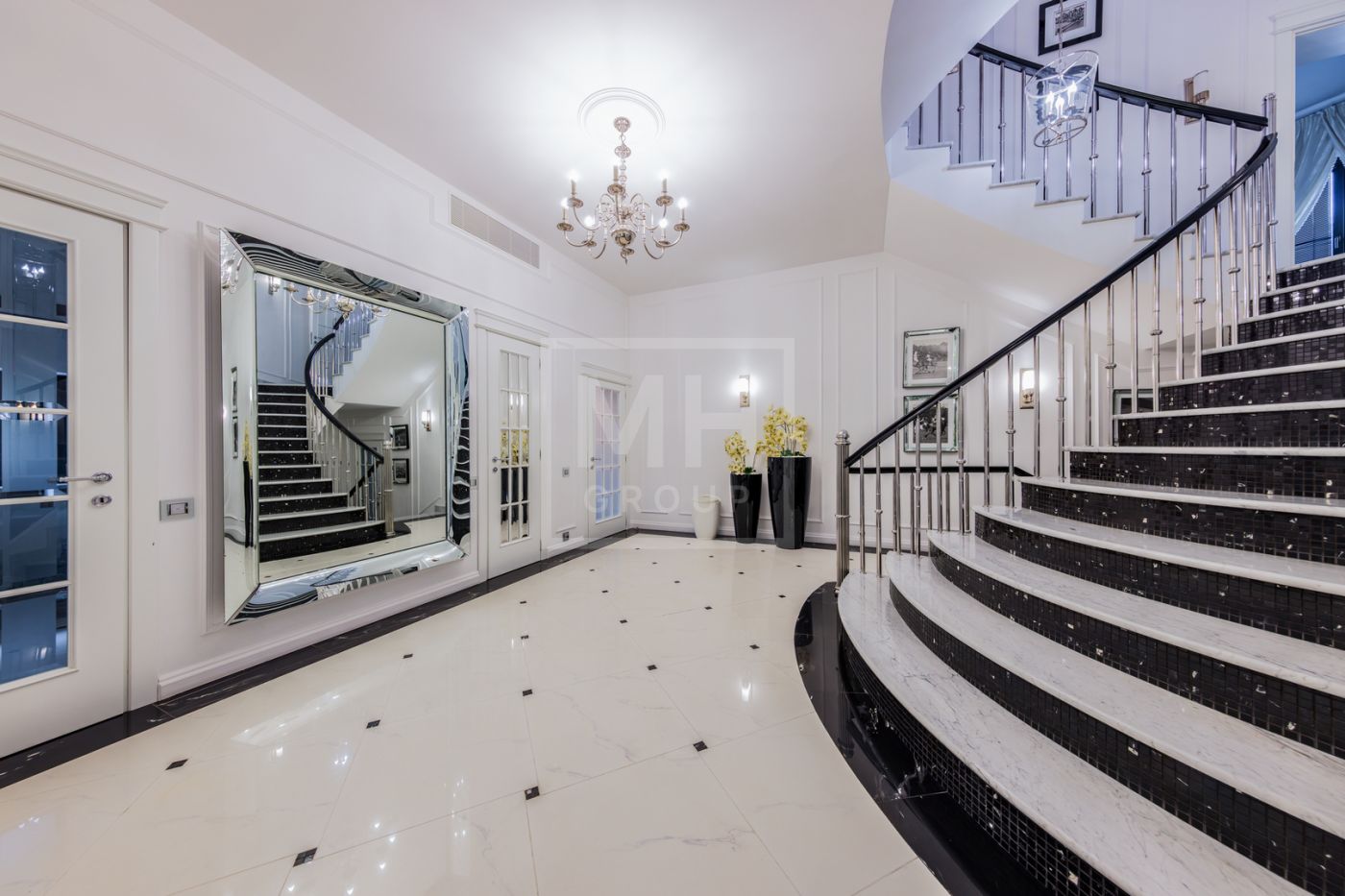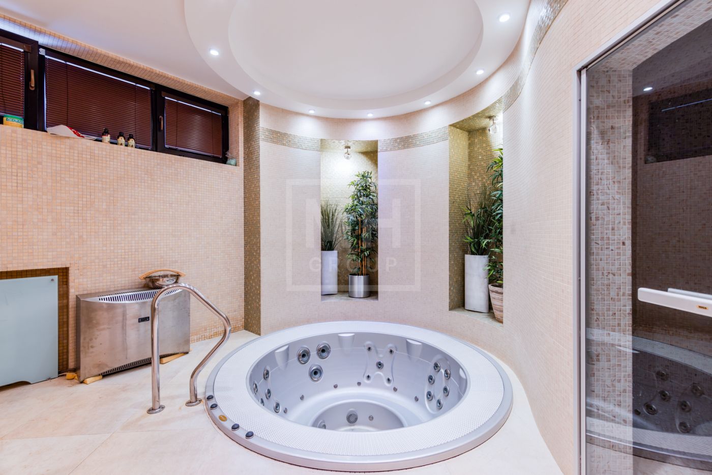 Цоколь: в уровне первого этажа: спа-зона (сауна, хамам), большая зона отдыха с камином, массажными креслами и кинозалом, шубная комната, сезонная гардеробная, профессиональная прачечная, щитовая, вентиляционная,бойлерная, гараж на 2 м/м, душевая, с/у.