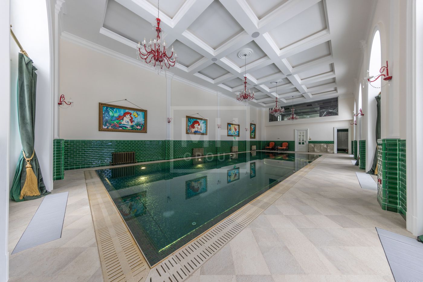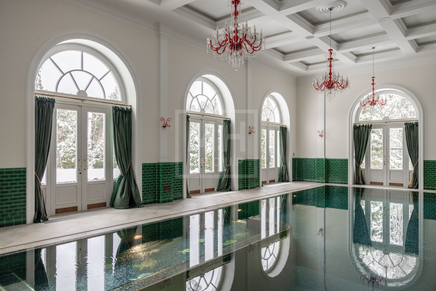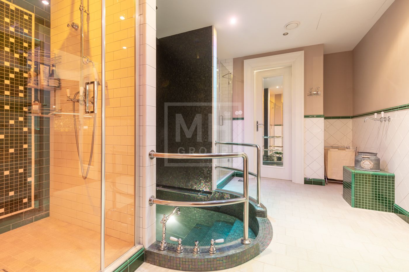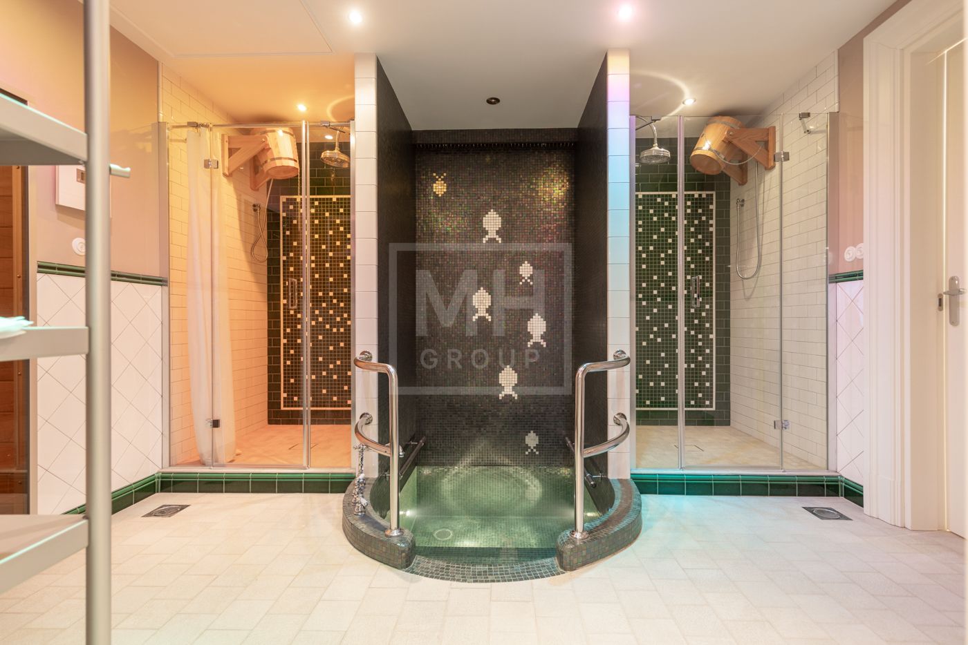 Продуманная планировка включает в себя 7 спален, кабинет, множество мес хранения, а также косметологический кабинет и студию звукозаписи. Для удобства перемещения в доме предусмотрен лифт. Просторная SPA-з с бассейном, сауной, хаммамом, массажным кабинетом и купелью позволяет расслабиться и насладиться уходом за собой. Особое внимание уделено просторной террасе с зоной барбекю и камином, где можно наслаждаться