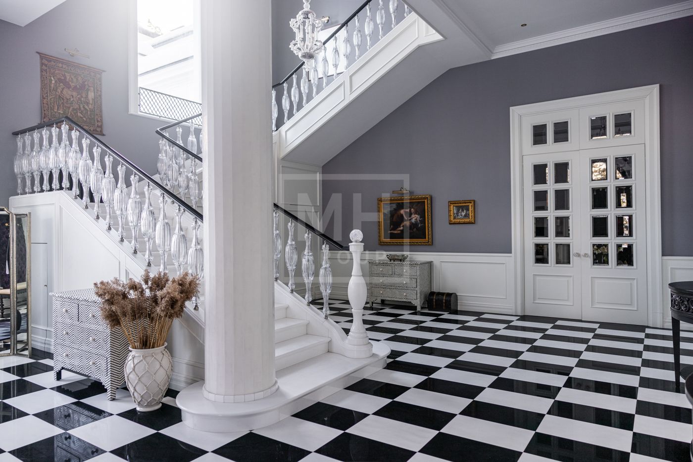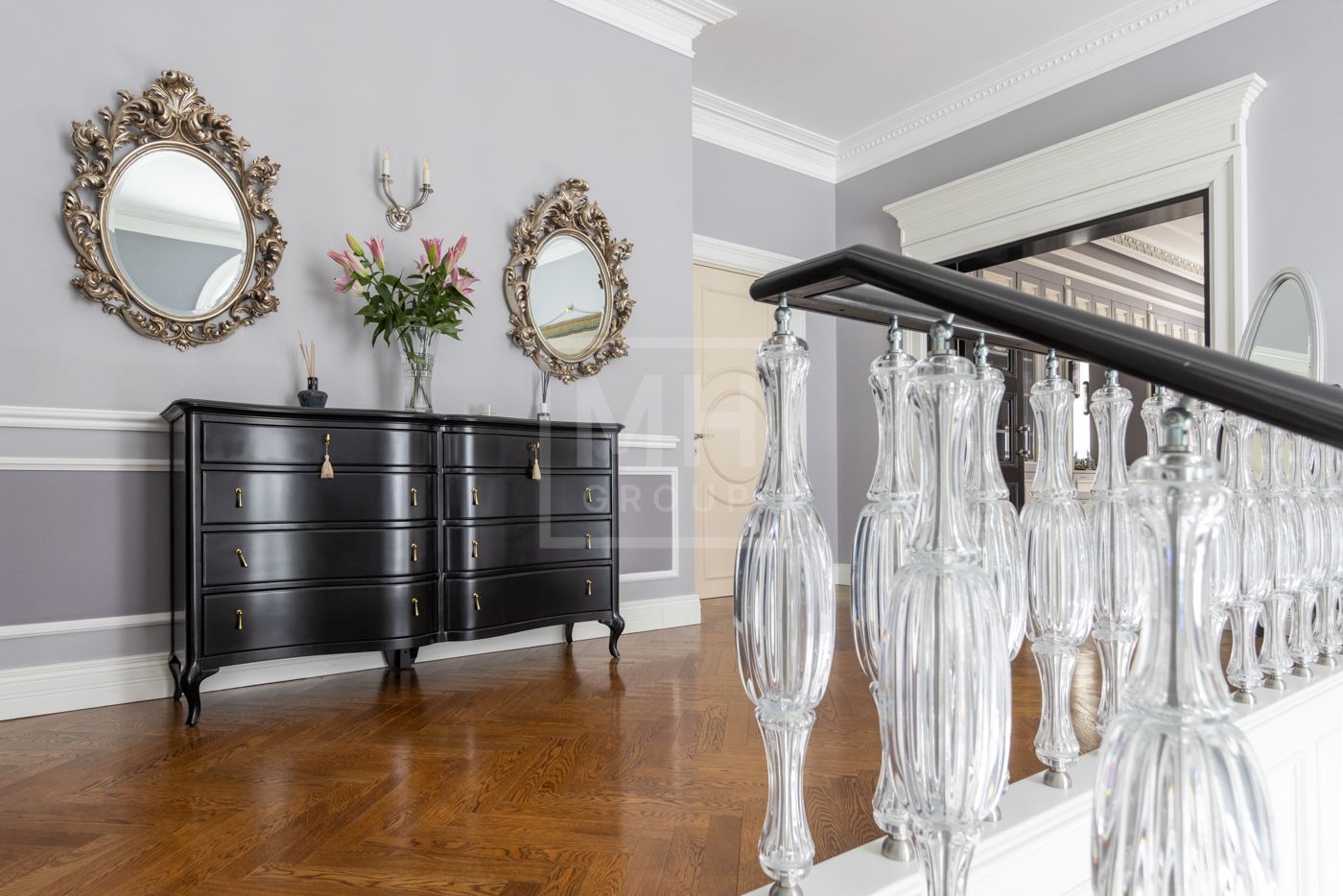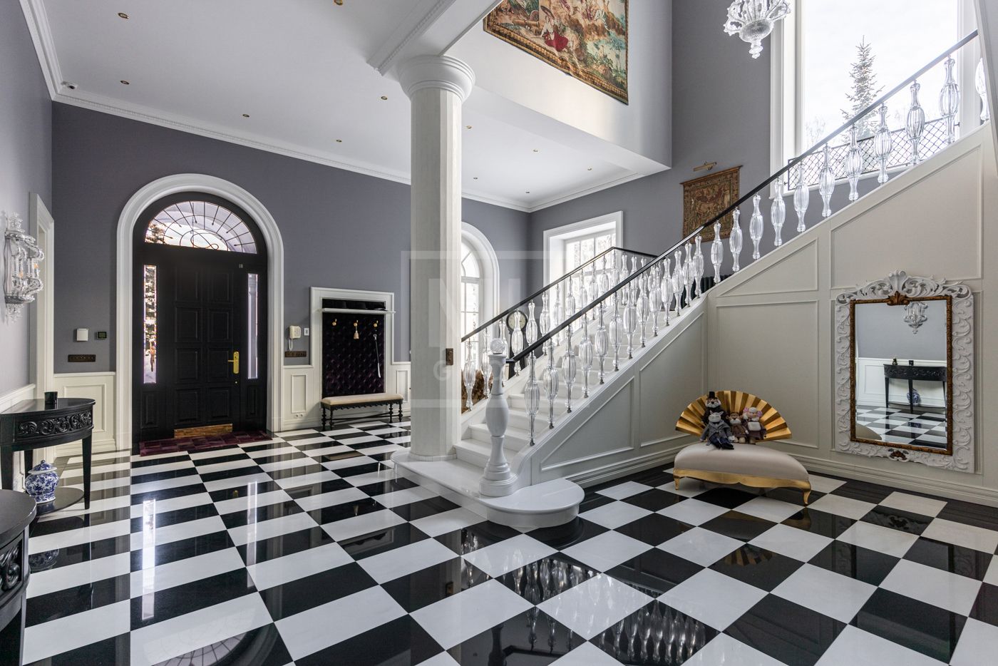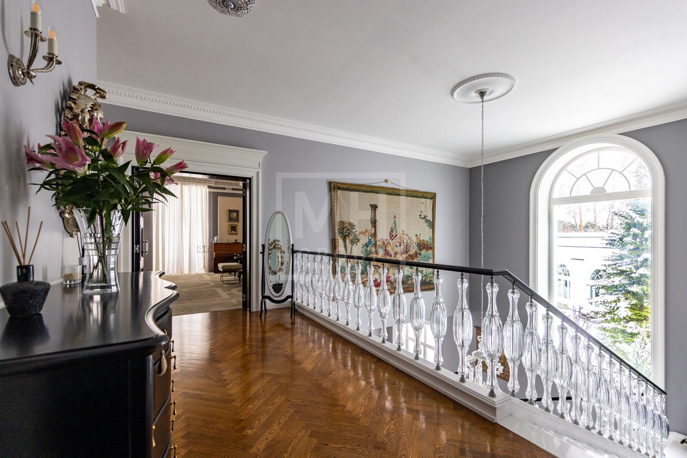 В холле вас встретит роскошная парадная лестница с балясинами из хрусталя, выполненными эксклюзивно для этого дома. Затем мы увидим просторную гостиную со вторым светом и зоной камина, профессиональную кухню с высококлассным оборудованием премиум-класса.