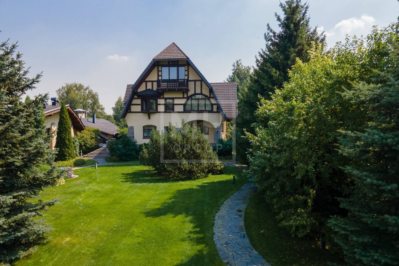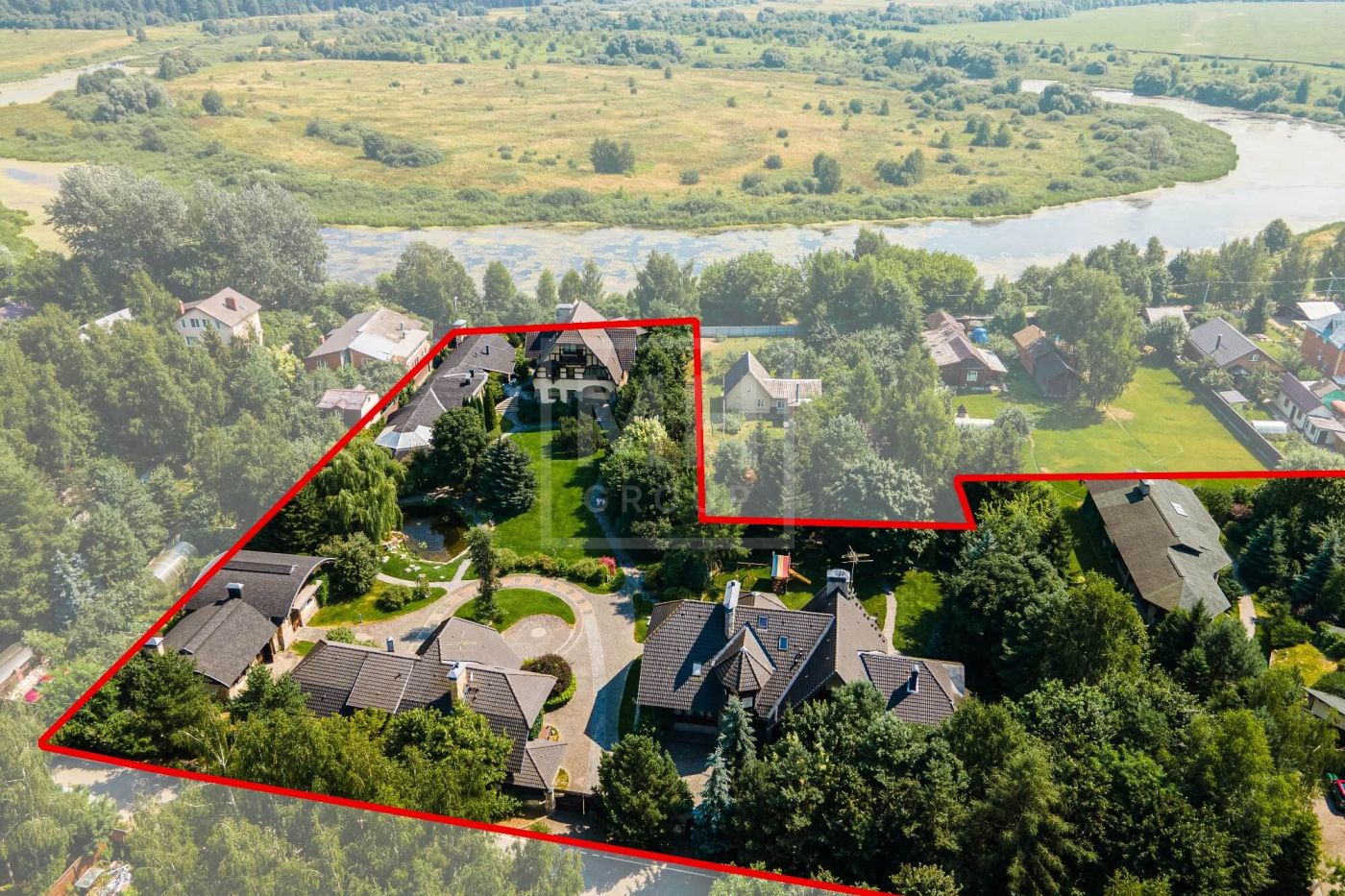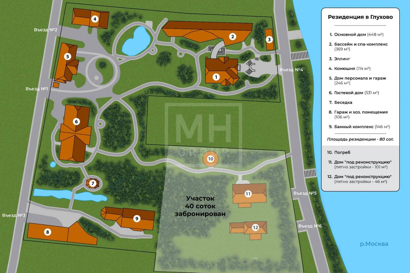 Усадебный комплекс состоит из 7-ми строений: главный дом (448 кв.м) соединен подземным переходом с бассейном (369 кв.м), гостевой дом (531 кв.м), банный комплекс (146 кв.м), дом персонала на 2 этаже и гараж (246 кв.м), будка охраны на въезде, конюшня (114 кв.м), хозяйственная постройка с гаражом (106 кв.м).