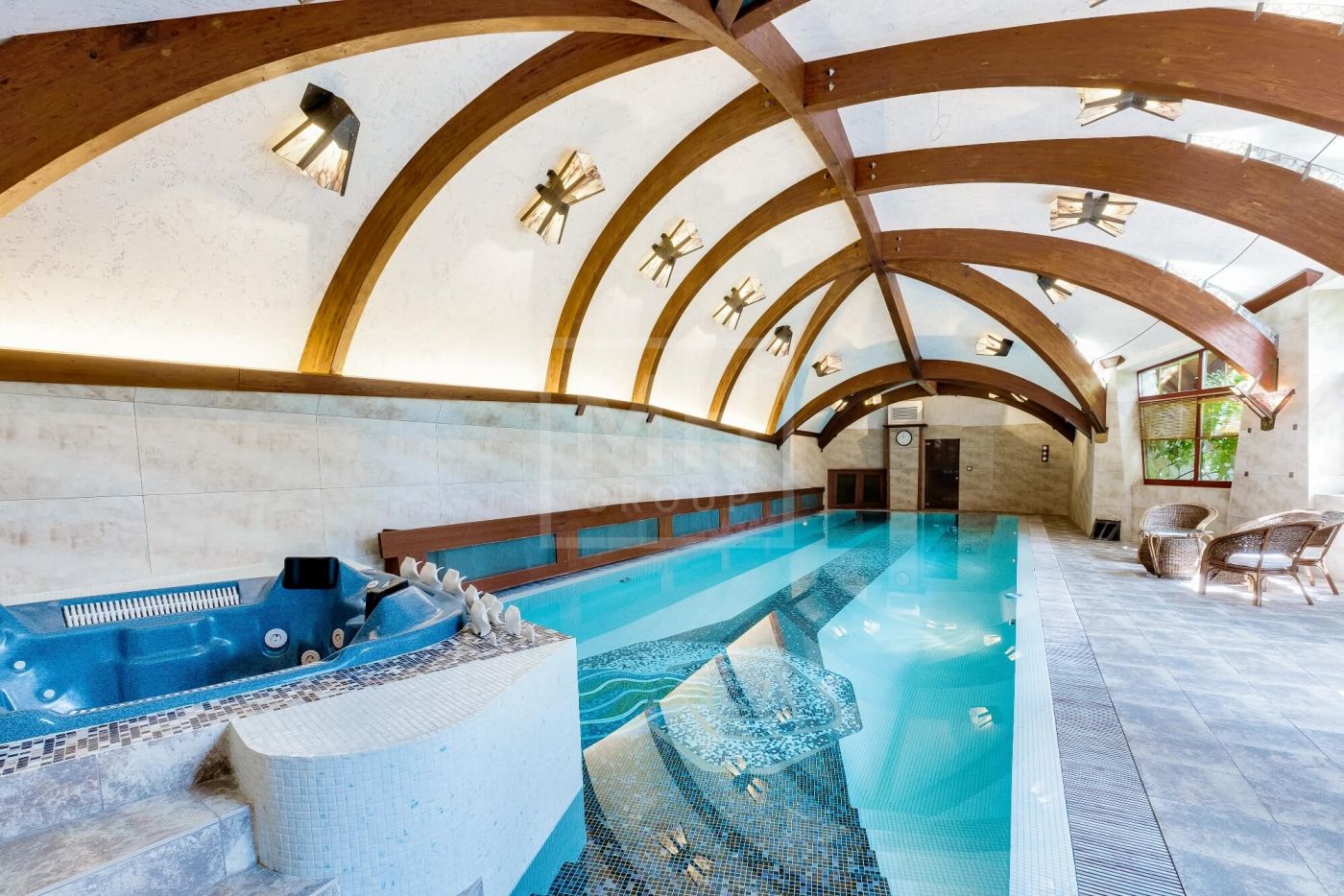 Изюминкой комплекса является бассейн 17х5 м! со сводчатым потолком из клееных балок и подземным проходом в основной дом. Общая площадь бассейна 369 кв.м, в неё так же входят: зимний сад, финская сауна, хамам, комната отдыха т.д.