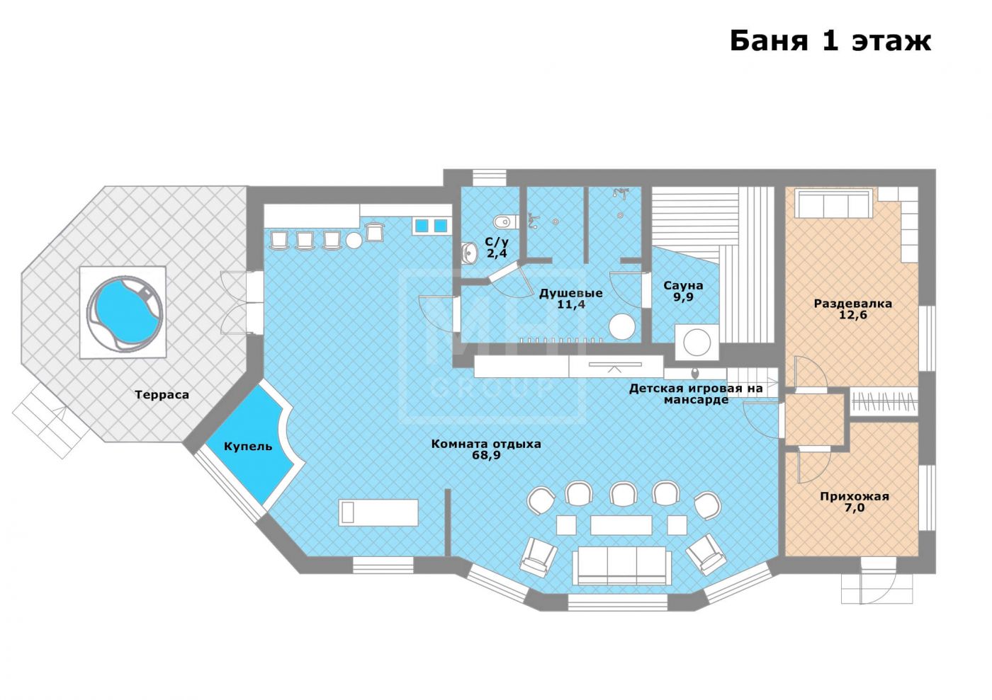 Баня 146 кв.м (русская парная, просторная комната отдыха с камином, крытое патио).