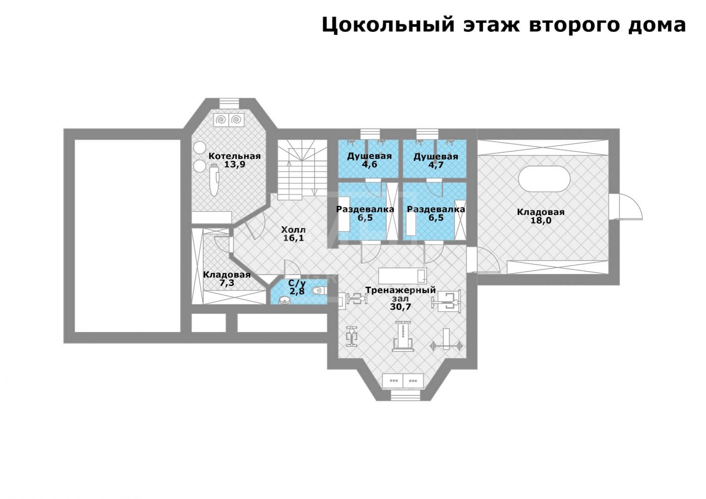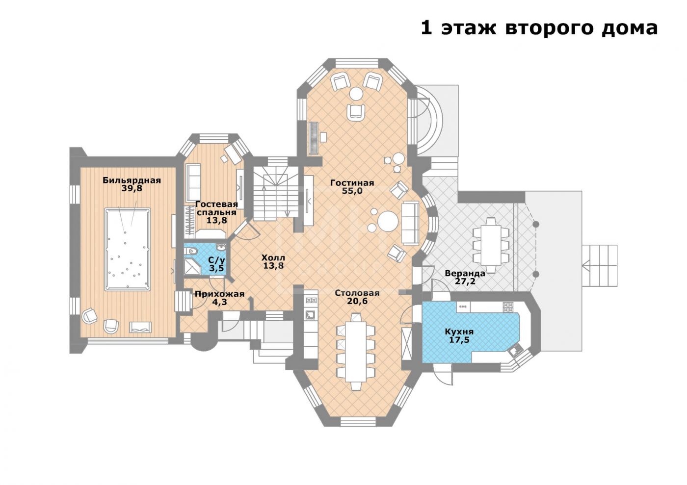 Гостевой дом 531 кв.м (тренажёрный зал, бильярдная, кухня, столовая-гостиная имеют выходы на большое крытое патио, библиотека, 3 спальни, кабинет).