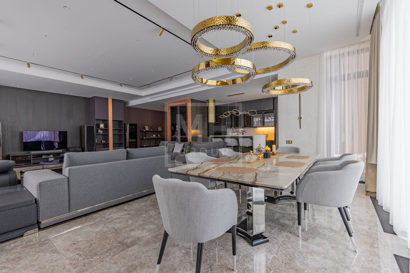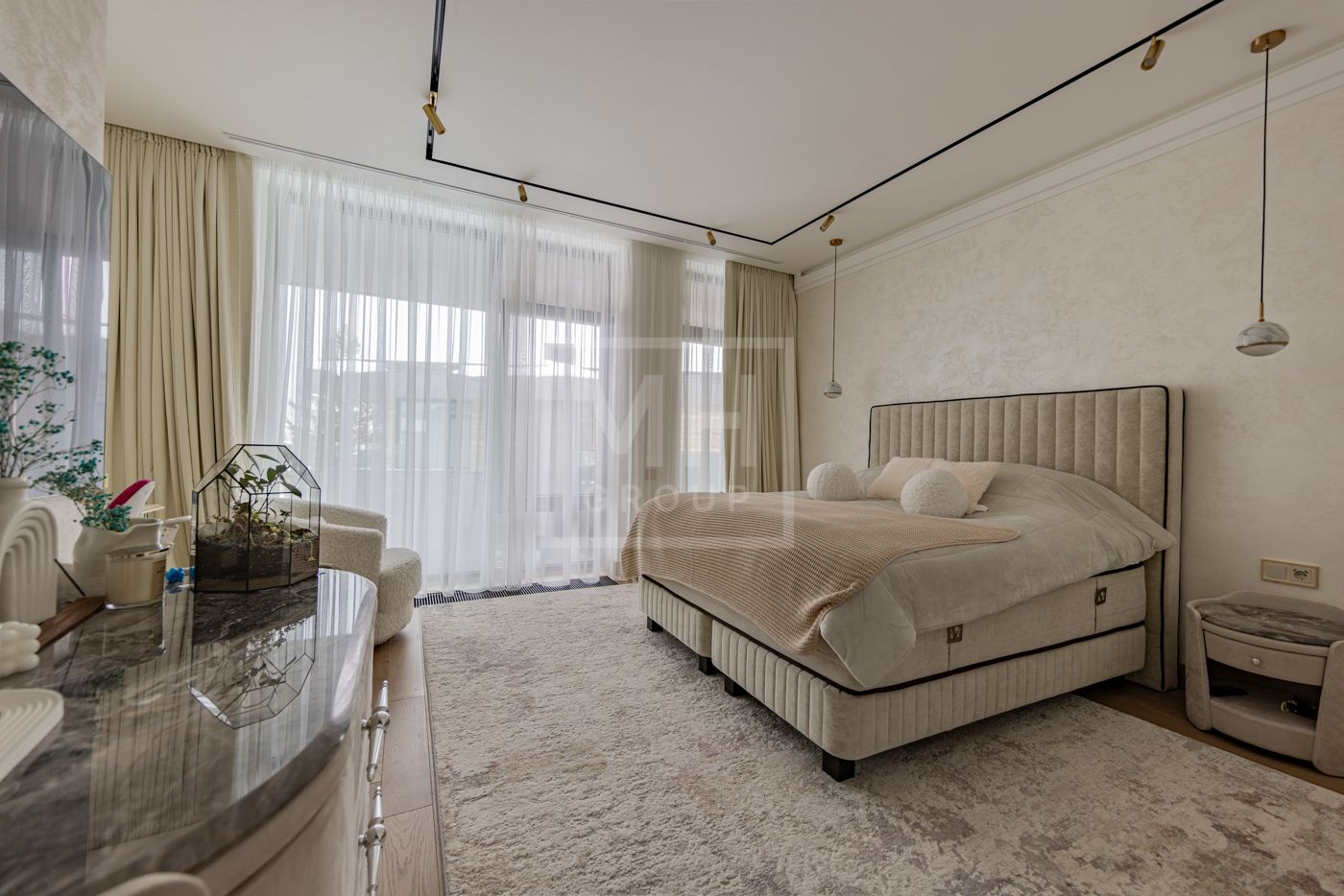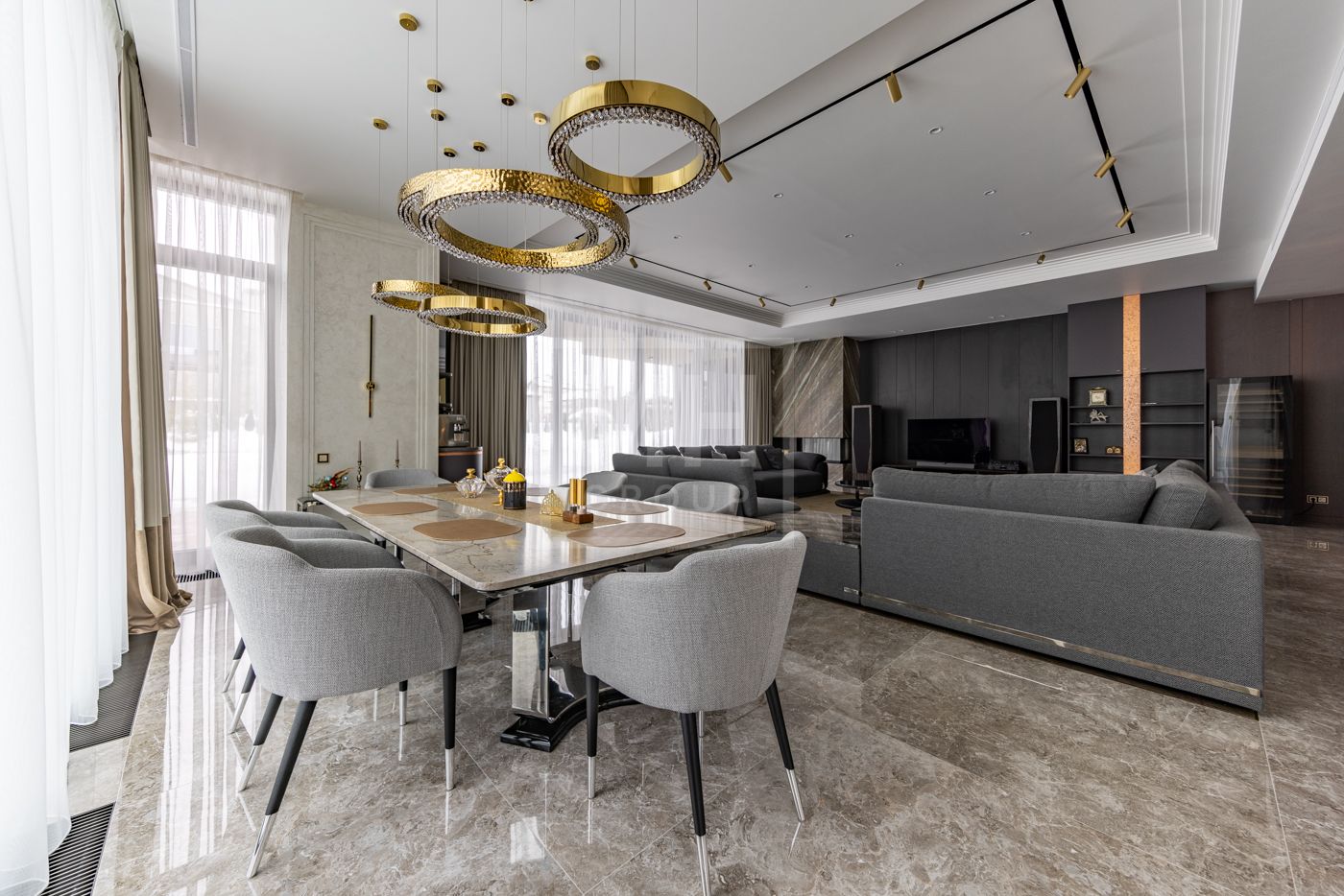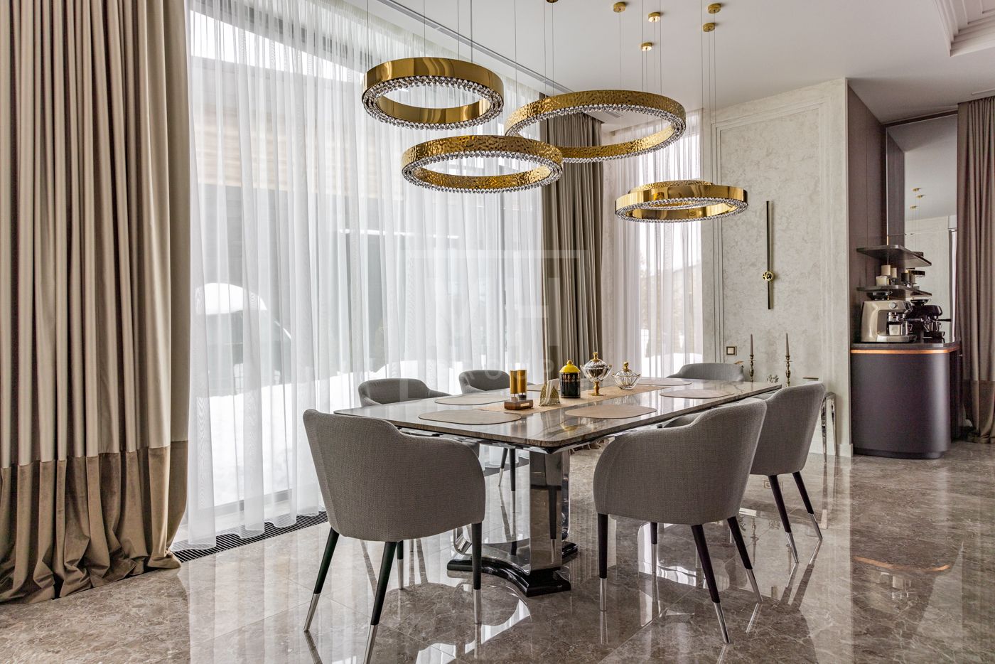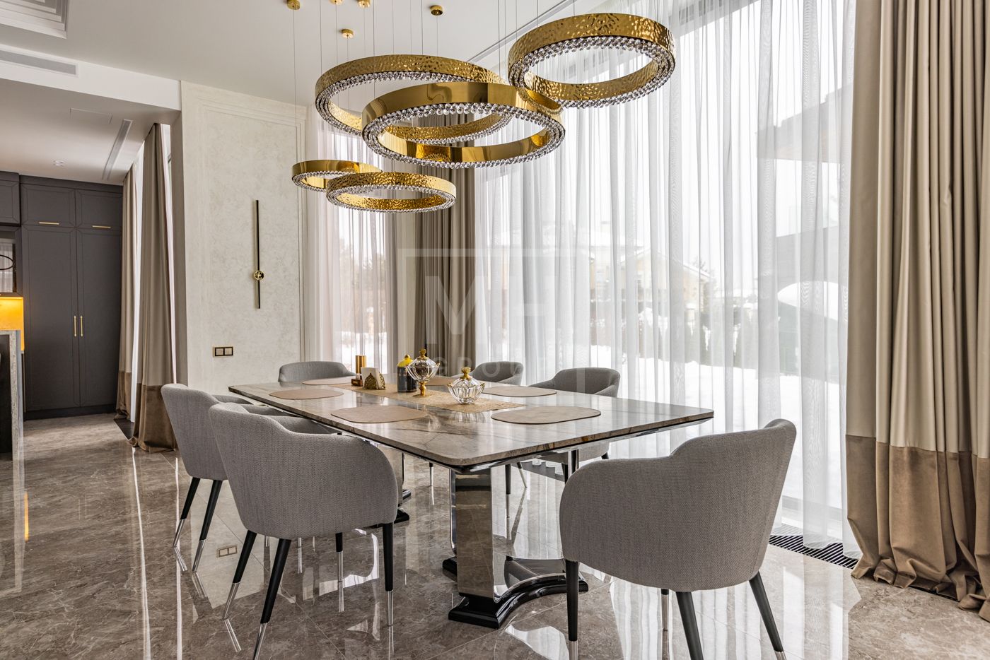 Роскошный новый современный дом, под ключ с мебелью, мебель во всем доме от ведущих производителей. Кухня европейского производства полностью укомплектована встроенной бытовой техникой. В отделке интерьеров качественные материалы. В гостиной камин, облицованный мрамором. Главная мастер спальня с с/у и просторной гардеробной. Интерьер дополняют: дизайнерская мебель европейского производства, премиальный текстиль на окнах, картины.