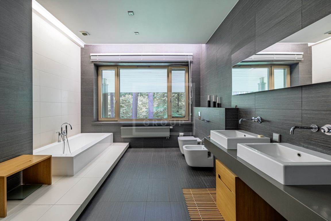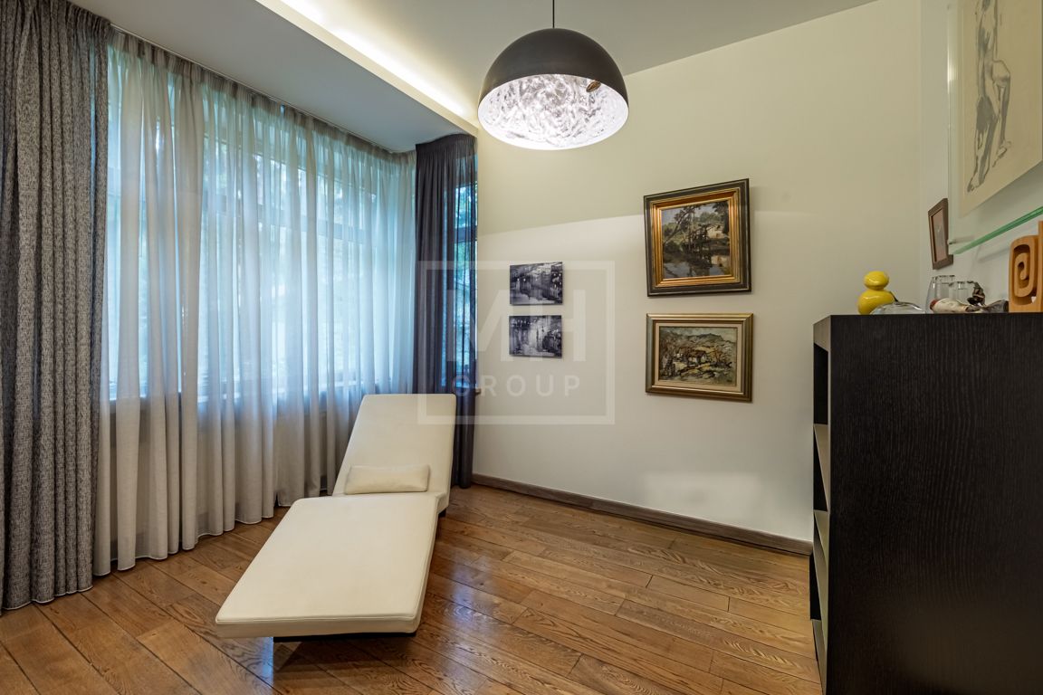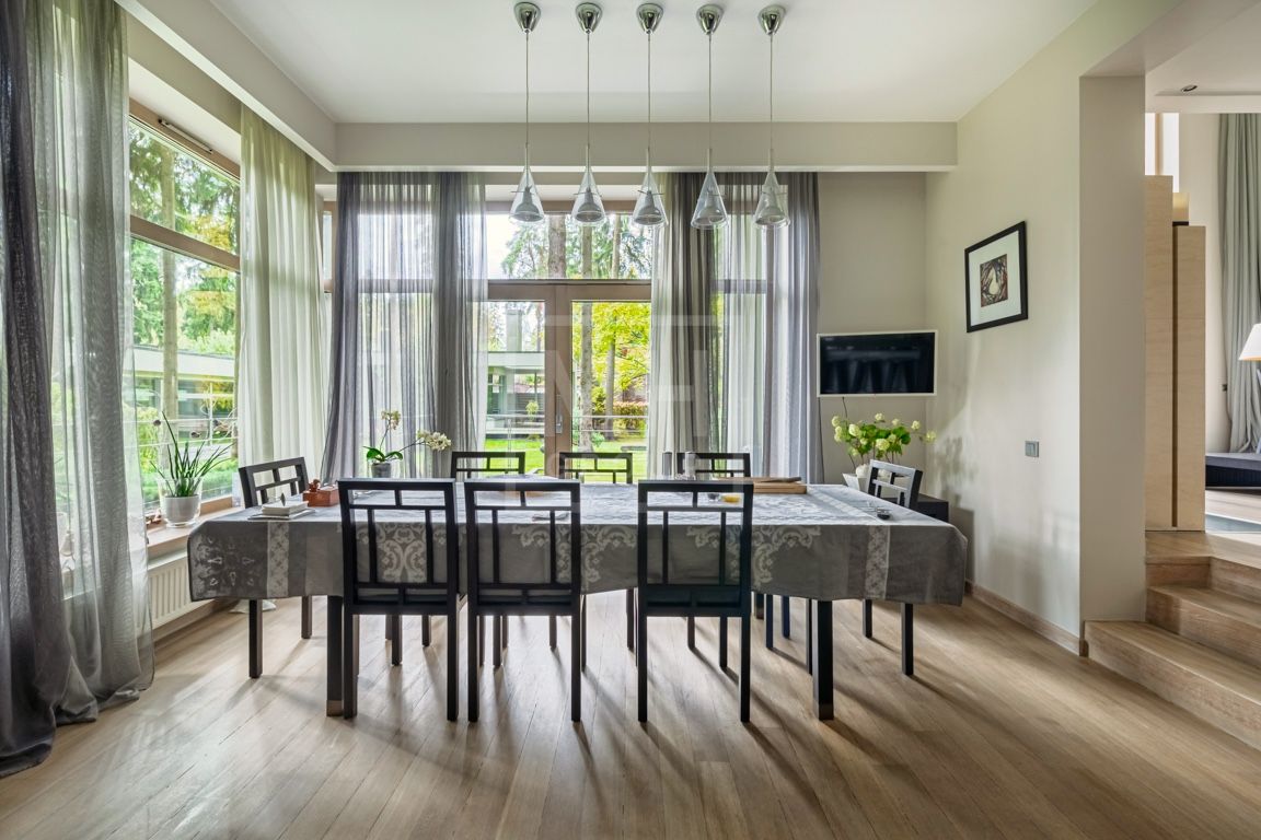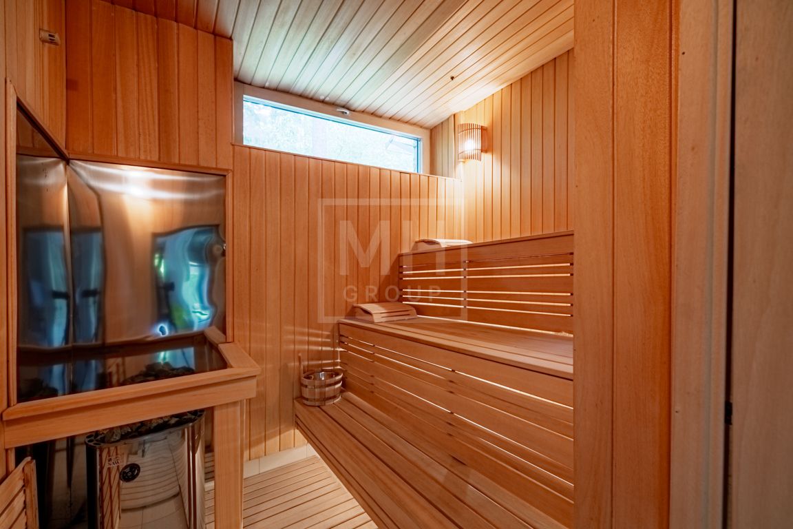 Этаж 1: коридор с лампомойкой, гостиная с камином и вторым светом, кухня-столовая с выходом на террасу, кабинет/спальня, гостевой с/у, спортзал с выходом на участок, сауна, хамам, душевая, с/у, кладовая.