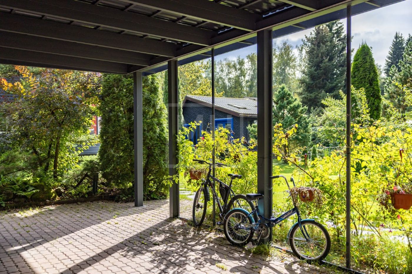 К дому примыкает просторная, частично крытая терраса (50 м2), с зоной-барбекю и релакс-пространством с гидромассажным спа. Терраса соединяет основной дом с гостевым домом-мастерской, стильным и функциональным строением (40 м2), где логично расположились сразу несколько зон: мастерская, зона отдыха/кинозал, спа с сауной и душевой, спальная зона.