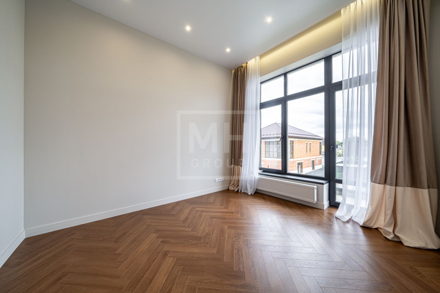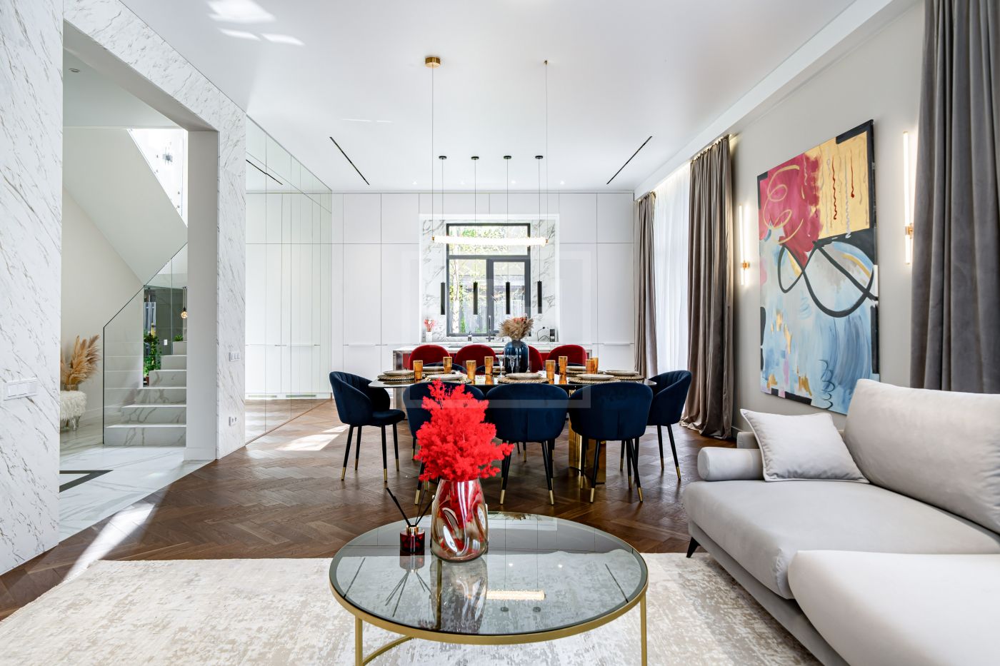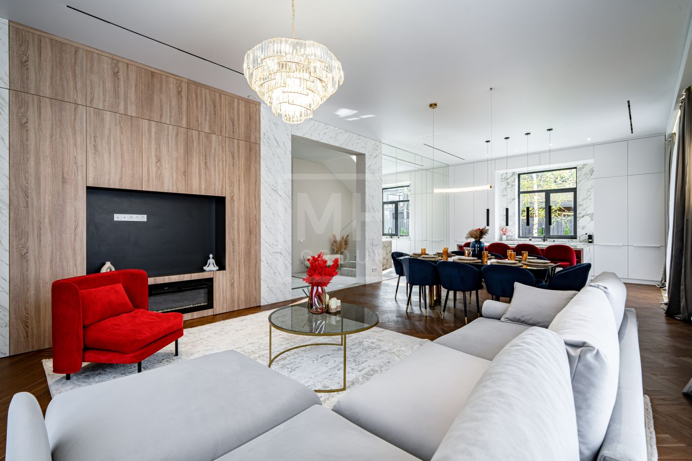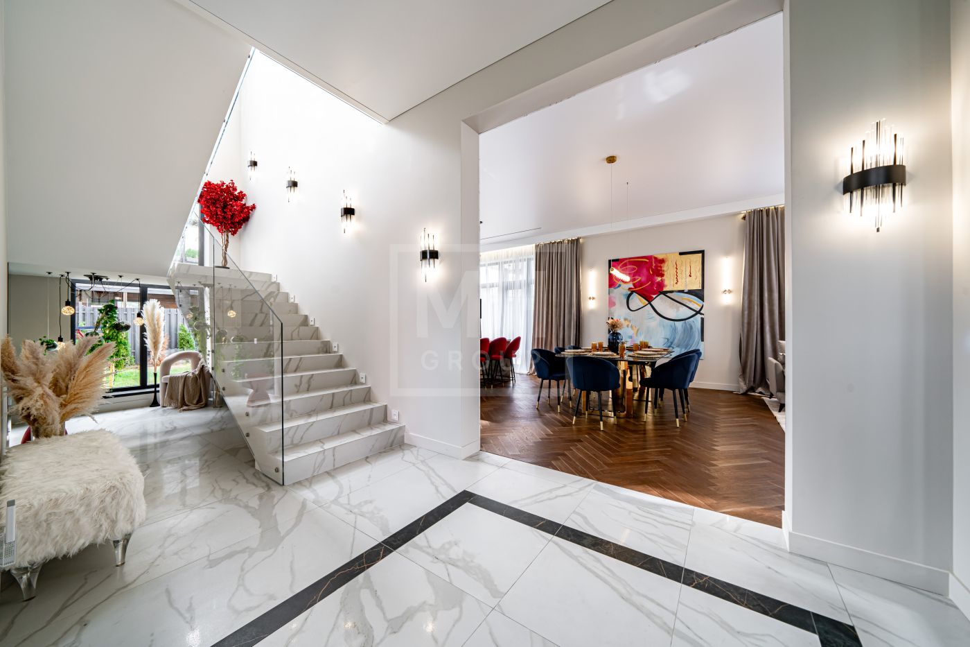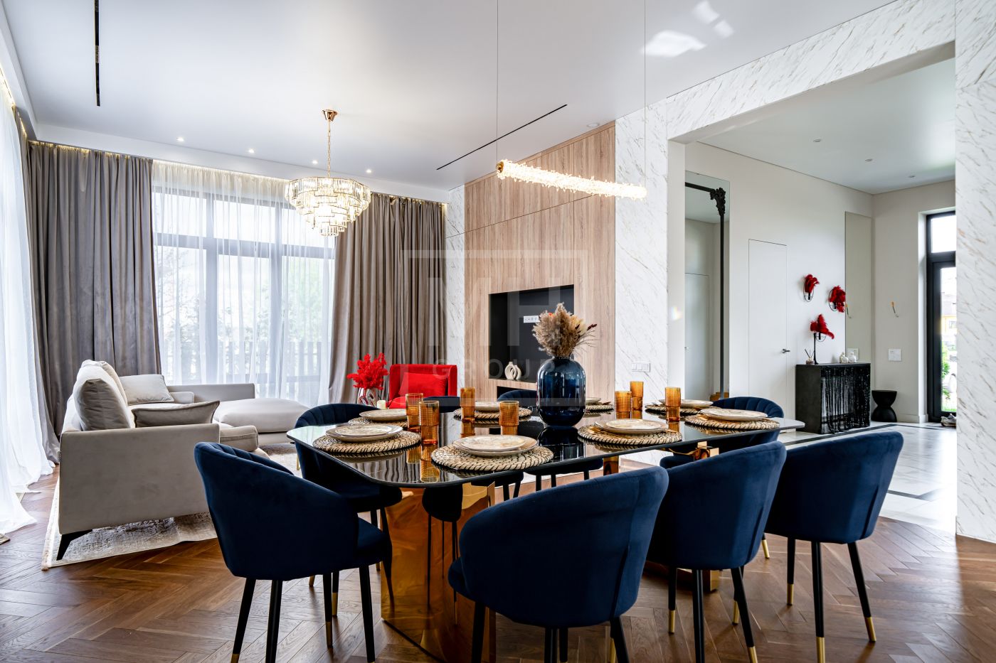 Загородный дом в современном стиле, расположенный в коттеджном поселке «Павловы озера», представляет собой гармоничное сочетание функциональности и изысканного дизайна. Проект площадью 310 м², расположенный на участке 6,5 соток, предлагает комфортную загородную жизнь всего в 14 км от Новорижского шоссе.Двухэтажный дом с плоской кровлей выполнен с дизайнерской отделкой «под ключ» и полностью меблирован. Планировка продумана для максимального удобства: просторная гостиная-столовая, стильная кухня, оснащенная современной бытовой техникой, пять уютных спален, включая мастер-спальню с индивидуальной гардеробной зоной, а также кабинет для работы. Большие панорамные окна обеспечивают естественное освещение на протяжении всего дня, создавая атмосферу тепла и уюта даже в пасмурную погоду. Этот дом идеально подойдет для тех, кто ищет современный и функциональный вариант загородного жилья с комфортной близостью