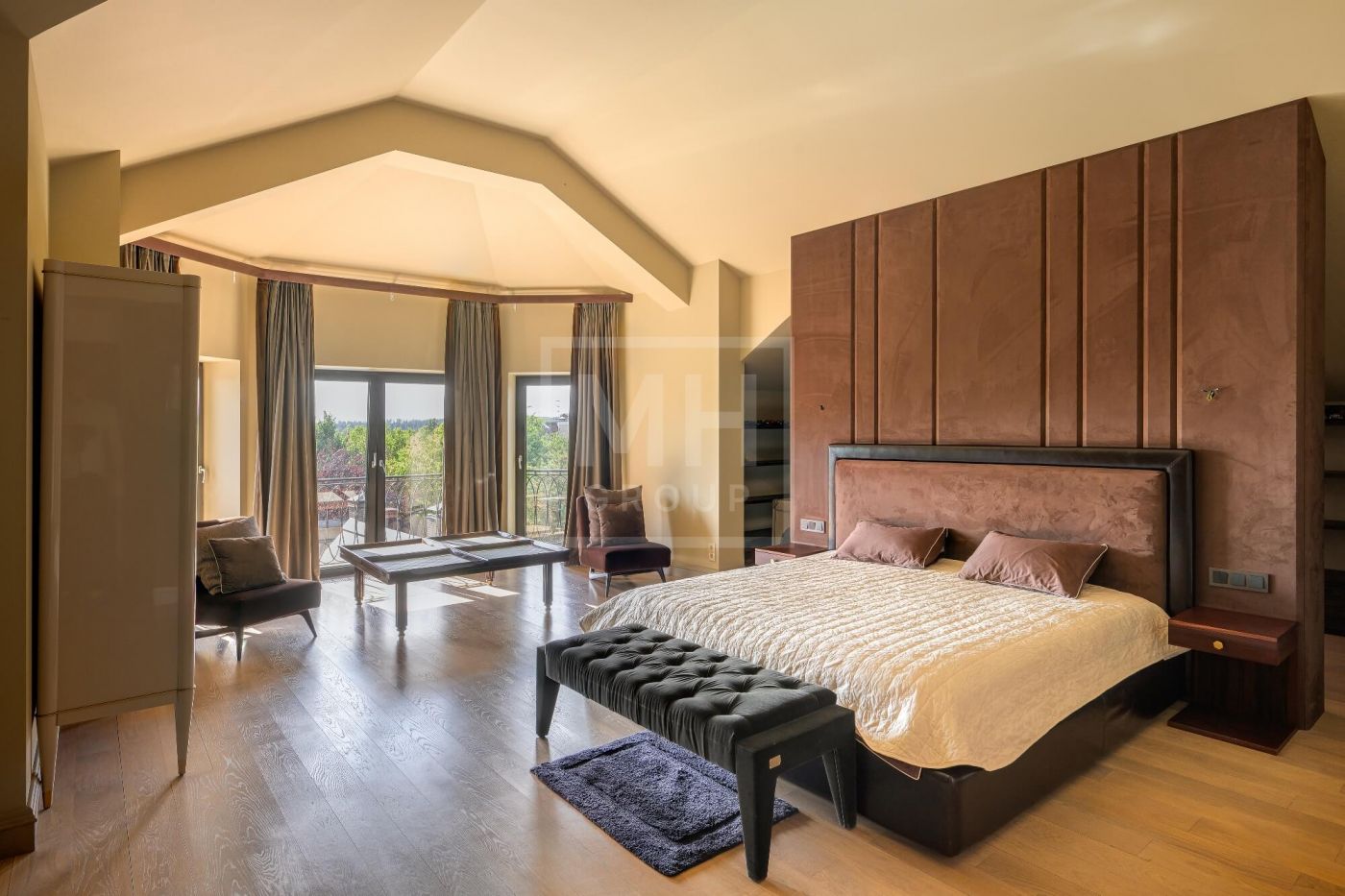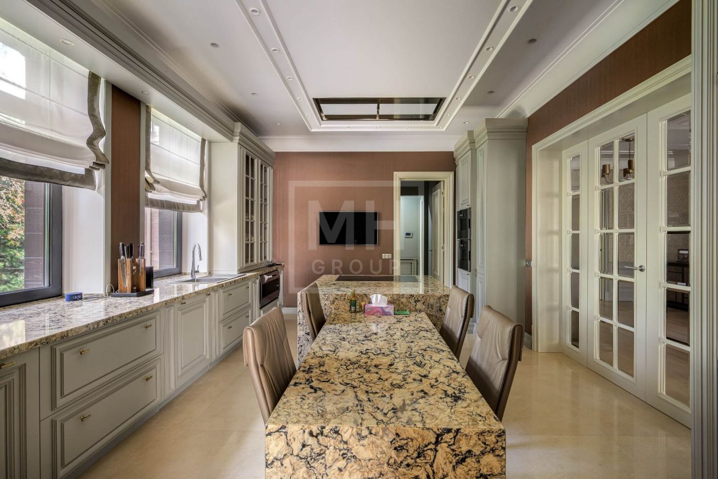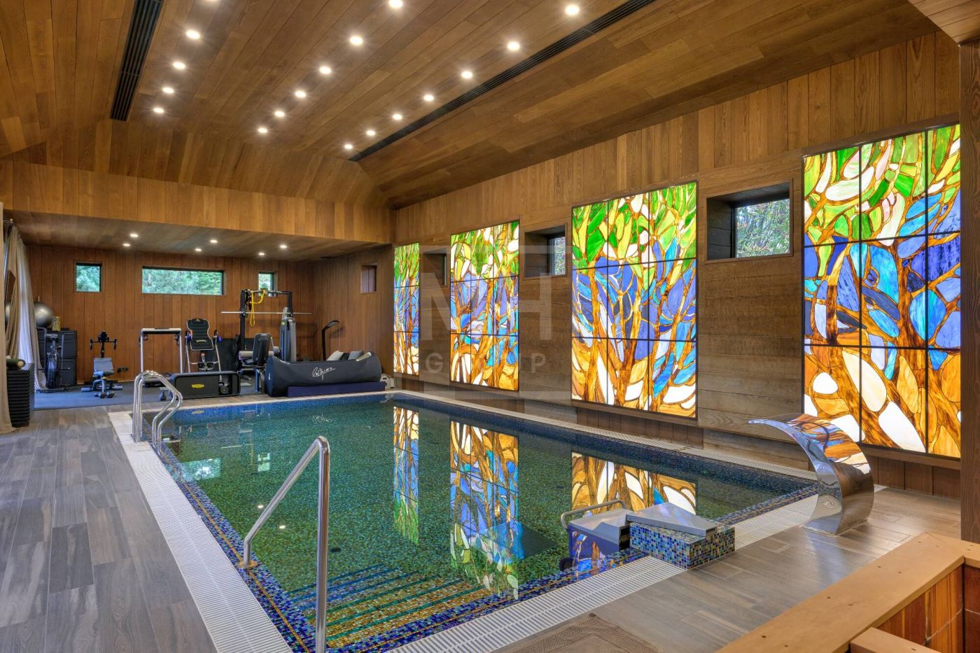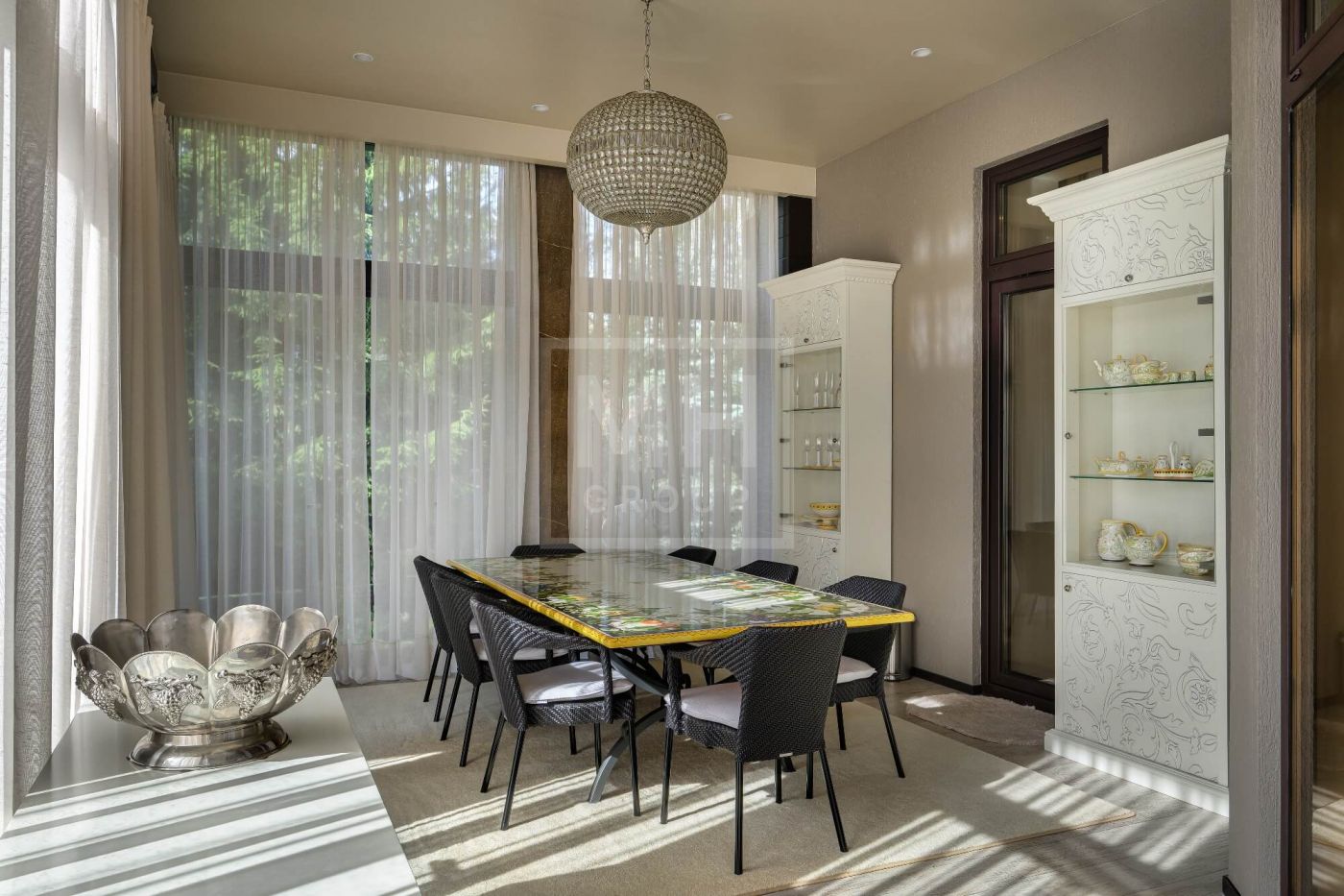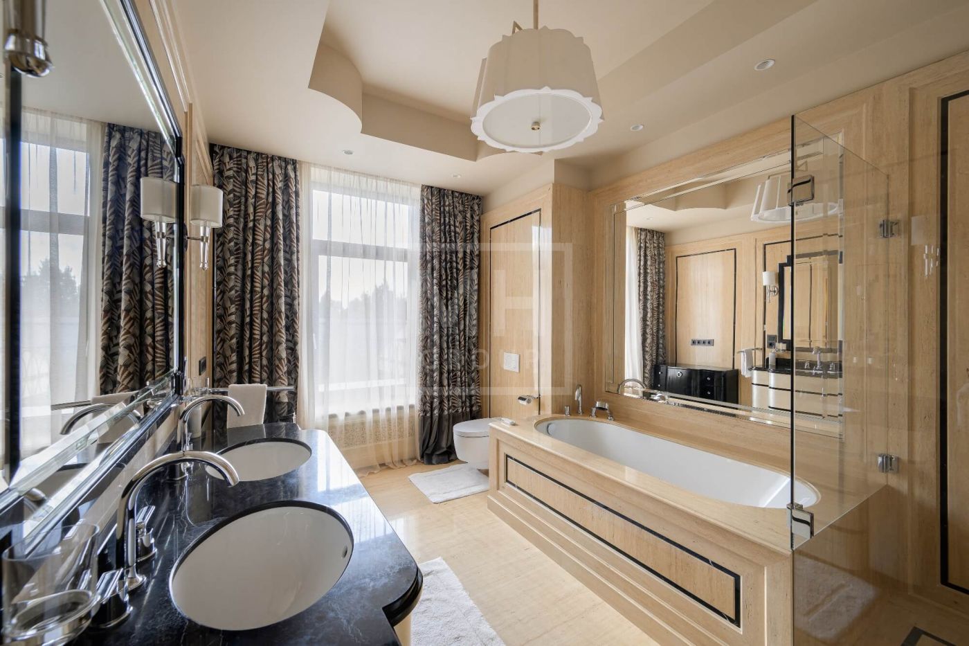 В доме: 5 спален, гостиная с камином, крытая летняя терраса, столовая и кухня кабинет, бассейн, сауна, хаммам, два гаража на 6 м/м, оружейная, постирочная, блок персонала, кладовые и технические помещения.