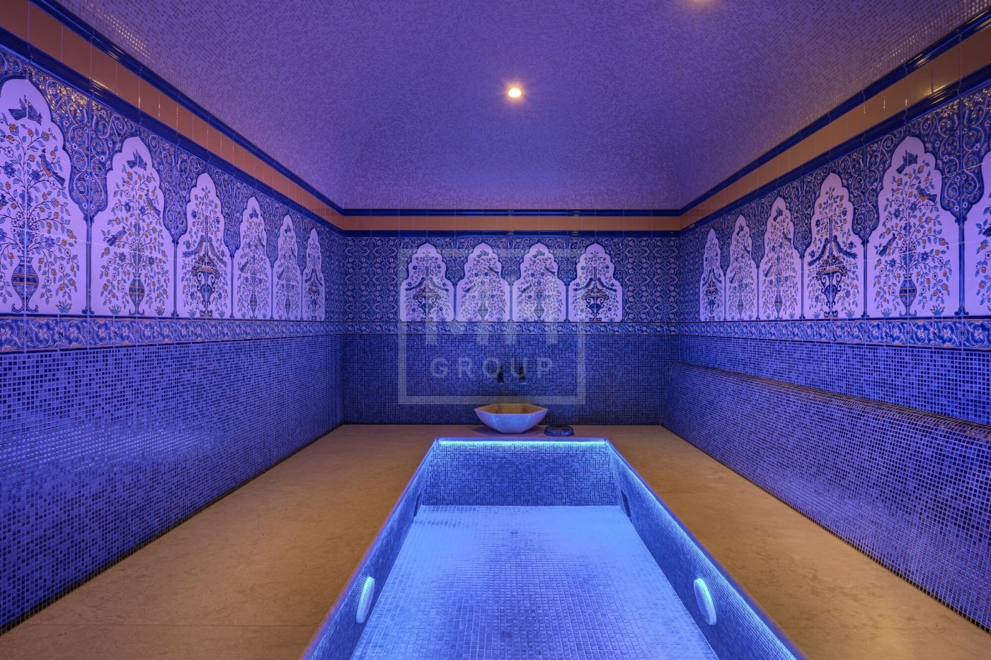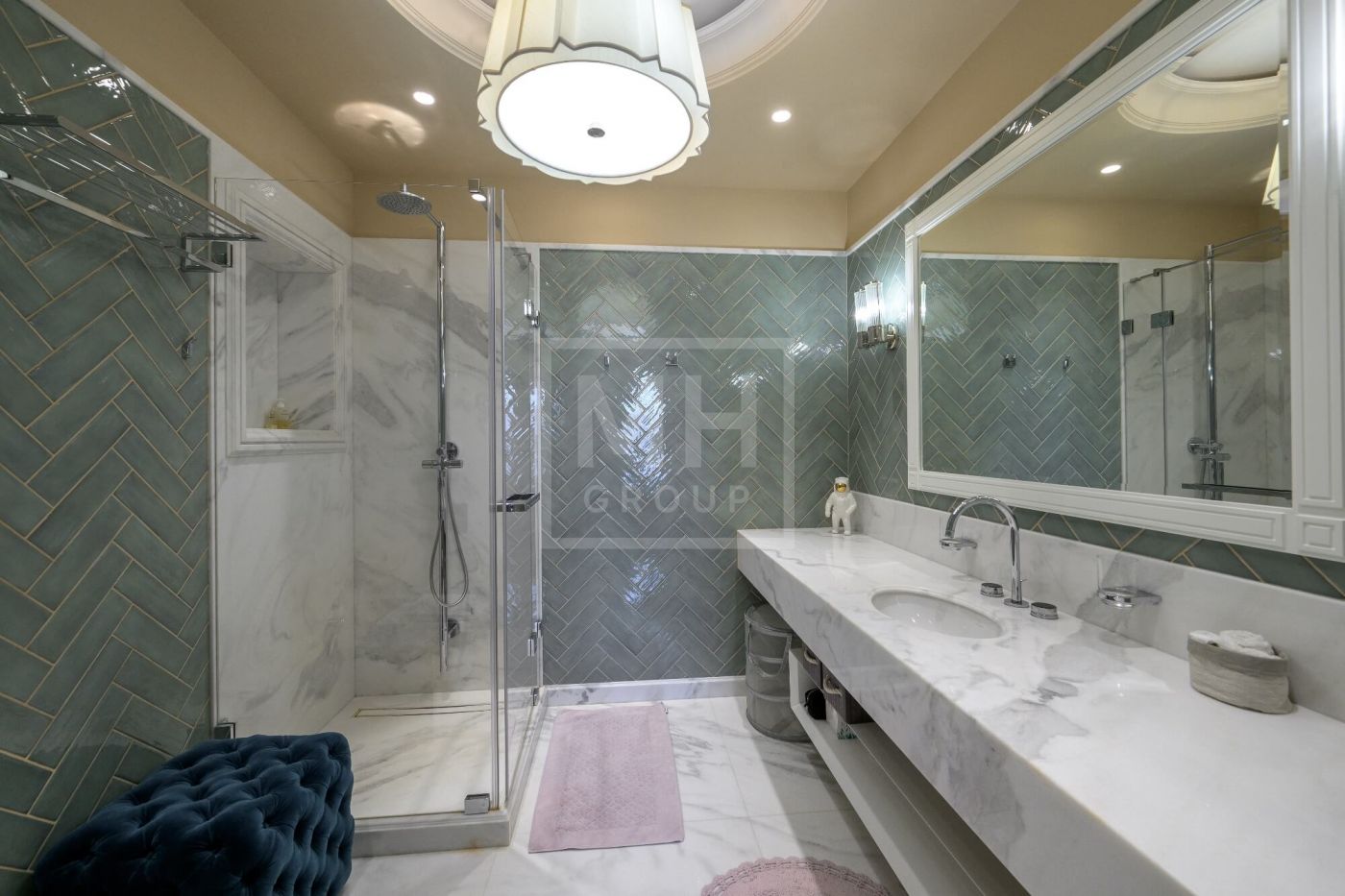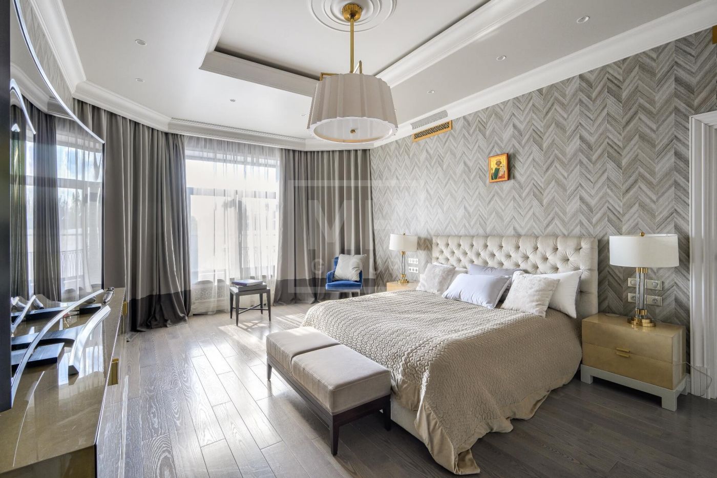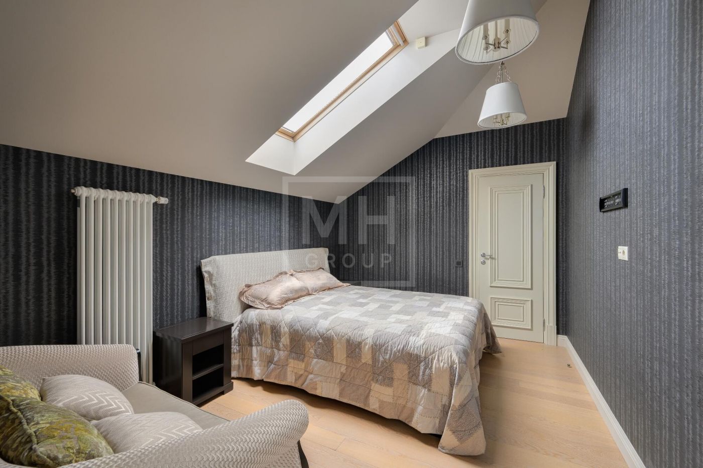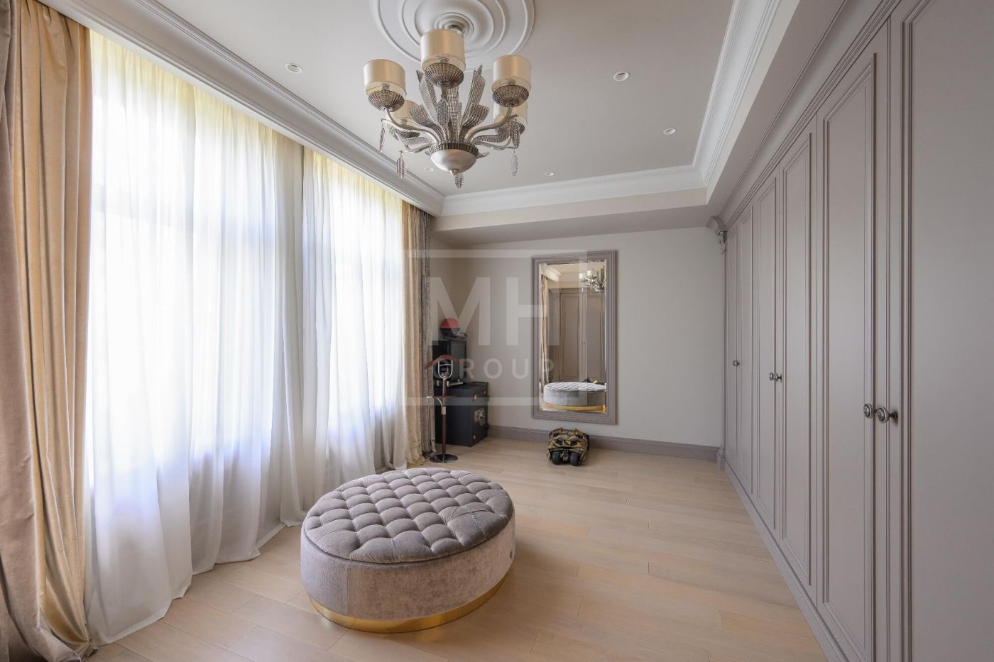 В доме: 5 спален, гостиная с камином, крытая летняя терраса, столовая и кухня кабинет, бассейн, сауна, хаммам, два гаража на 6 м/м, оружейная, постирочная, блок персонала, кладовые и технические помещения.