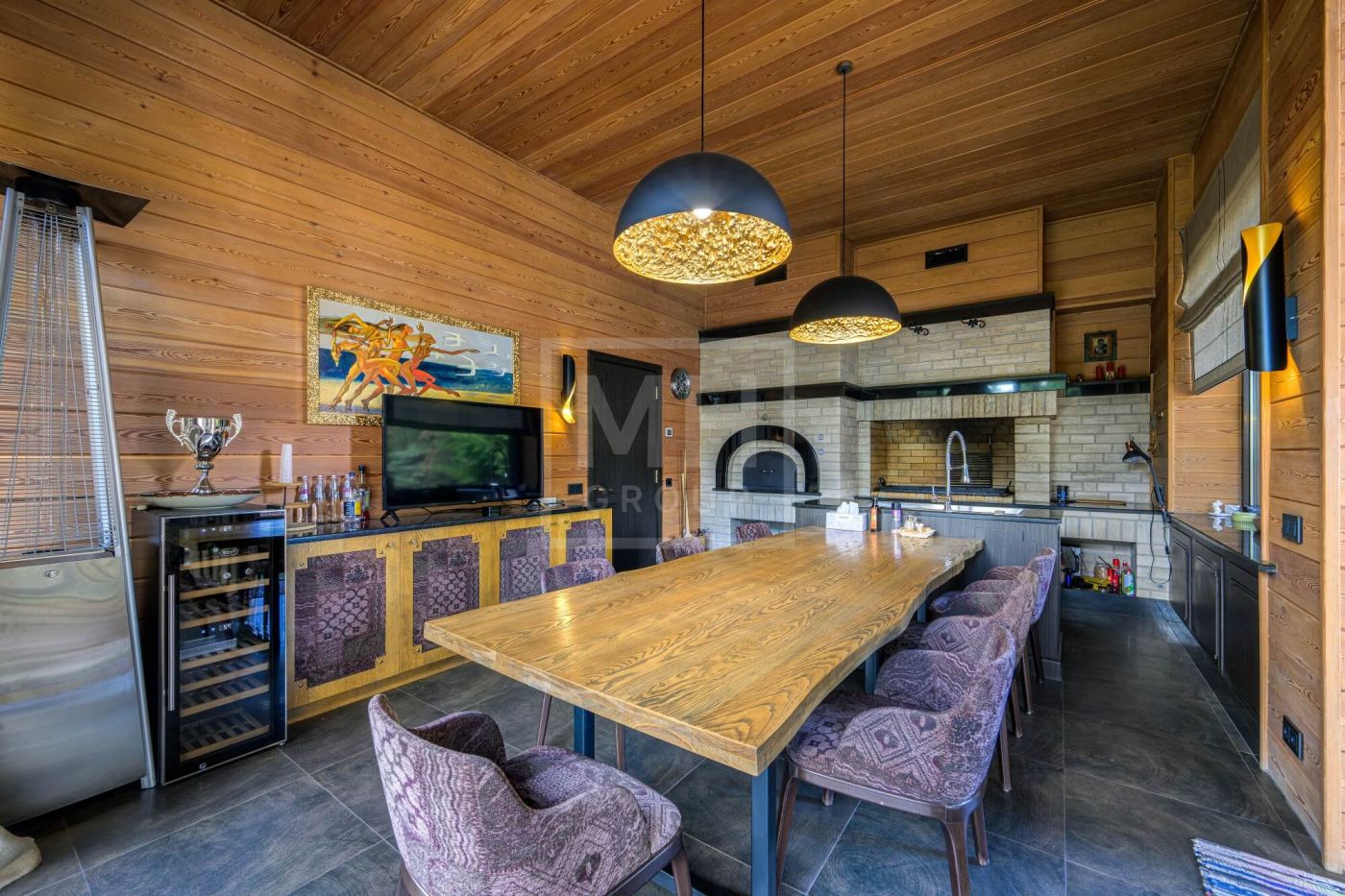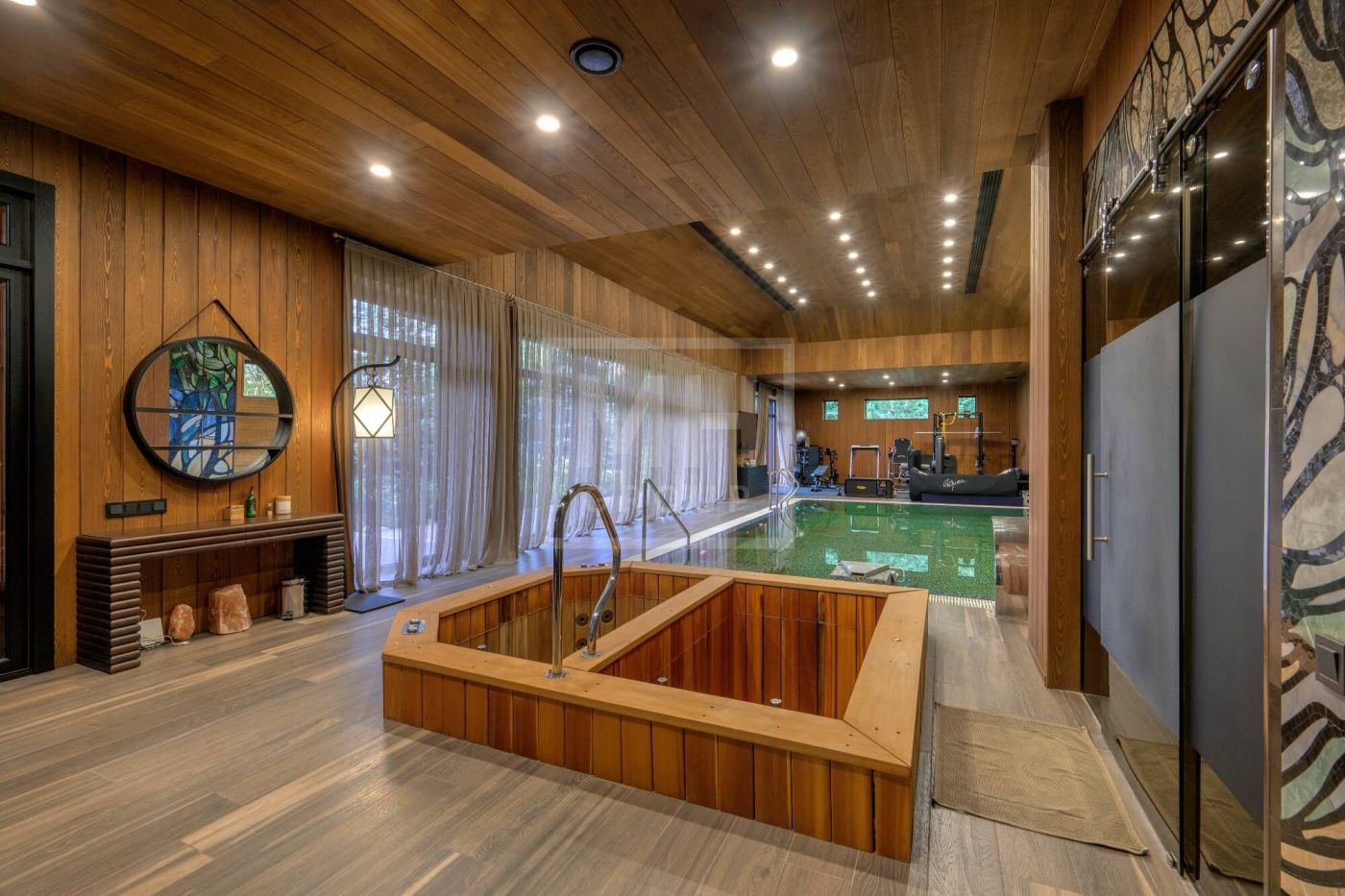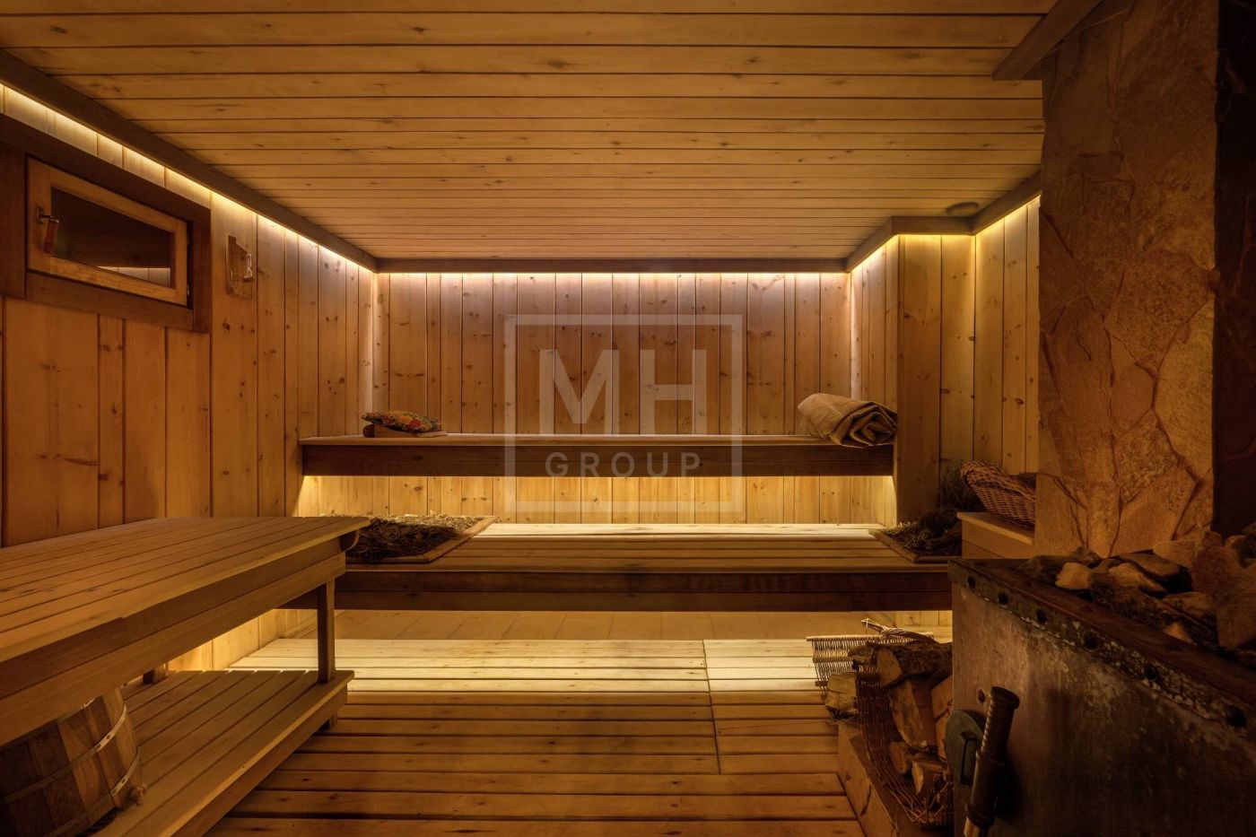 Бассейн 9*4 м с противотоком, джакузи, русская баня на дровах, хаммам, две купели, раздевалка с душевой, комната отдыха с камином, помещение под барбекю и большая терраса на улице.