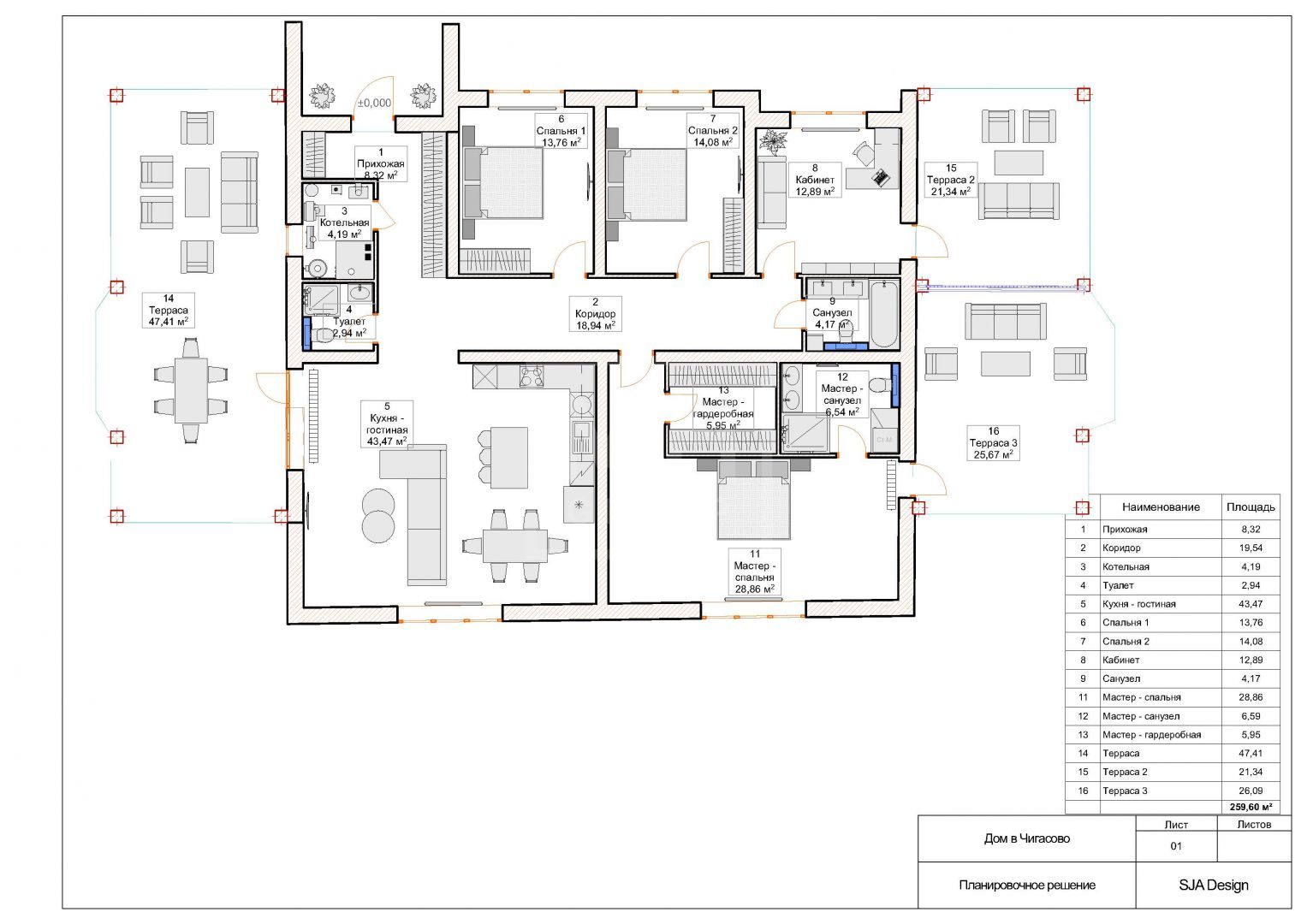 Этаж 1: прихожая, кухня-столовая с гостиной, мастер-блок с гардеробной и санузлом, 2 спальни, 1 кабинет, два санузла, две террасы