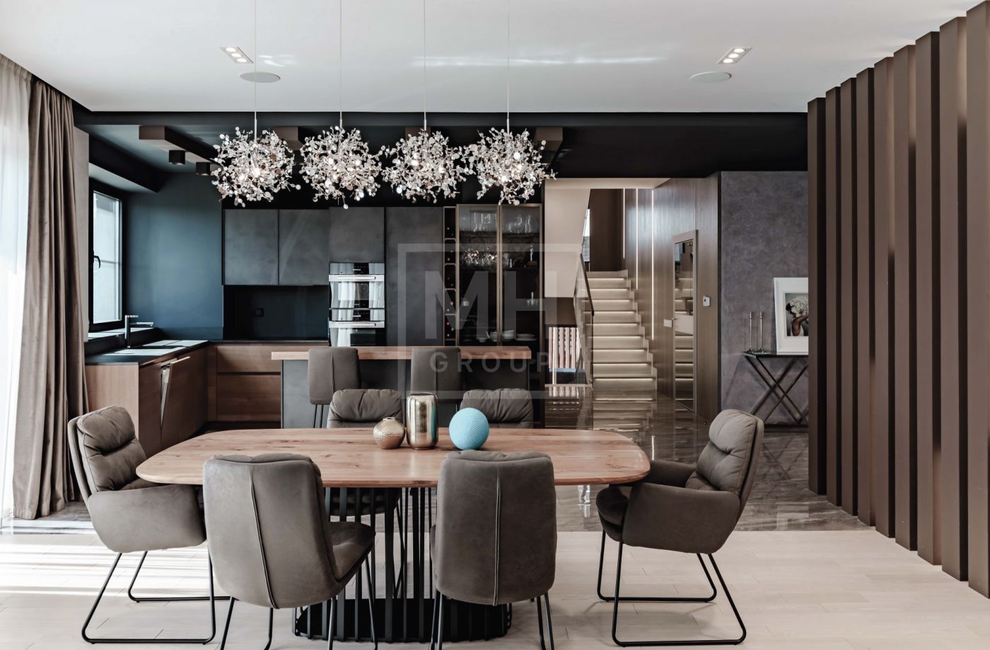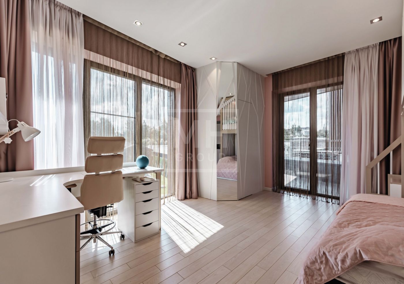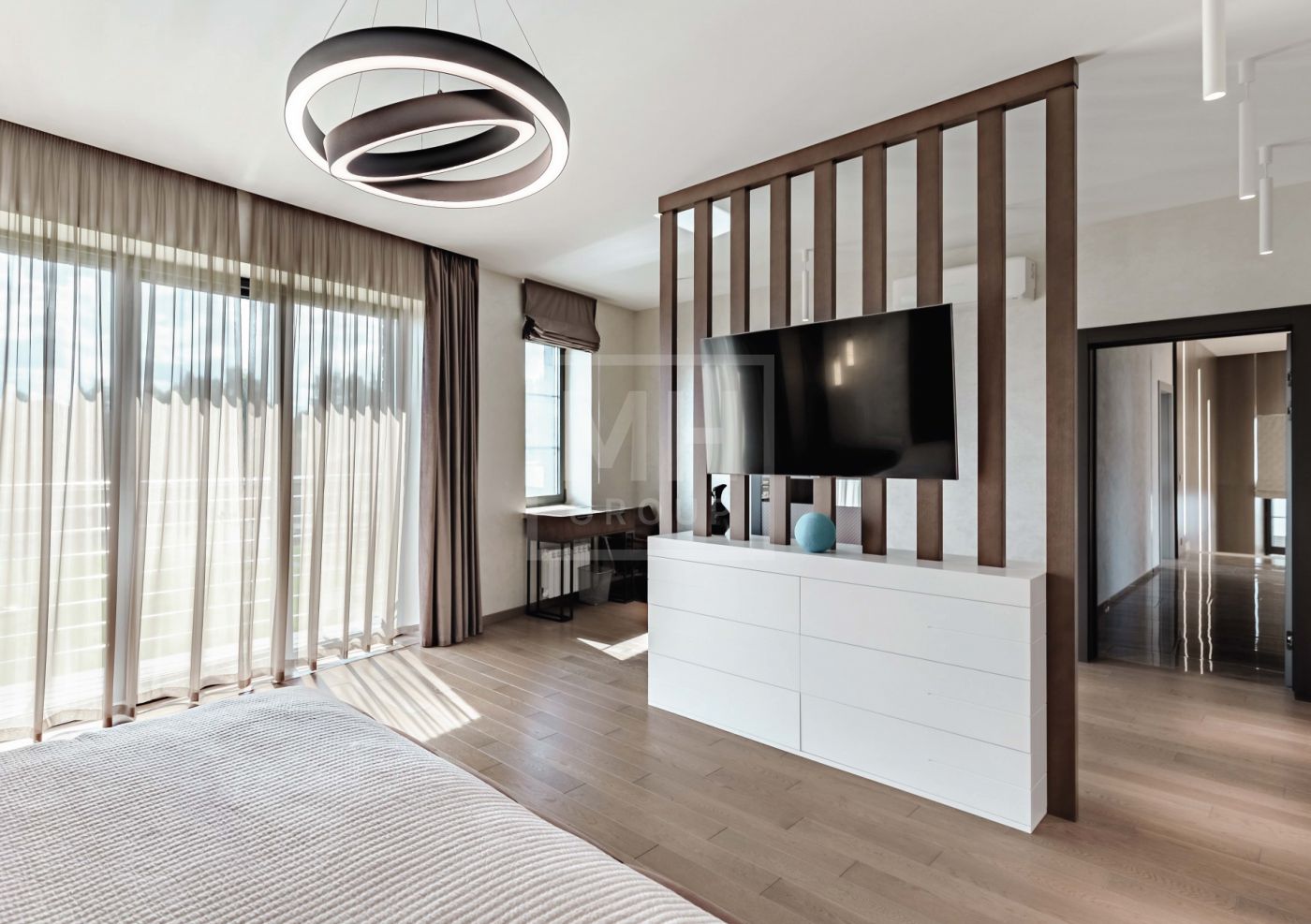 Просторный загородный дом 600 м2 с дизайнерским ремонтом построен на 1-й линии реки на территории престижного охраняемого коттеджного поселка «Лес и Река».Светлый просторный дом выполнен из высококачественных материалов, в отделке использованы натуральные материалы, много дерева, камень - стена в гостиной полностью выполнена из оникса с подсветкой.