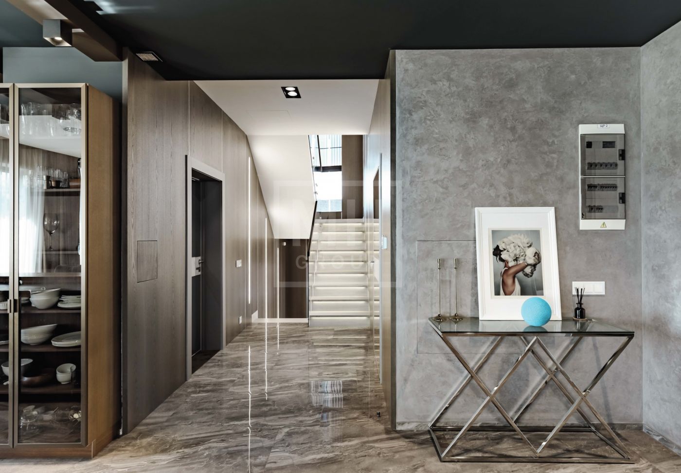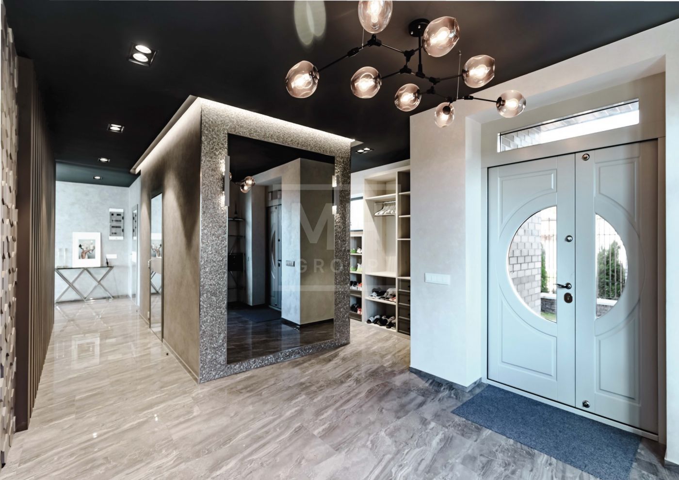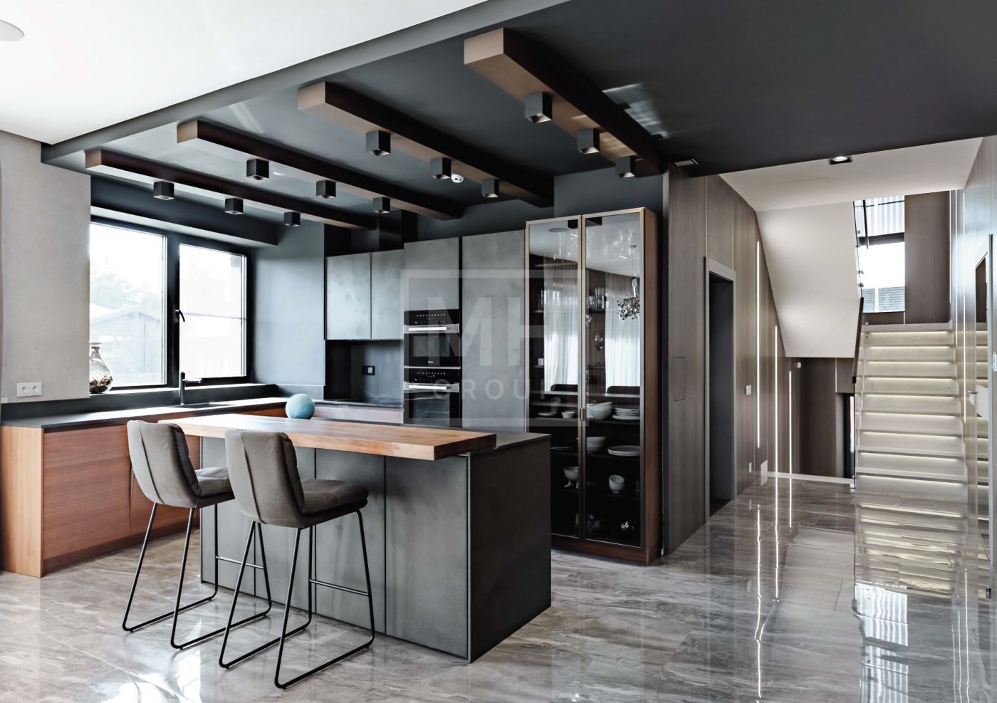 Этаж 1: просторная гостиная и кухня (техника Miele), столовая с выходами на террасу, большой кабинет с камином, входная группа/прихожей/гардеробная, кладовая, санузел, гараж на одну машину с входом в дом.