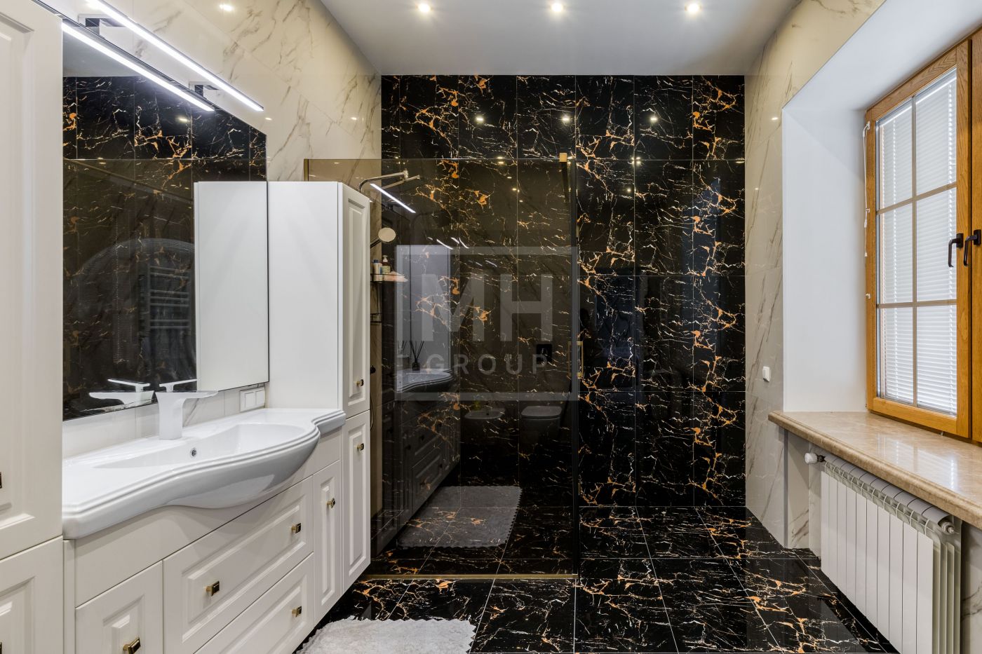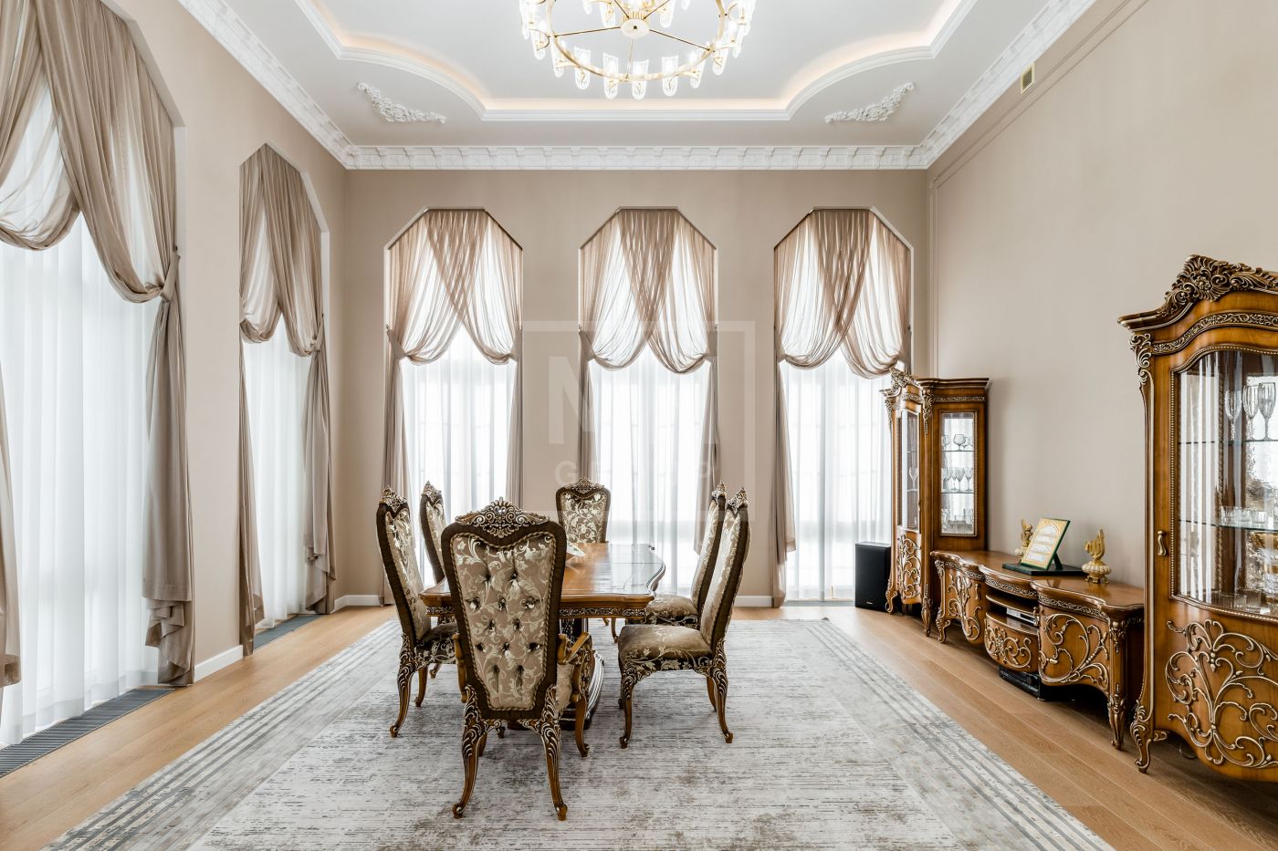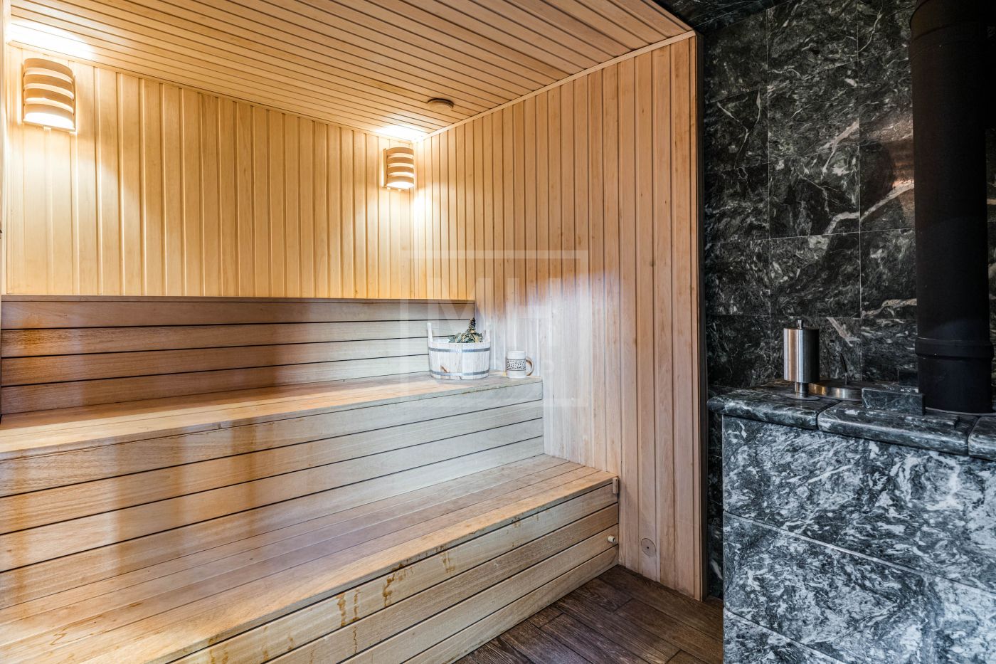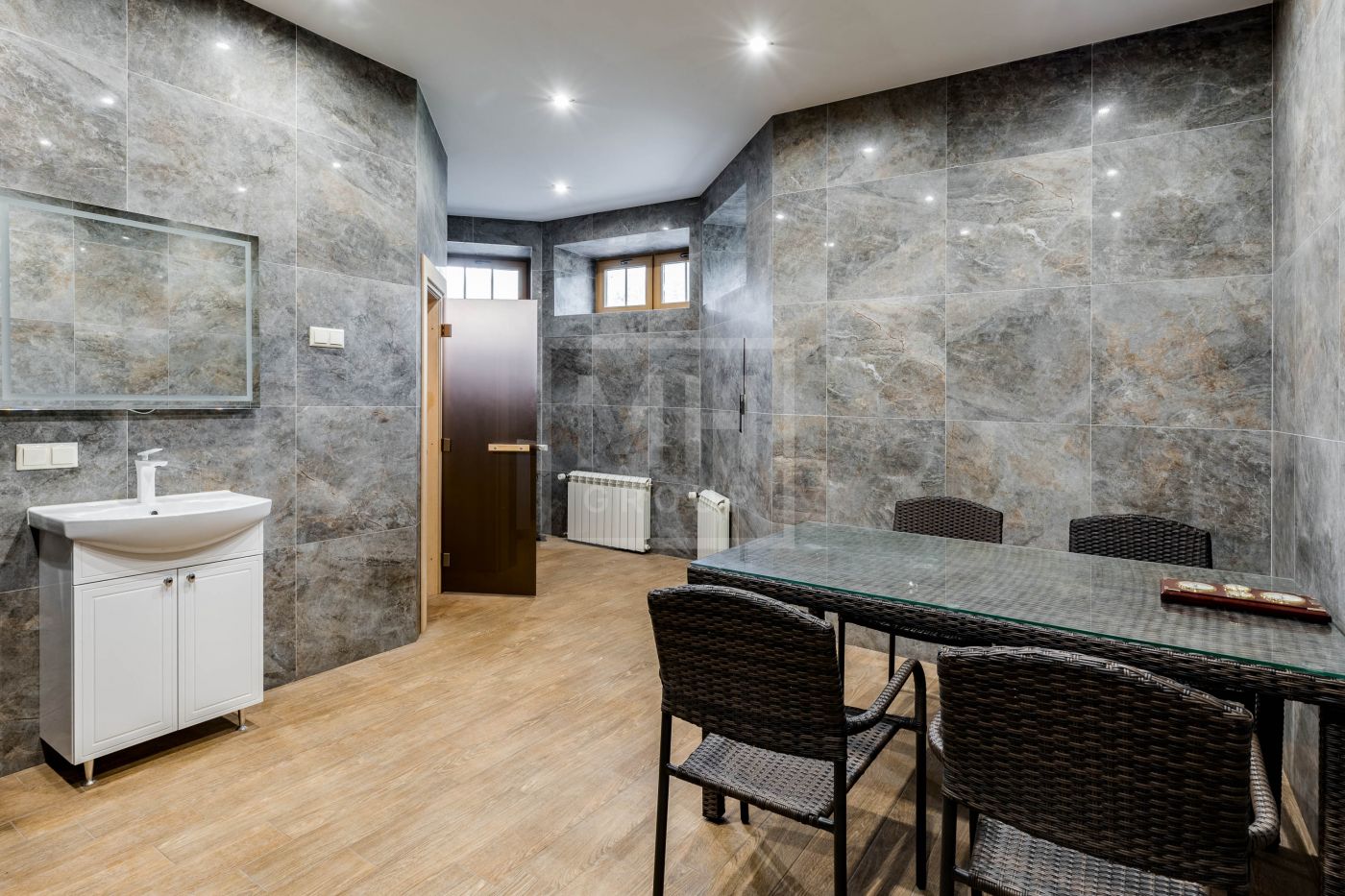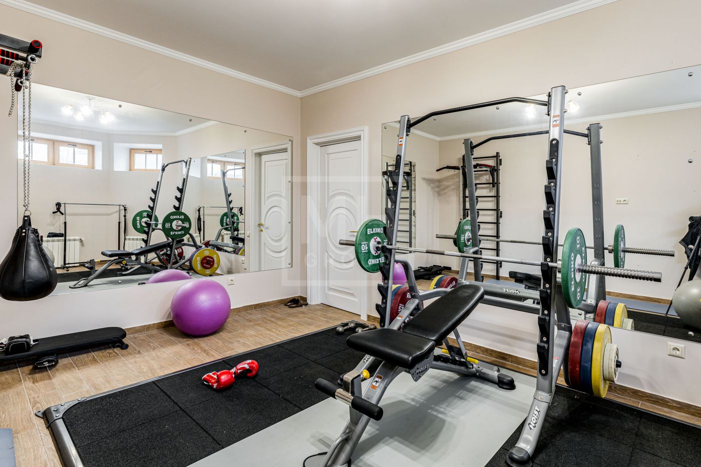 Цокольный этаж включает котельную, баню на дровах, сезонную гардеробную, постирочную, спортзал, кинотеатр, бильярдную и санузел, что создает отличные условия для досуга и активного отдыха.