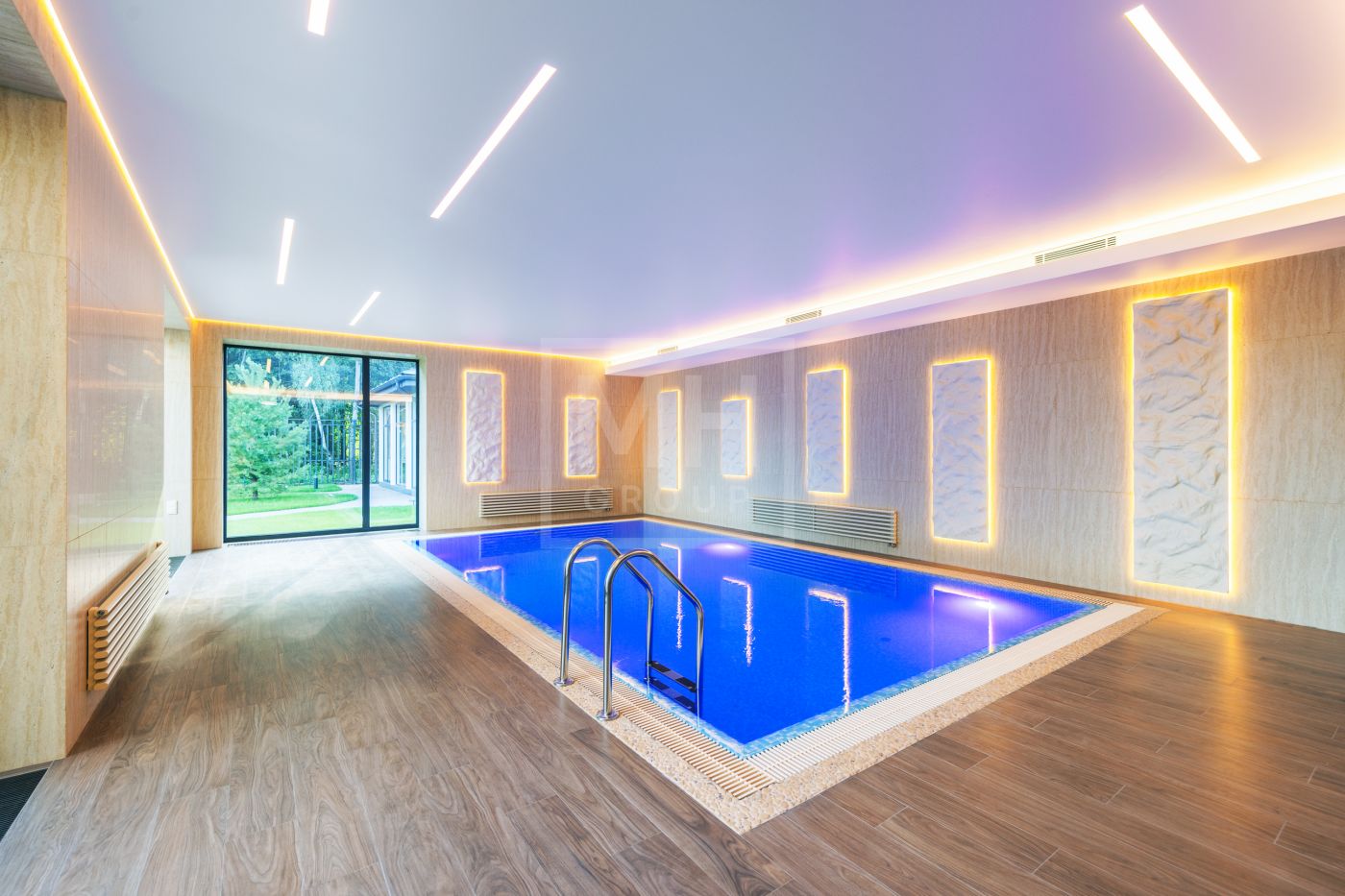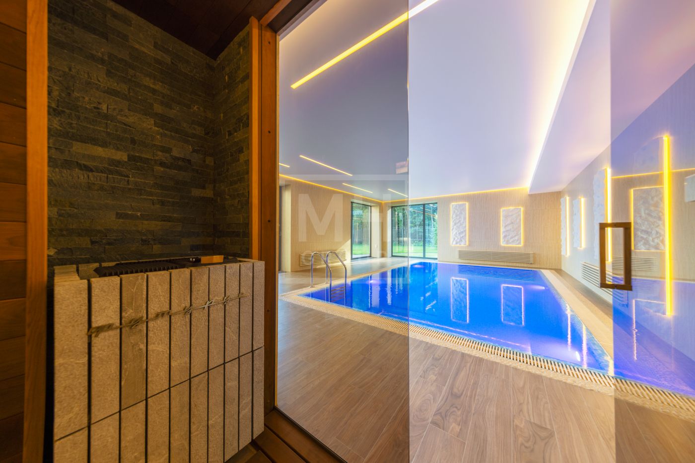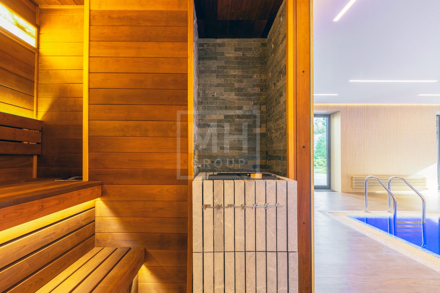 В доме имеется спа-зона, включающая в себя сауну и бассейн 7*4 с противотоком и подсветкой. Бассейн оснащен инновационной системой очистки NECON. Кристально чистая вода без хлора и химических запахов обеспечивает