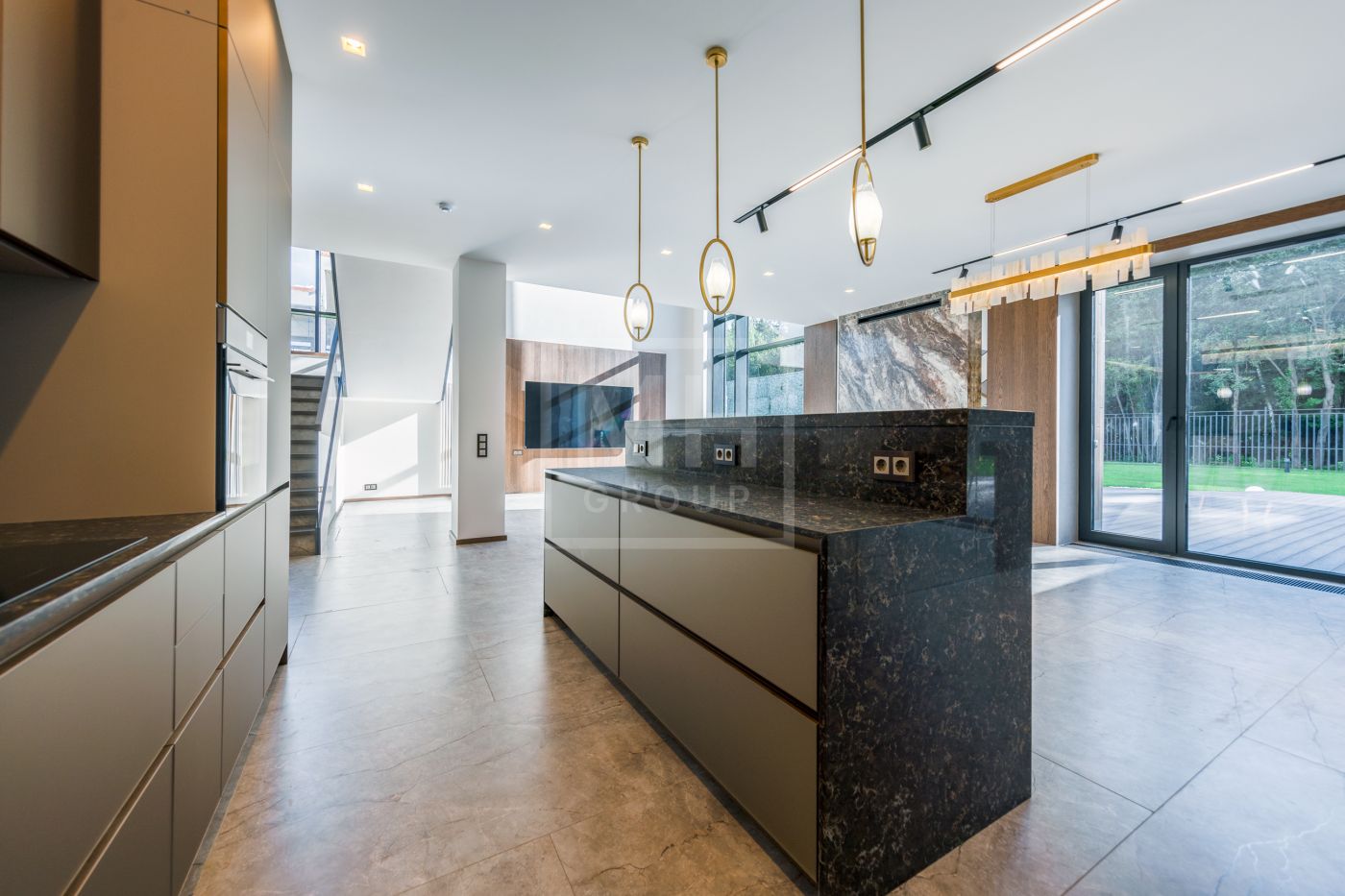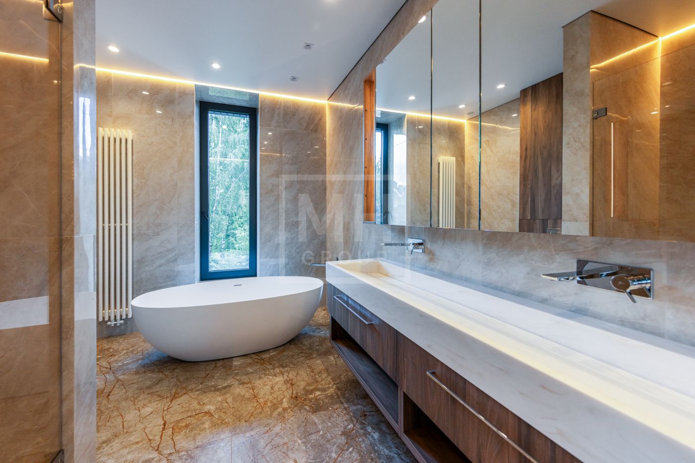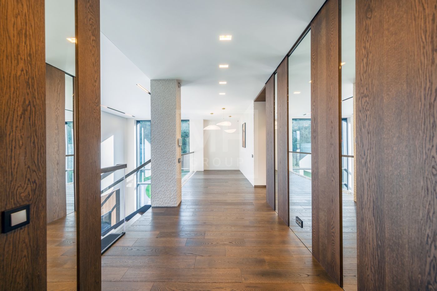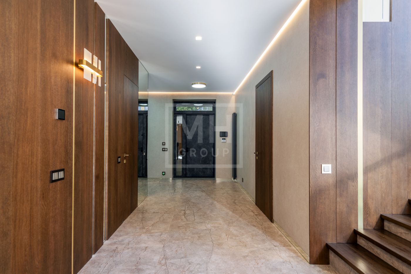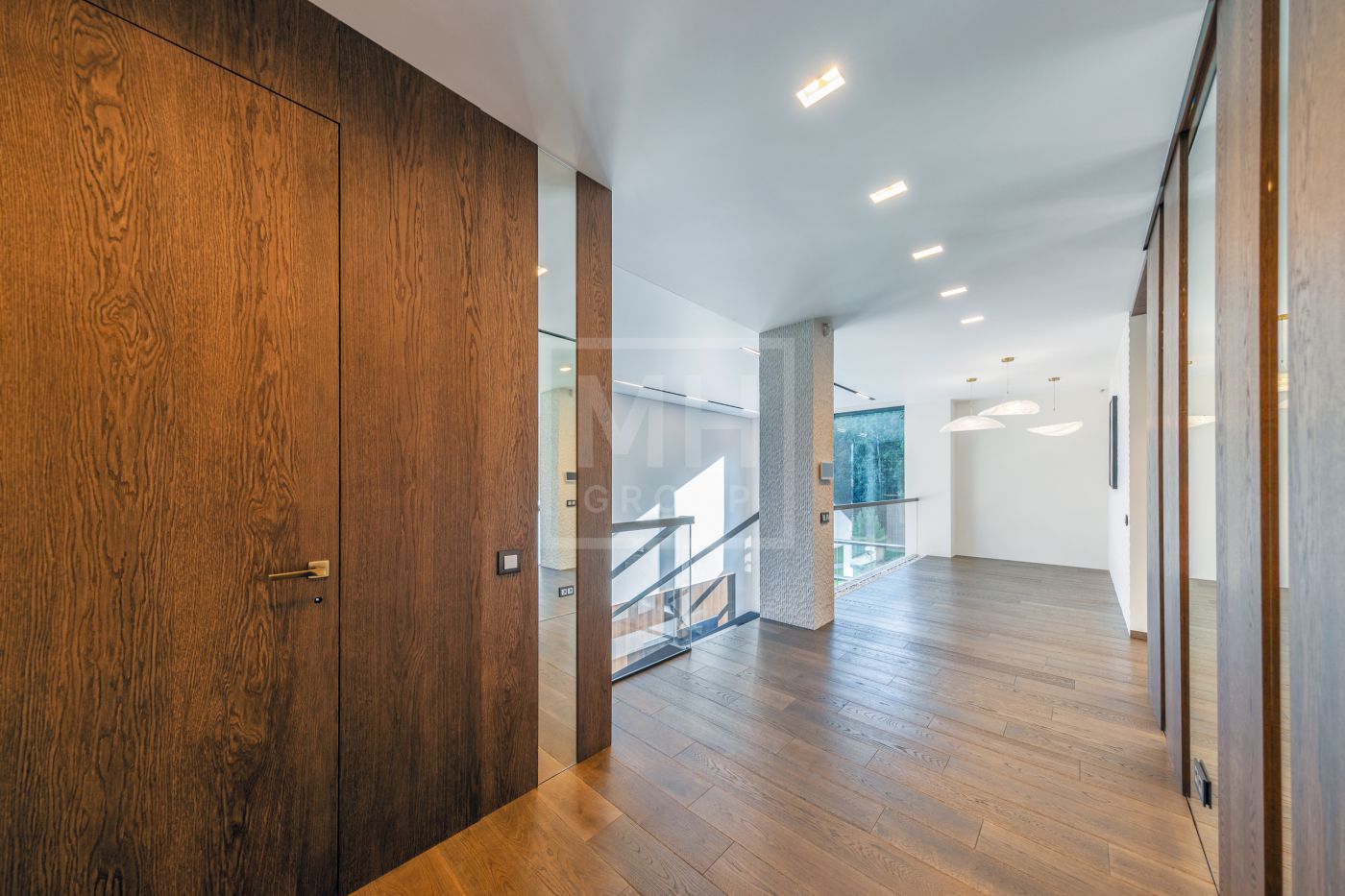 К Вашему вниманию предлагается новый современный дом в приватной прилесной части поселка. При строительстве были использованы только экологически чистые качественные материалы.Внутренняя отделка стен выполнена панелями из натурального шпона, пол – натуральный дуб. В доме установлена сантехника из Италии и Испании премиальных марок. Бытовая техника SMEG и Liebherr.
