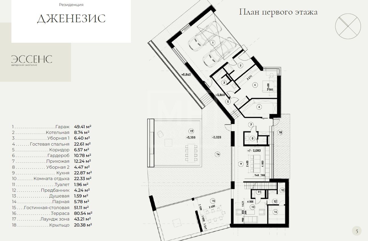 Этаж 1: Прихожая, гардеробная, с/у, кухня, столовая-гостиная, терраса, спальня с с/у, спа-зона с сауной, душевой, с/у и комнатой отдыха, гараж, котельная