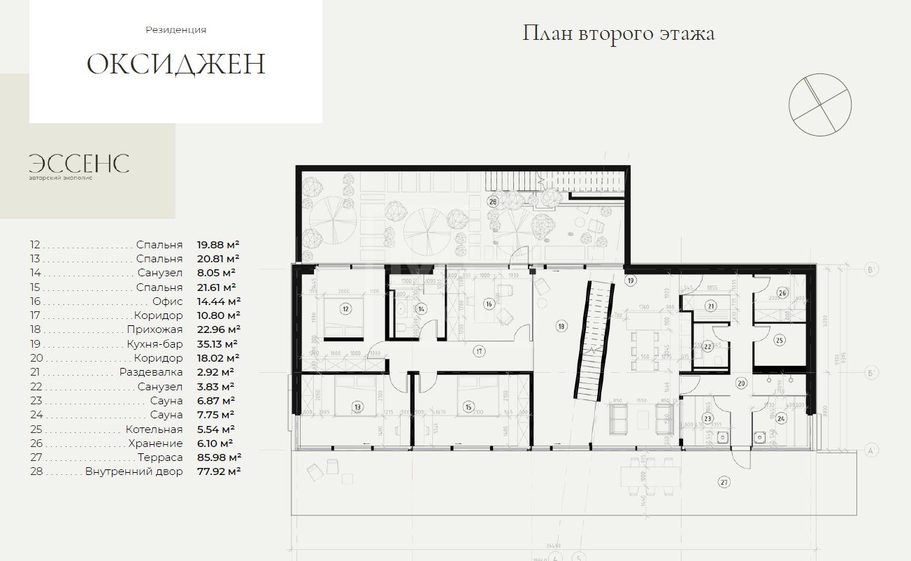 Этаж 2: 3 спальни, с/у, кабинет, зона отдыха с кухней, баром, комнатой отдыха, сауной, с/у, внутренний двор