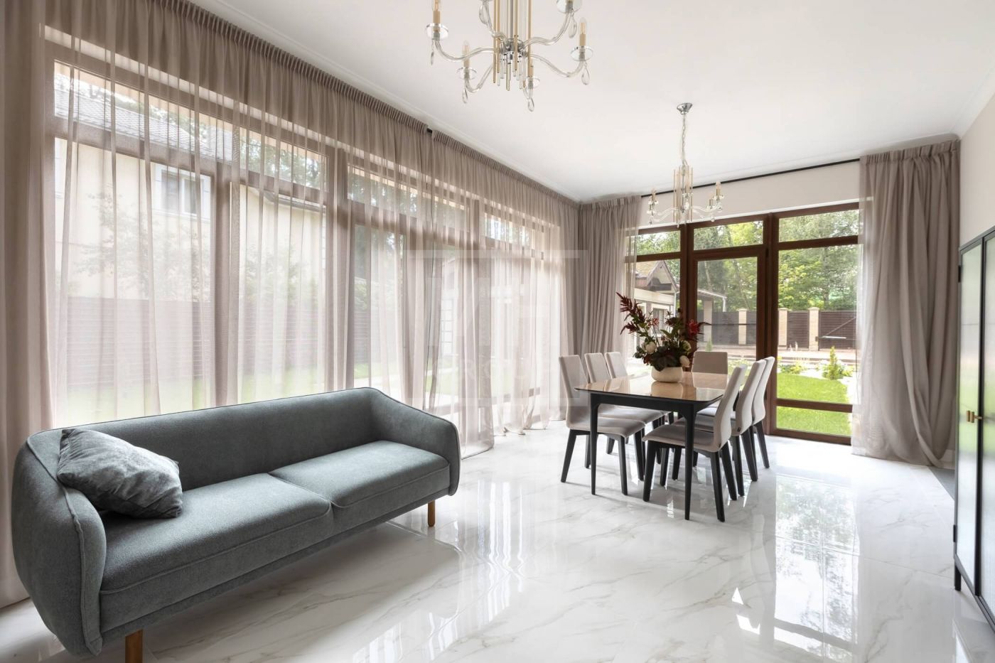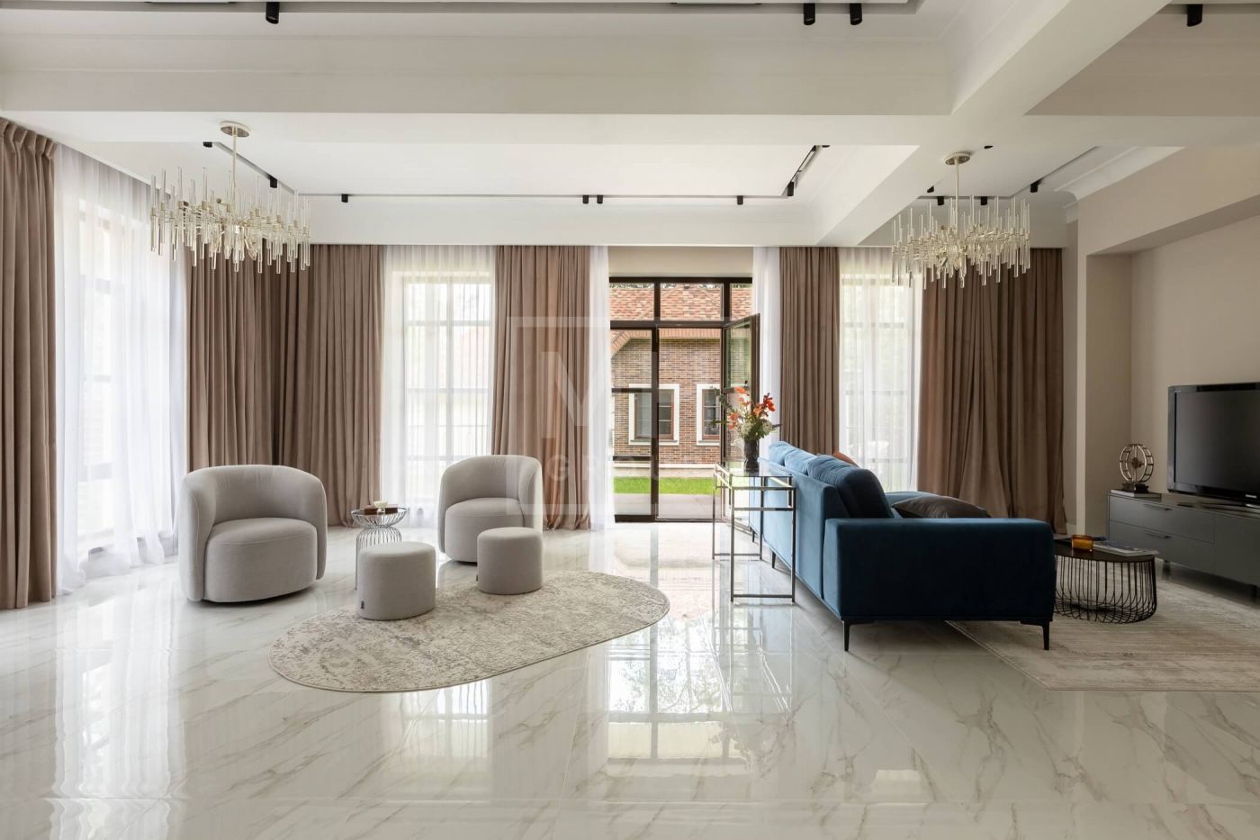 В основном доме: 4 спальни, просторная гостиная с выходом на террасу и камином, облицованным мрамором, мастер-спальня со вторым светом с высотой потолков 5,5 м,кухня, столовая, кабинет, 3 санузла, постирочная,