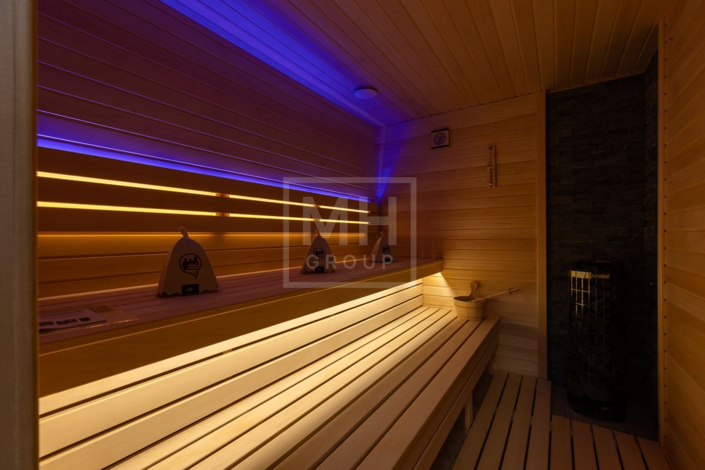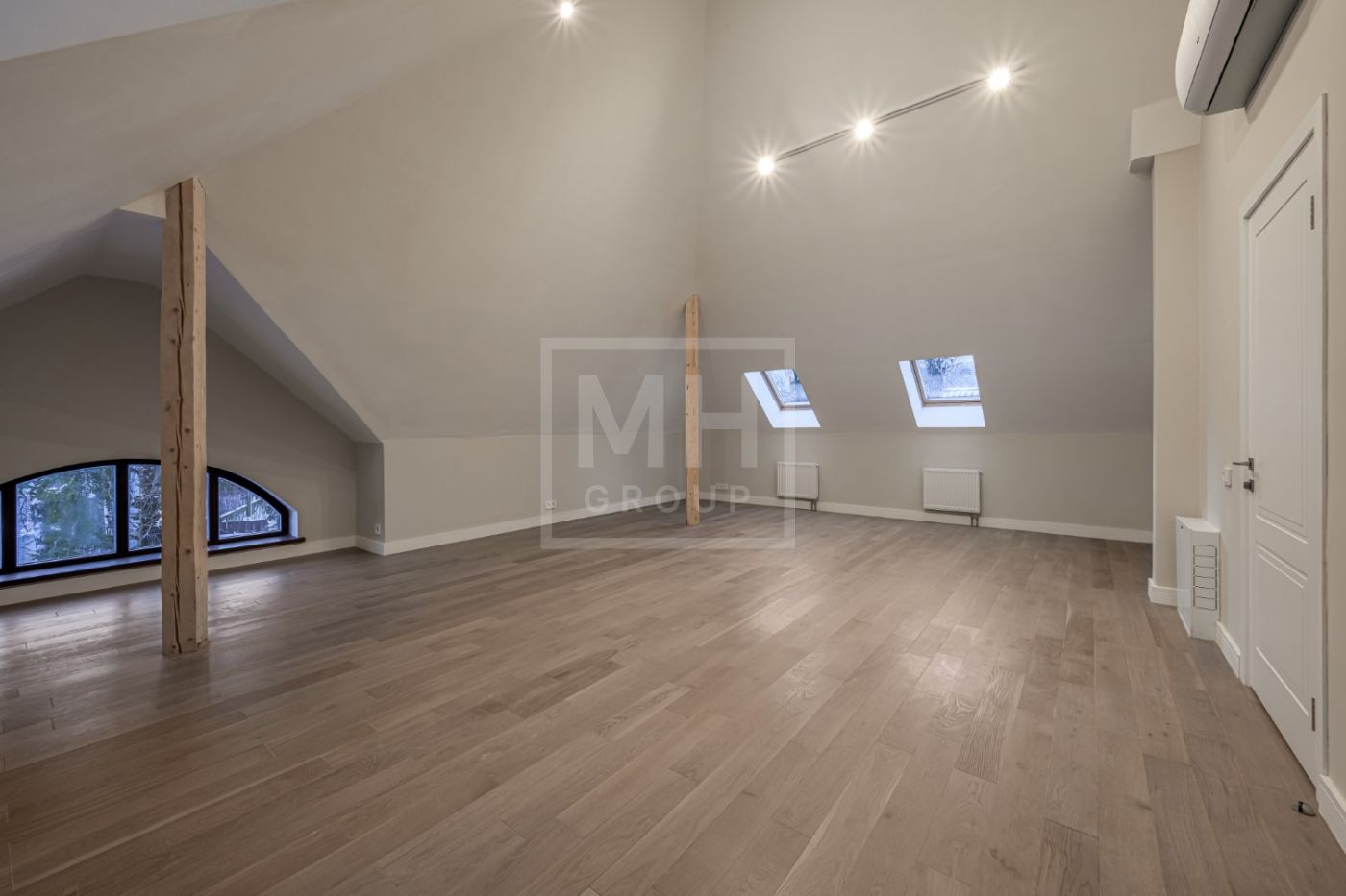 Высота потолка: 1 и 2 уровней 3,4 м, главная спальня 5,5 м, мансарда 2.9 м. Помимо основного дома на участке расположен гостевой дом (44,6 кв.м), банный комплекс (55,2 кв.м) с бассейном и выходом в лес и 4 парковочных места, 2 из которых под навесом.