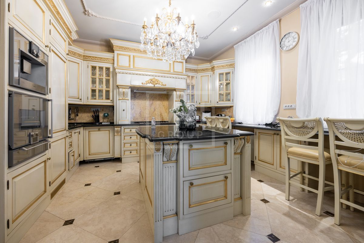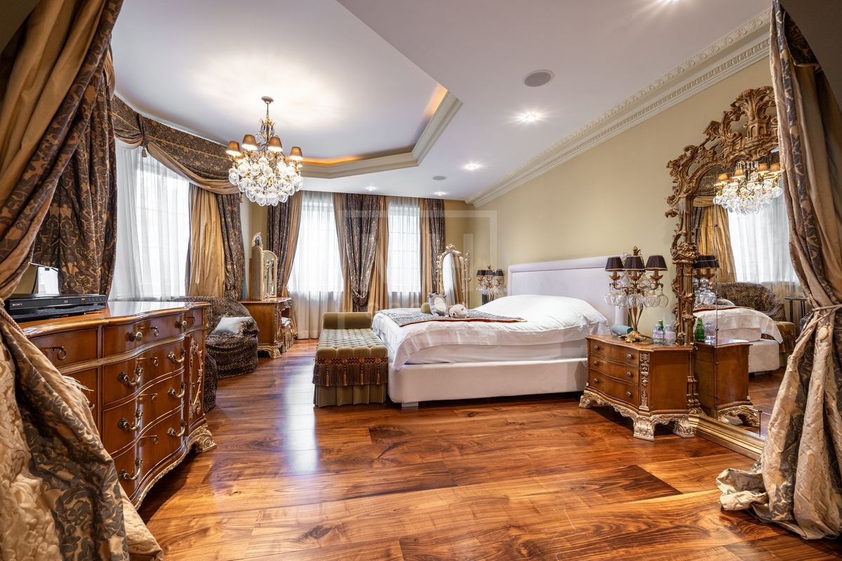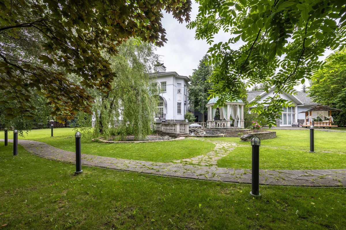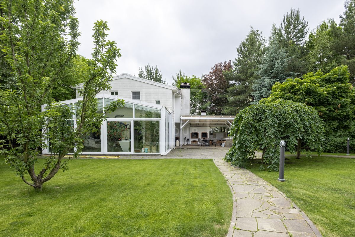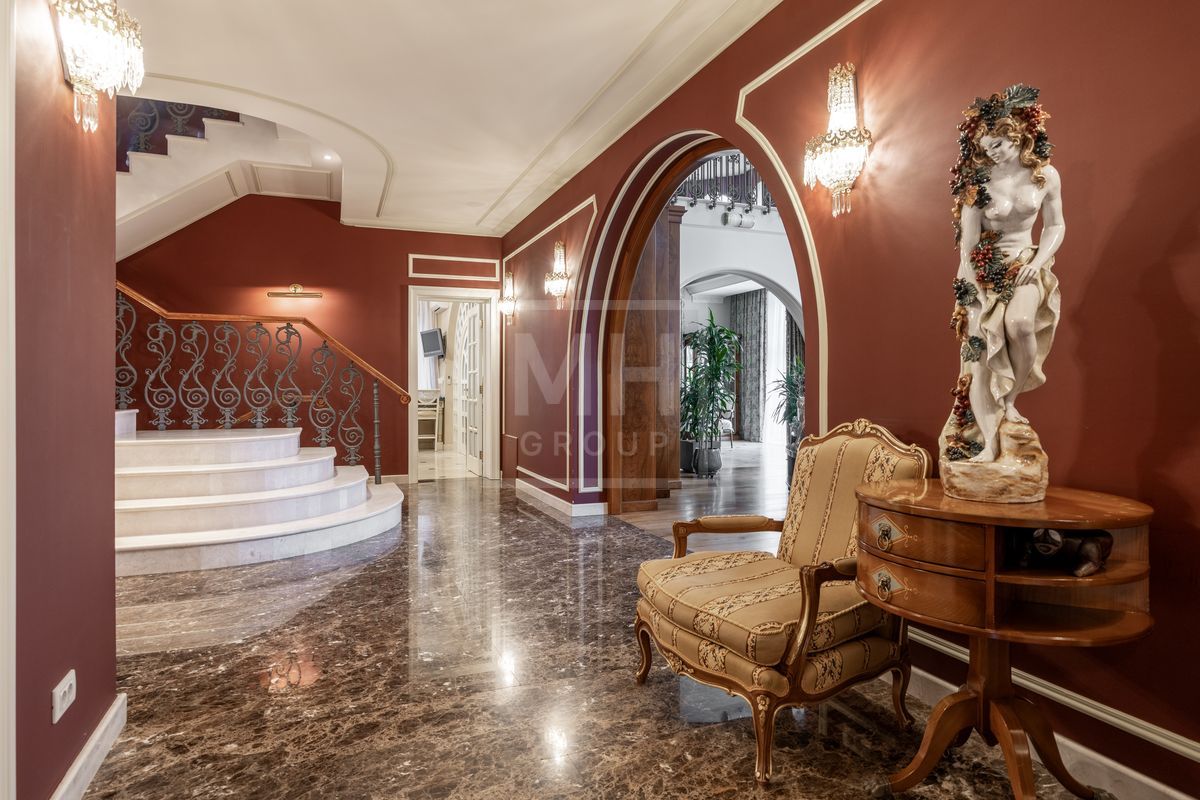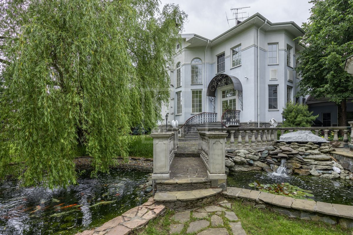 Основной дом площадью 877 кв. м., гостевой дом с зимним садом и гончарной мастерской, а также блок для персонала с гаражом. Интерьеры оформлены лучшими природными материалами, а планировка продумана до мелочей: просторные гостиные, кабинеты, спальни с ванными комнатами, бассейн и SPA-зона. Земельный участок площадью 47 соток украшен итальянской ротондой, прудом с каскадным водопадом и зонами для отдыха.В отделке дома использованы дорогие природные материалы, такие как шелк, редкие породы дерева, различные сорта мрамора и гранита. Мебель в дом покупали у итальянских фабрик PROVASI и FRANCESCO MOLON. Техническое и инженерное наполнение дома тоже выполнено на высоком уровне центральная система кондиционирования, приточно-вытяжная вентиляция системы DAIKIN, котельная BUDERUS с автоматической системой управления, бытовая техника от GAGENAU и MIELE.
