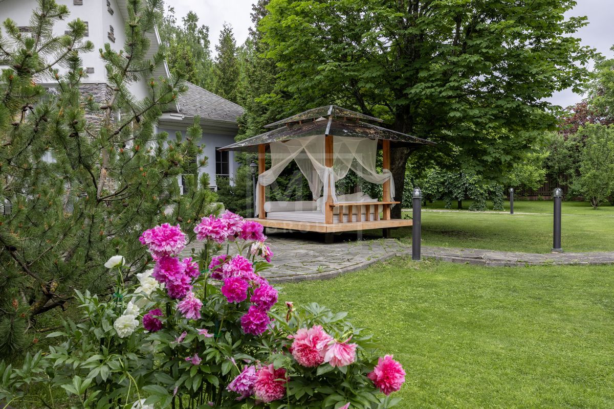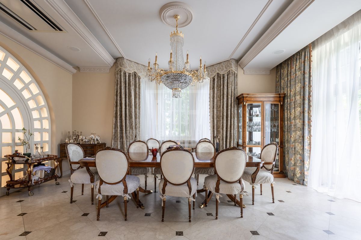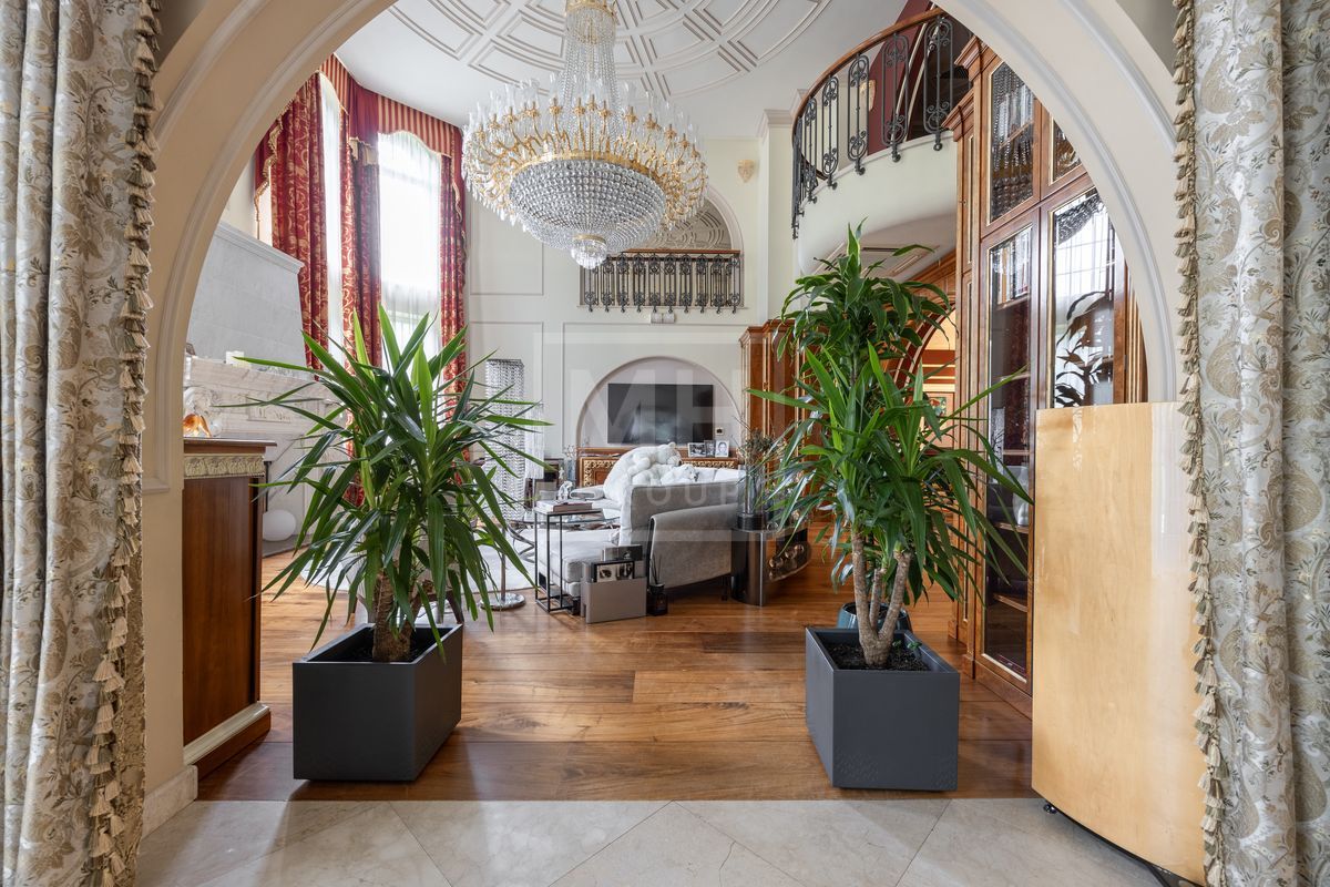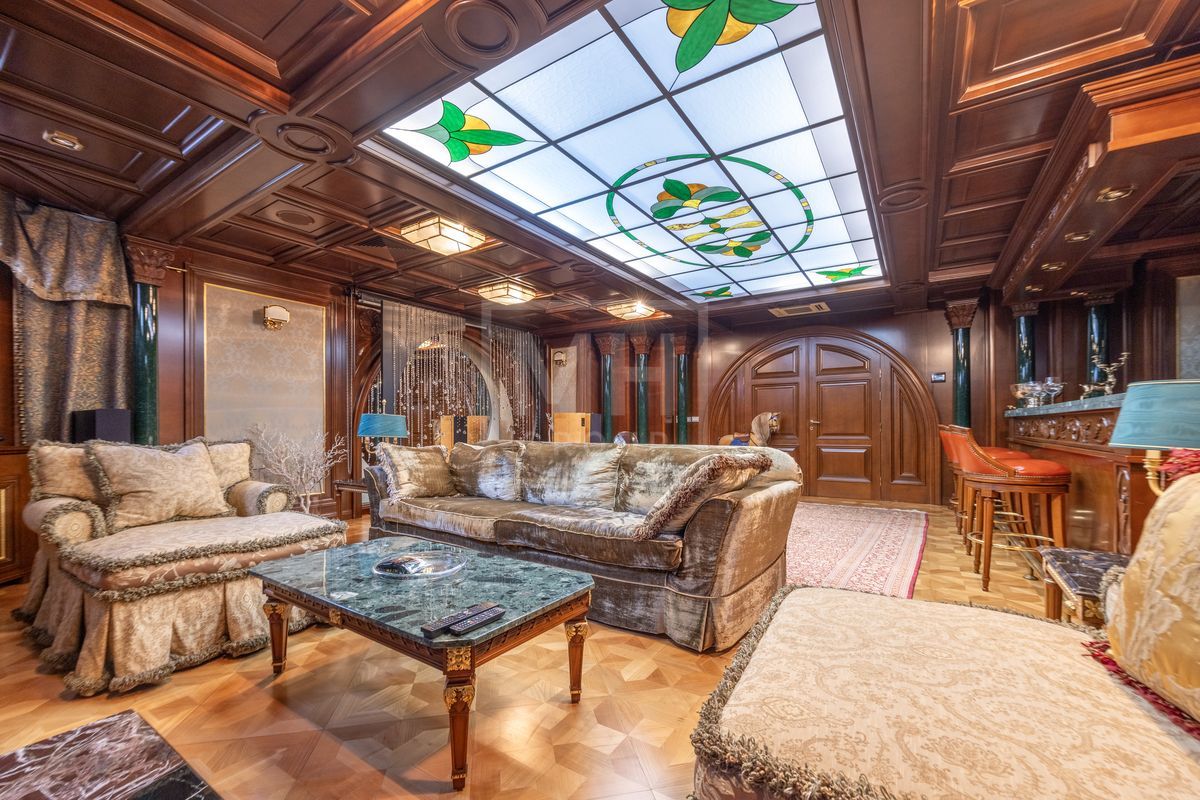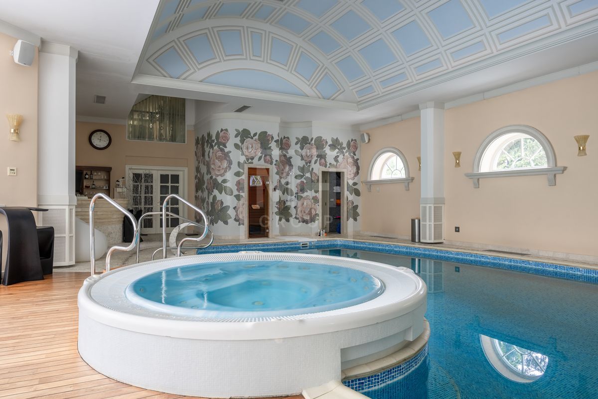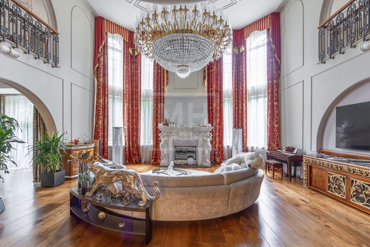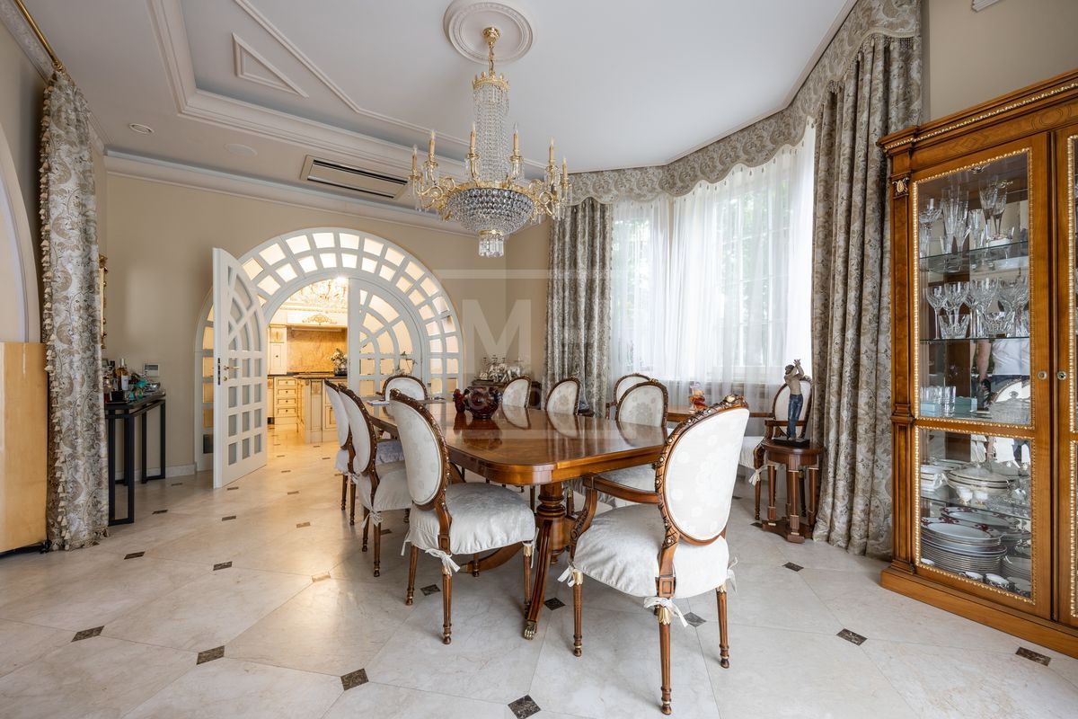 Основной дом площадью 877 кв. м., гостевой дом с зимним садом и гончарной мастерской, а также блок для персонала с гаражом. Интерьеры оформлены лучшими природными материалами, а планировка продумана до мелочей: просторные гостиные, кабинеты, спальни с ванными комнатами, бассейн и SPA-зона. Земельный участок площадью 47 соток украшен итальянской ротондой, прудом с каскадным водопадом и зонами для отдыха.В отделке дома использованы дорогие природные материалы, такие как шелк, редкие породы дерева, различные сорта мрамора и гранита. Мебель в дом покупали у итальянских фабрик PROVASI и FRANCESCO MOLON. Техническое и инженерное наполнение дома тоже выполнено на высоком уровне центральная система кондиционирования, приточно-вытяжная вентиляция системы DAIKIN, котельная BUDERUS с автоматической системой управления, бытовая техника от GAGENAU и MIELE.
