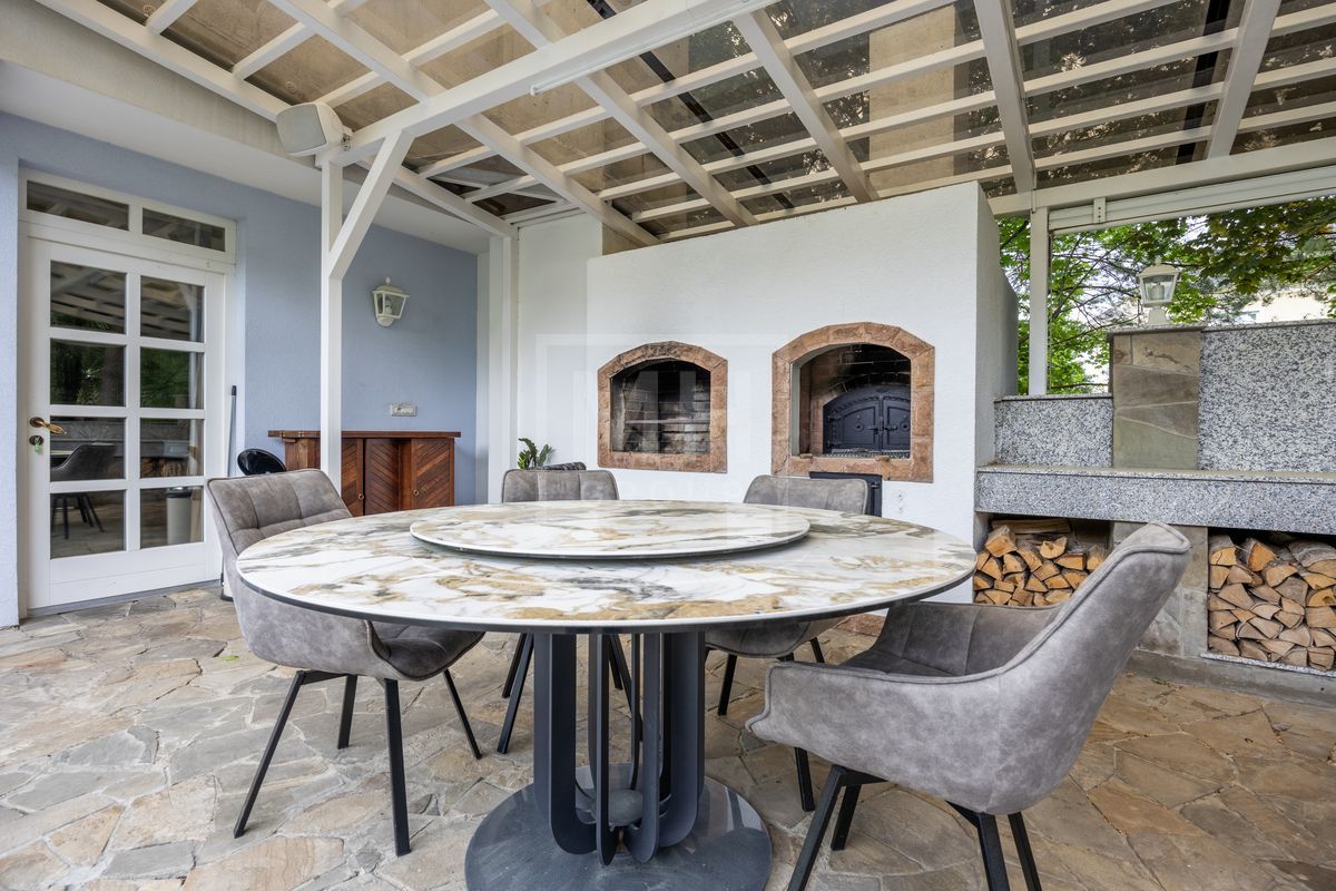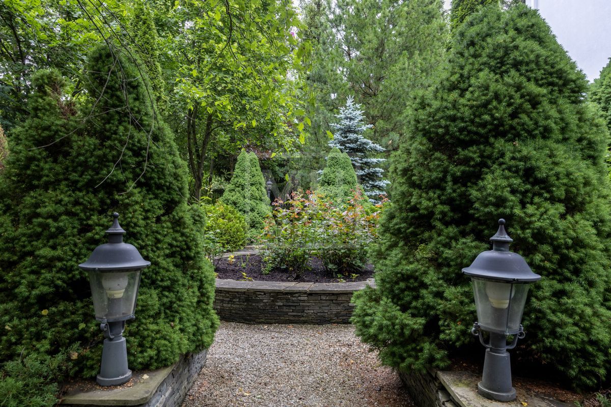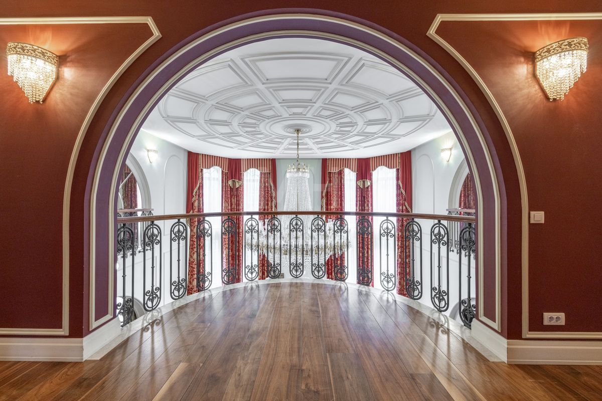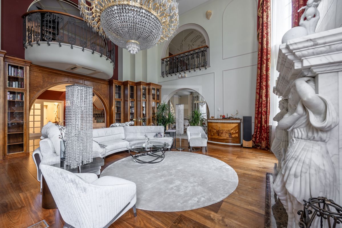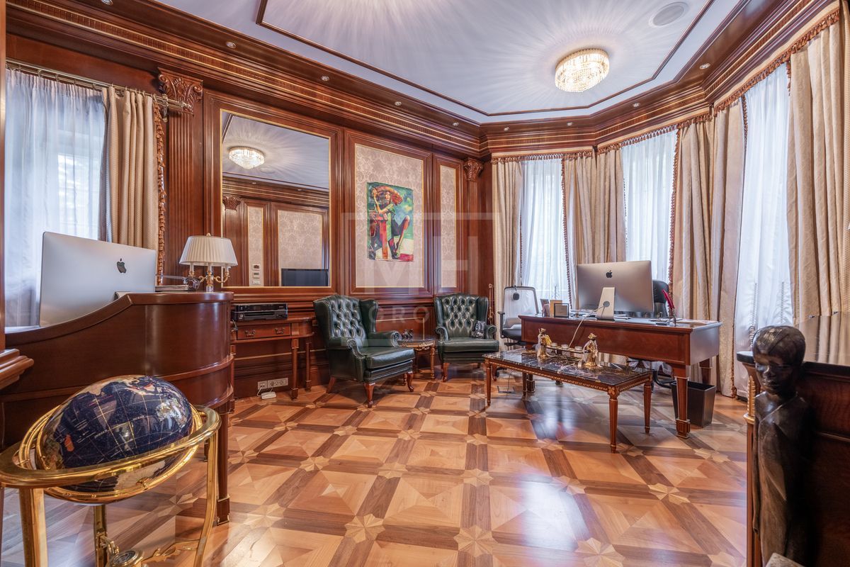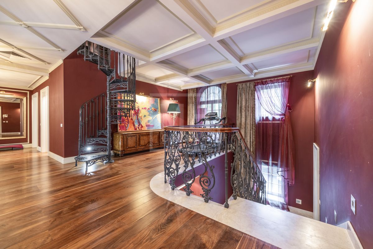 Основной дом площадью 877 кв. м., гостевой дом с зимним садом и гончарной мастерской, а также блок для персонала с гаражом. Интерьеры оформлены лучшими природными материалами, а планировка продумана до мелочей: просторные гостиные, кабинеты, спальни с ванными комнатами, бассейн и SPA-зона. Земельный участок площадью 47 соток украшен итальянской ротондой, прудом с каскадным водопадом и зонами для отдыха.В отделке дома использованы дорогие природные материалы, такие как шелк, редкие породы дерева, различные сорта мрамора и гранита. Мебель в дом покупали у итальянских фабрик PROVASI и FRANCESCO MOLON. Техническое и инженерное наполнение дома тоже выполнено на высоком уровне центральная система кондиционирования, приточно-вытяжная вентиляция системы DAIKIN, котельная BUDERUS с автоматической системой управления, бытовая техника от GAGENAU и MIELE.