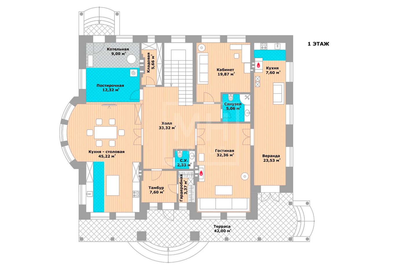 Этаж 1: тамбур, гардеробная, холл, кухня-столовая, гостиная с камином, спальня/кабинет, малая кухня с печью с верандой и выходом на террасу, с/у. Постирочная, котельная, кладовая.
