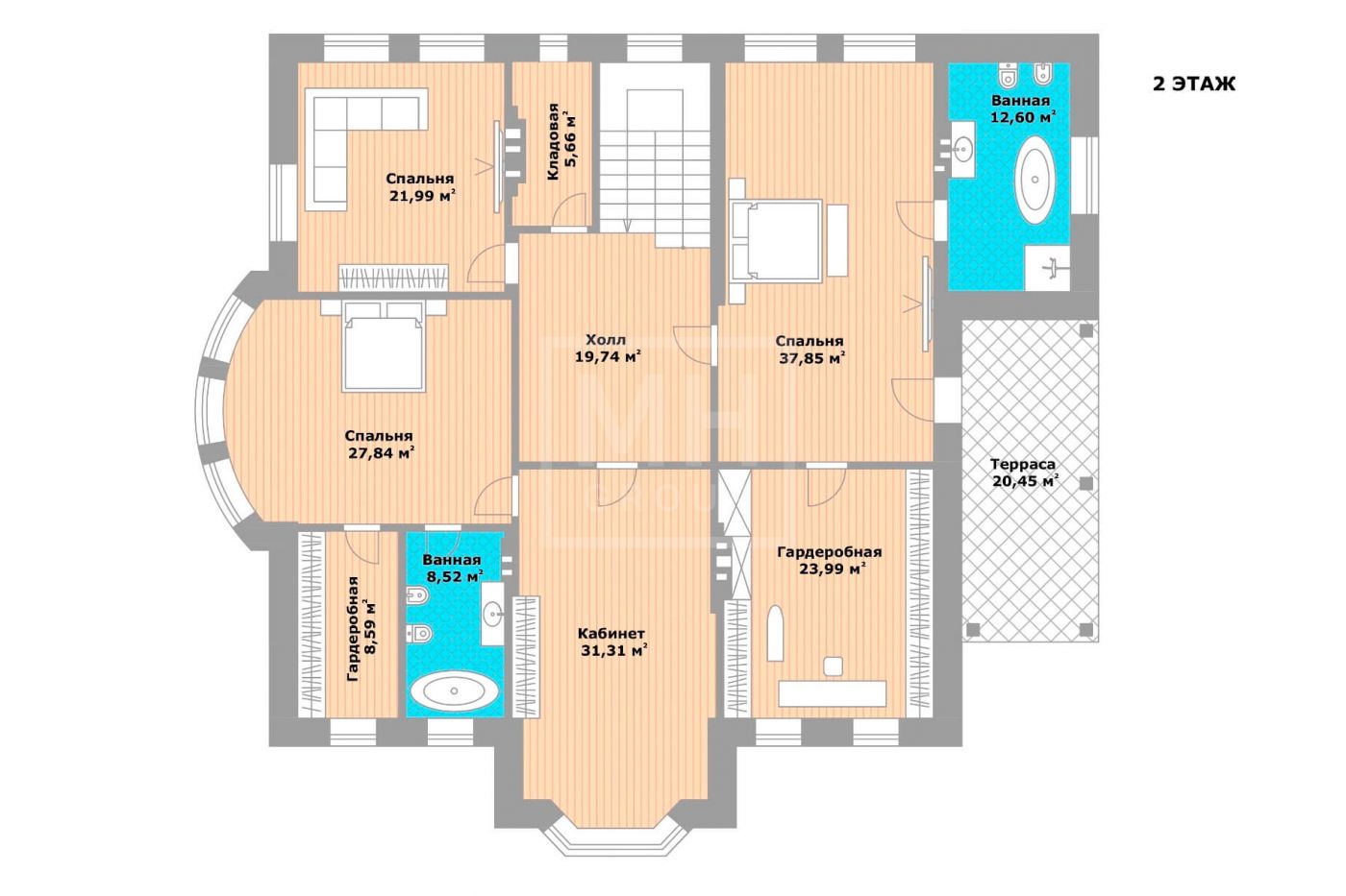 Этаж 2: холл,Мастер-спальня №1 с ванной , гардеробной и выходом на террасу; Мастер-спальня №2 с ванной и гардеробной; две спальни; кладовая .