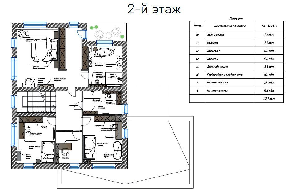 Этаж 2: холл, мастер- блок с просторной гардеробной и с/у, кабинет, две спальни, с/у с ванной