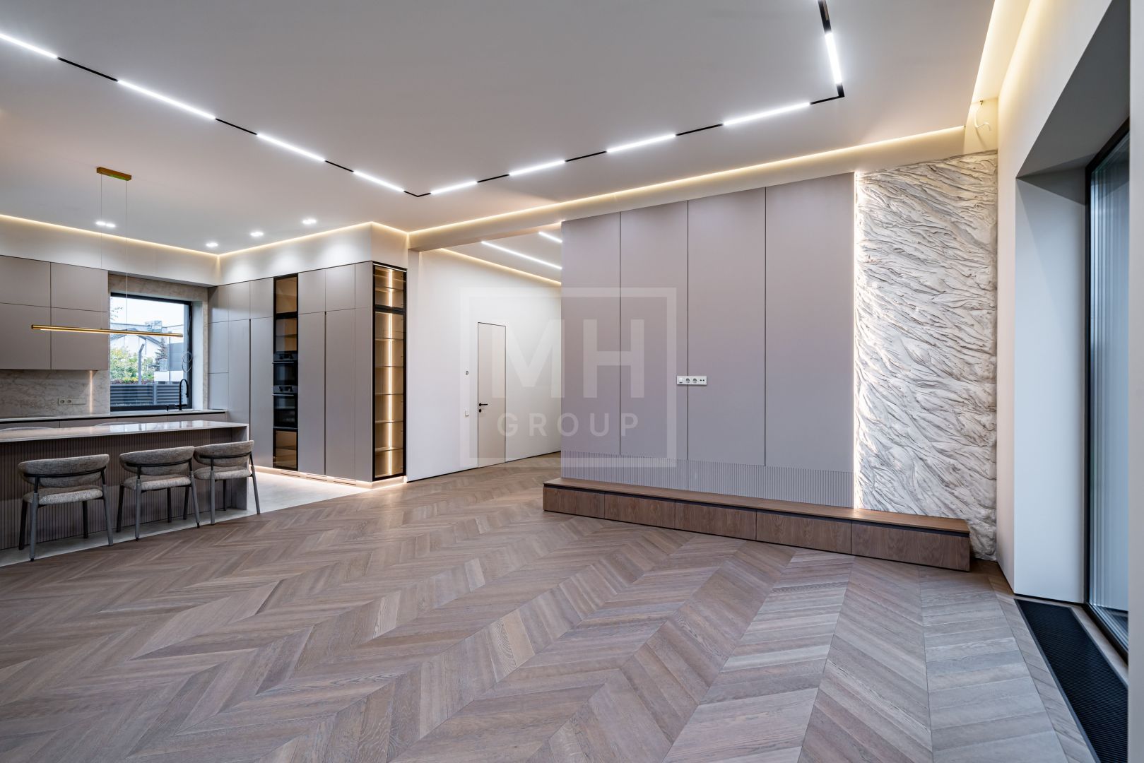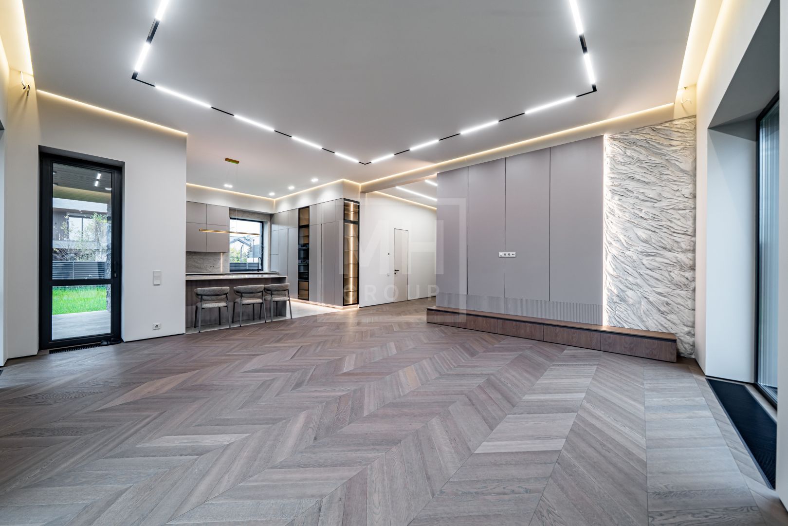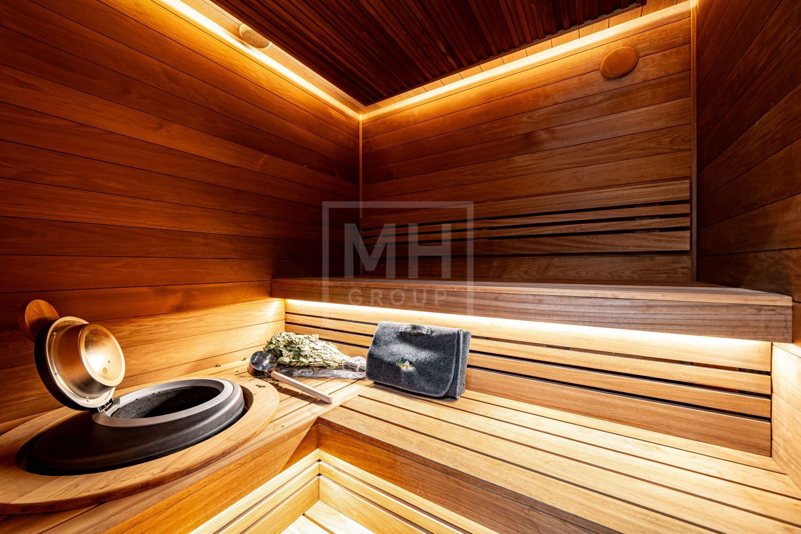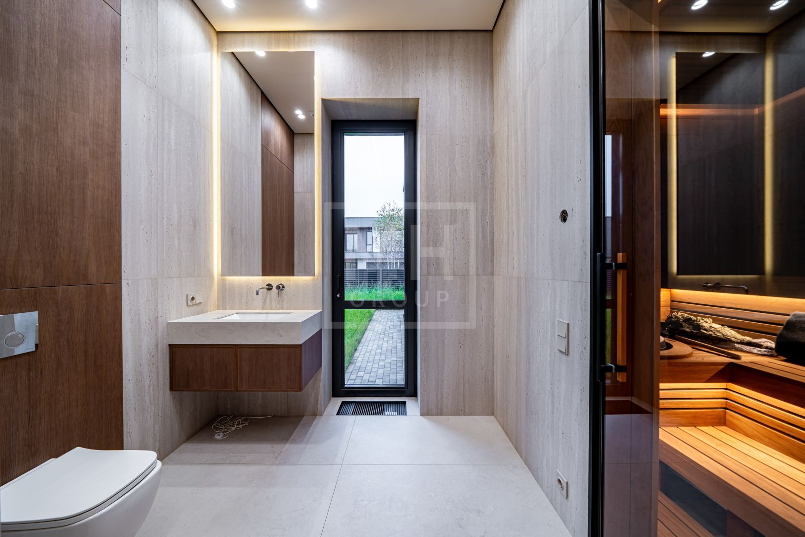 В отделке дома использованы качественные материалы и надежное техническое оборудование : полы – инженерная доска Vecchio (французская елка), керамогранит – Италия / Испания, сантехника – Италия / Германия / Франция, двери – скрытого монтажа, встроенная авторская мебель Rockwood, МДФ/эмаль, сауна - Африканский дуб, термоосина. Финская печь Helo Rondo 960 с мелкодисперсионным паром. Бытовая техника - Asco. Инженерные системы:- газовый и электрический котлы Корея, конвекторы Techno Vent, коллекторы Scout (Италия) нержавеющая сталь/латунь, трубы VALTEC, бойлер ELSEN (Италия) 200 л., кондиционеры Hisense (мульти сплит-система), приточная вентиляционная система Colibri.