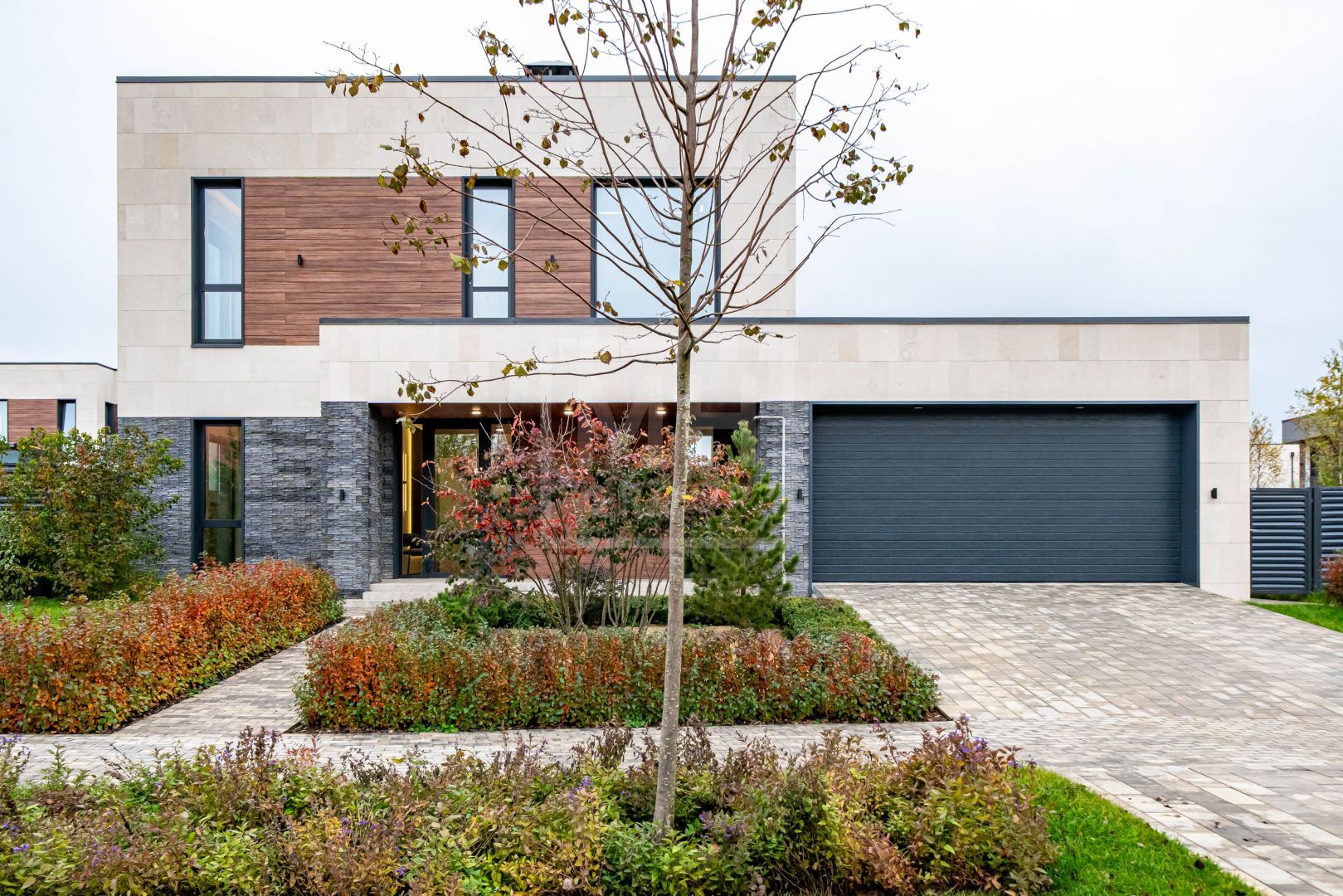 Фасад дома отделан натуральным камнем Limestone и фасадным сланцем.