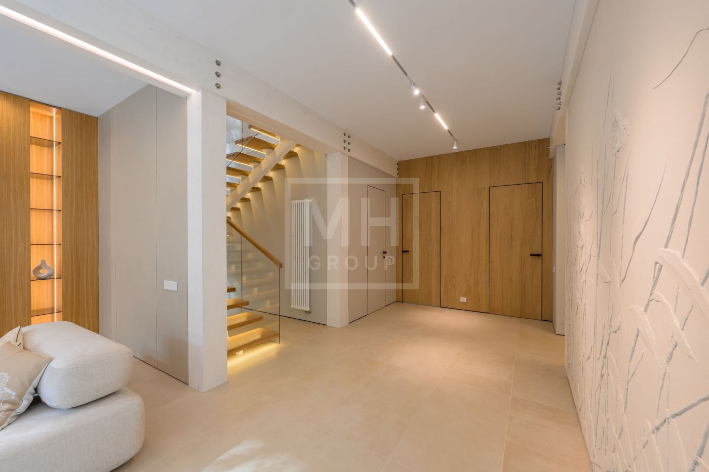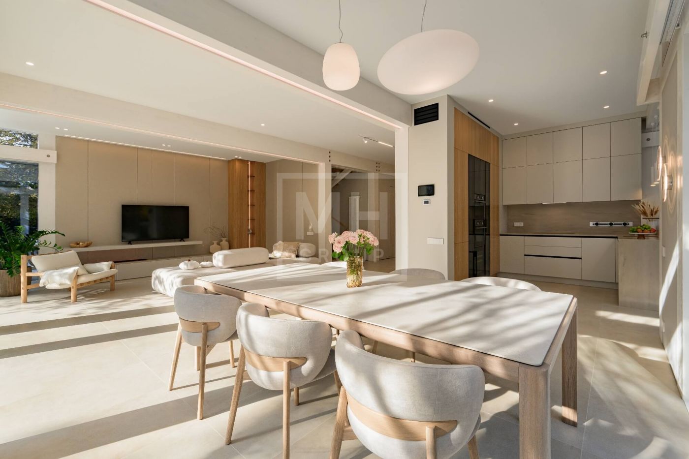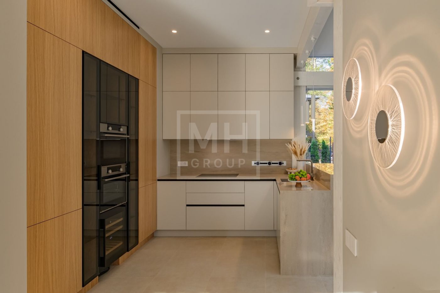 Кухня-столовая-гостиная полностью укомплектованы мебелью в натуральном шпоне. На кухне - встроенная док-станция с моющим роботом-пылесосом и беспроводной зарядкой для телефона