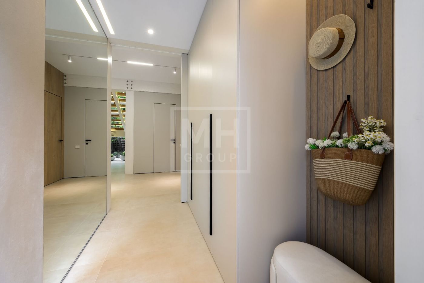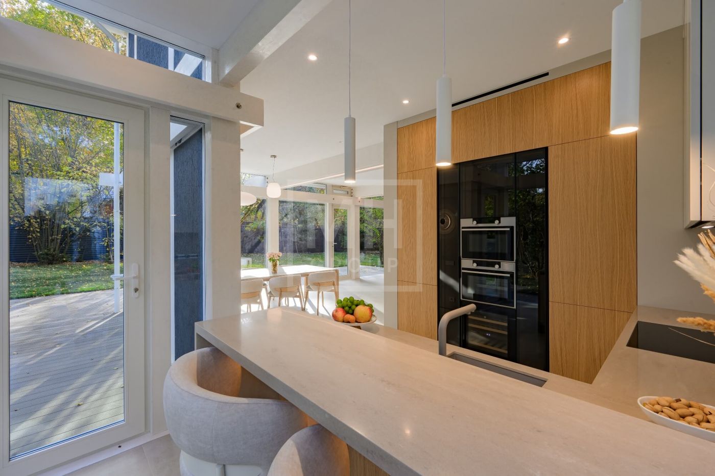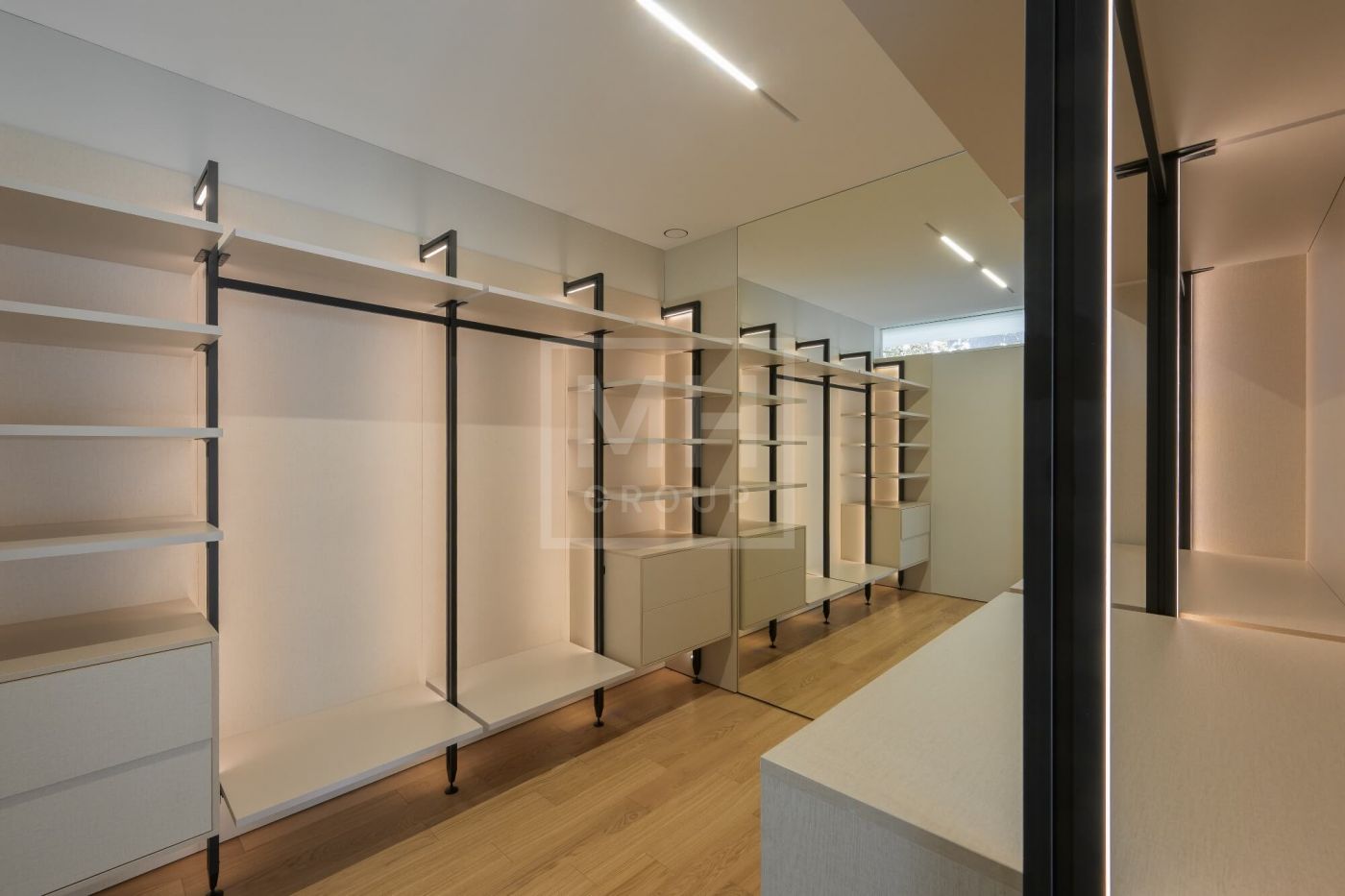 Кухня-столовая-гостиная полностью укомплектованы мебелью в натуральном шпоне. На кухне - встроенная док-станция с моющим роботом-пылесосом и беспроводной зарядкой для телефона