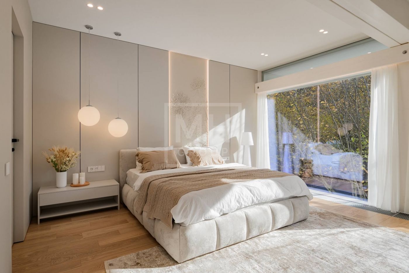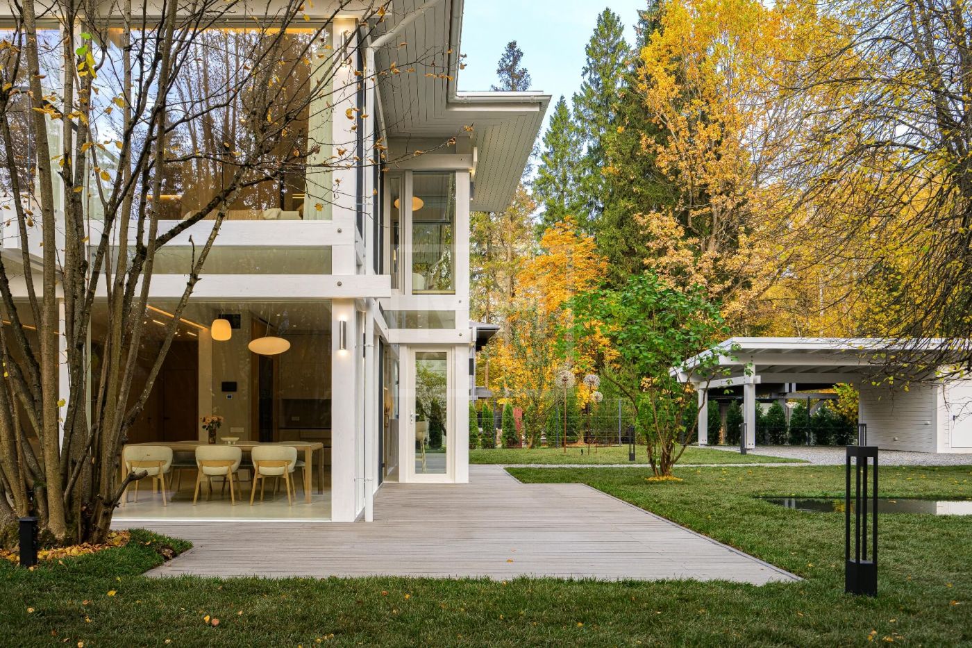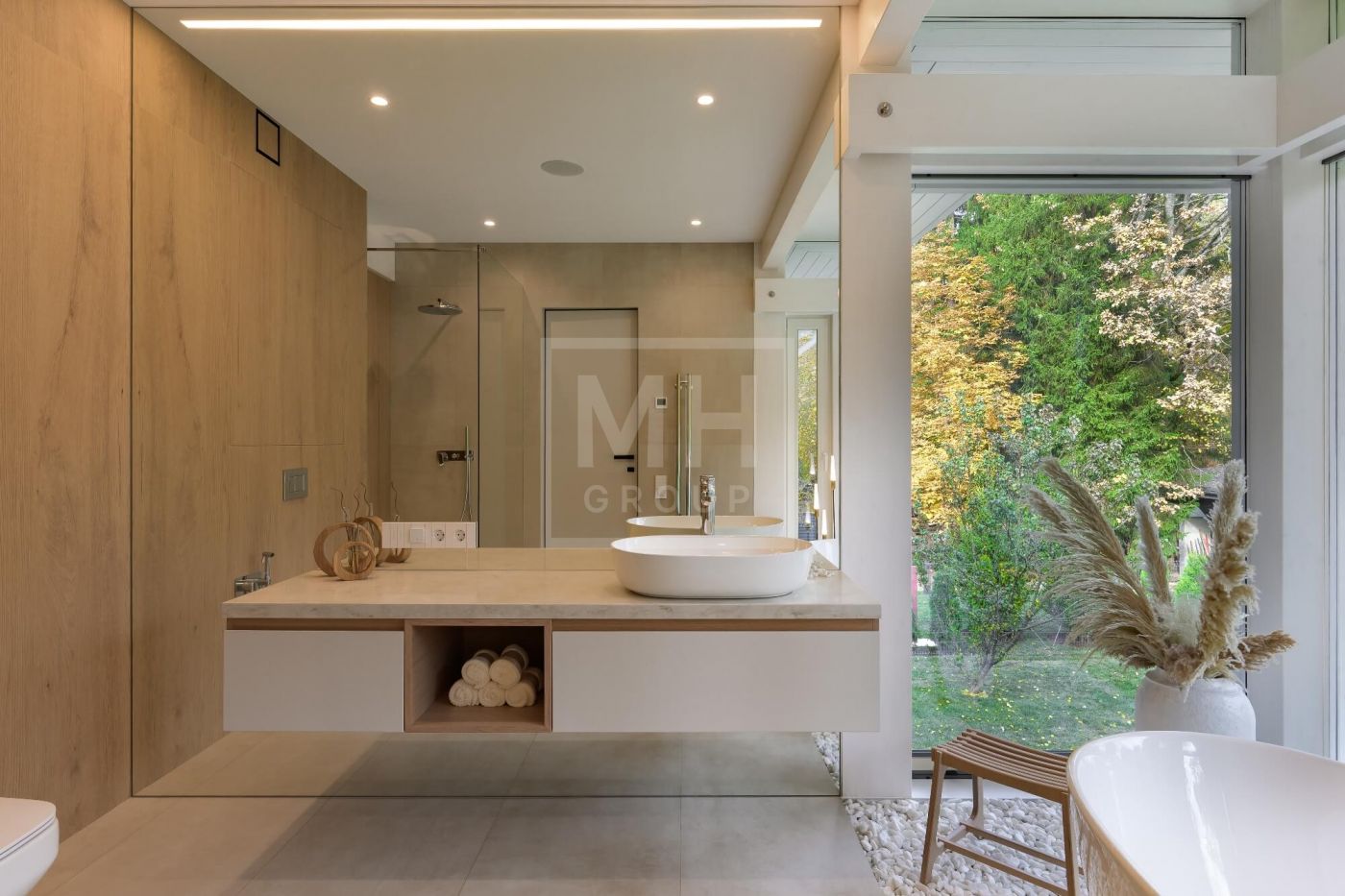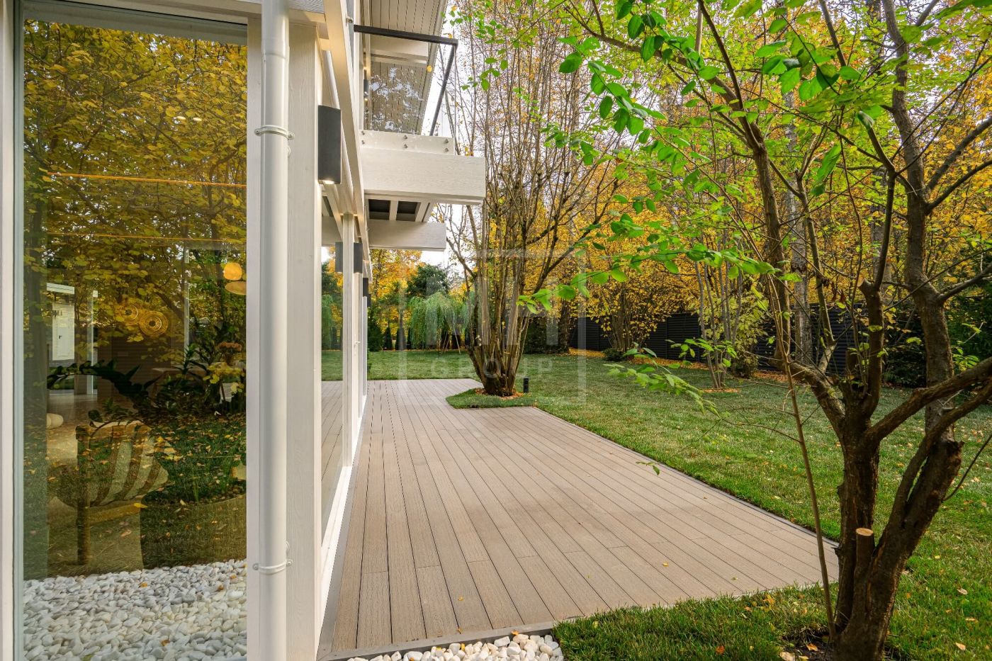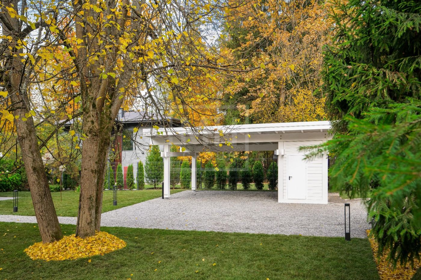 На участке 15,3 сотки сделаны дренаж, дорожки, рулонный газон Люкс, ландшафтный свет. Парковка для 4х автомобилей на территории и дистанционно управляемые ворота. Дополнительно на участке выделено место и подведены коммуникации для строительства бани/гаража/дома для персонала.