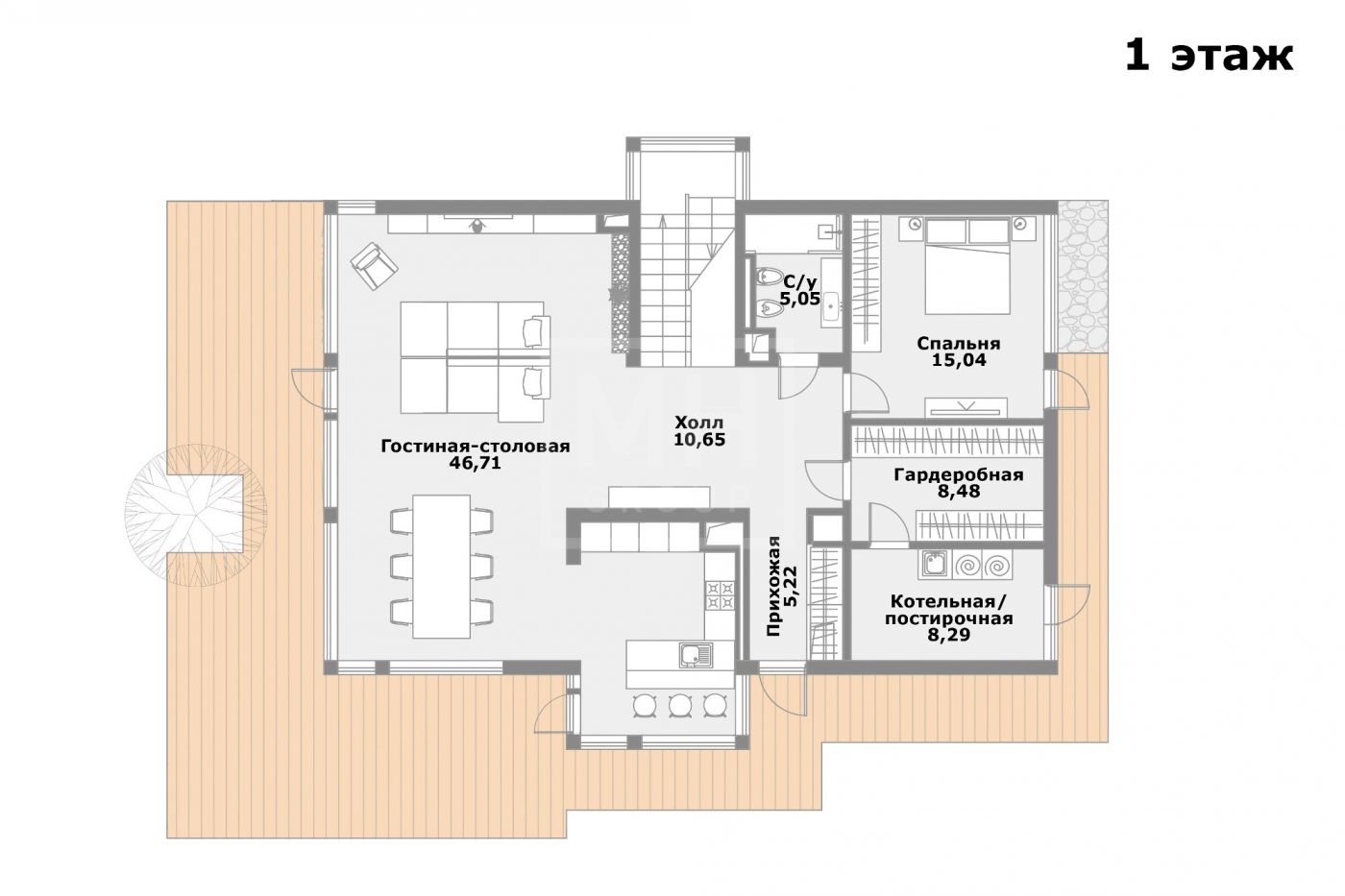 Этаж 1: прихожая,холл, гостиная-столовая,с/у., гостевая спальня с гардеробной, котельная-постирочная.
