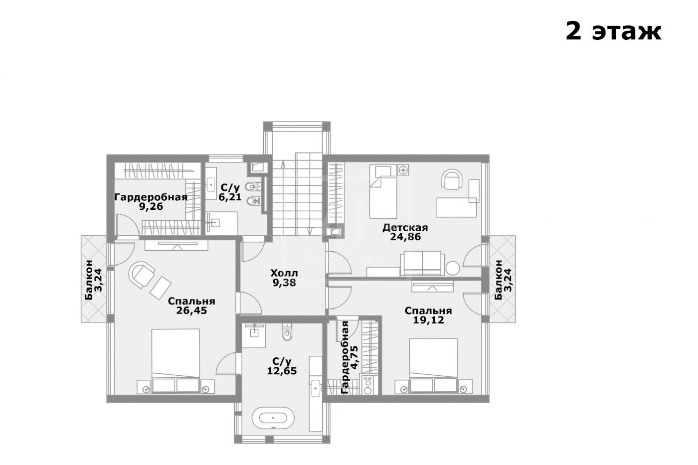 Этаж 2: Холл, с/у., мастер-спальня с гардеробной, ванной и балконом, спальня с гардеробной, детская с выходом на балкон .