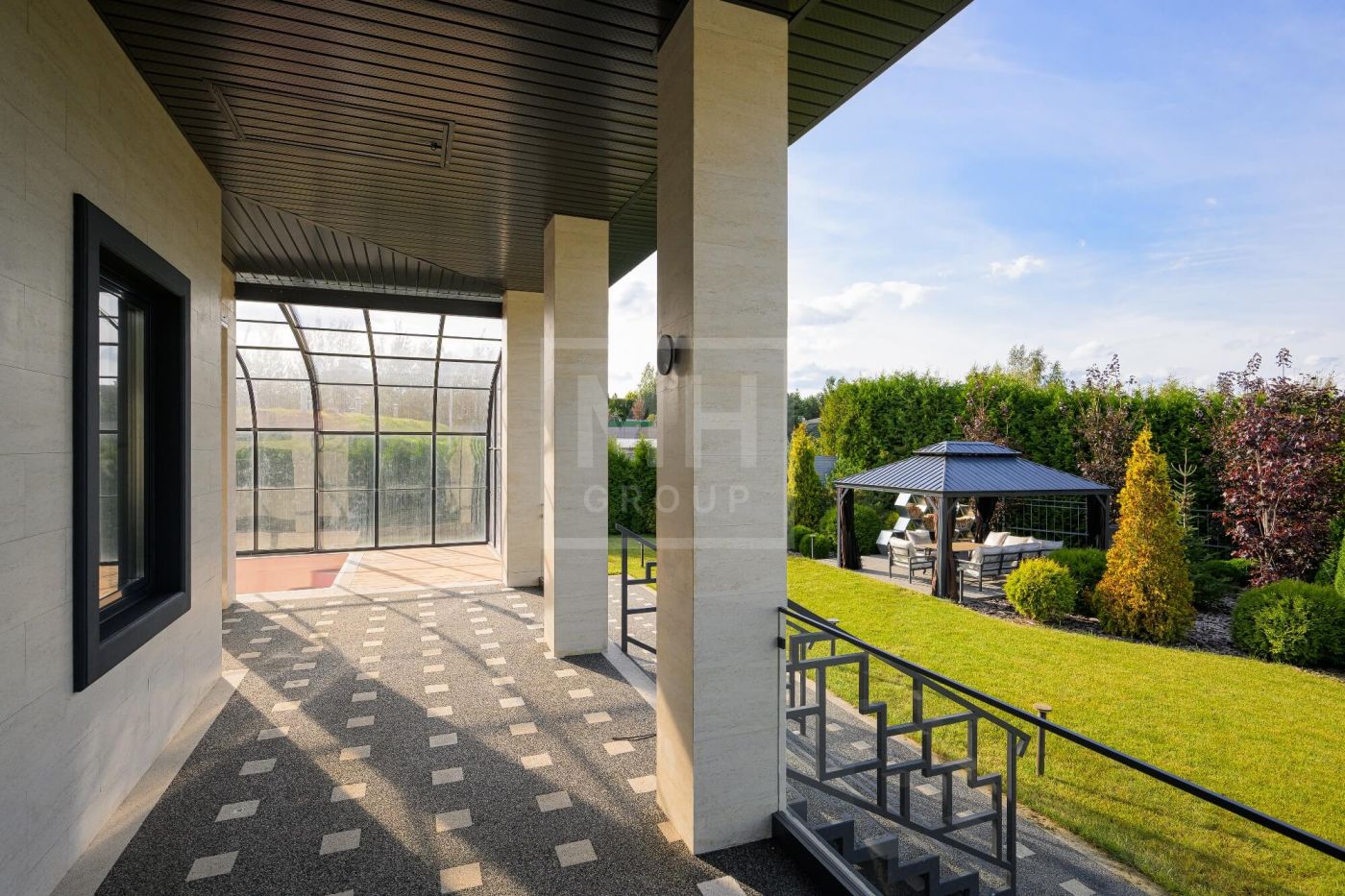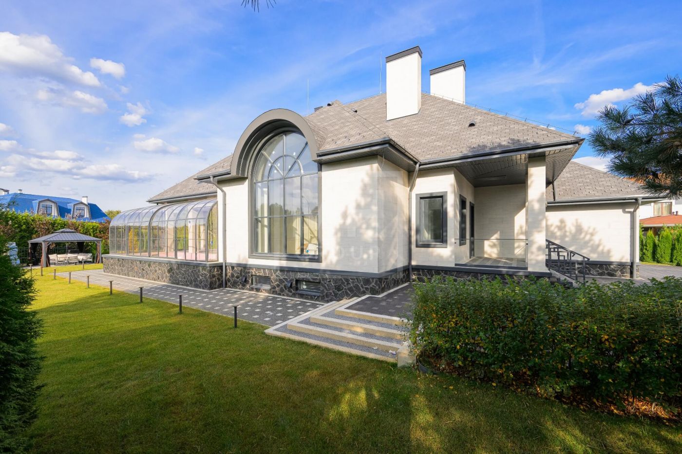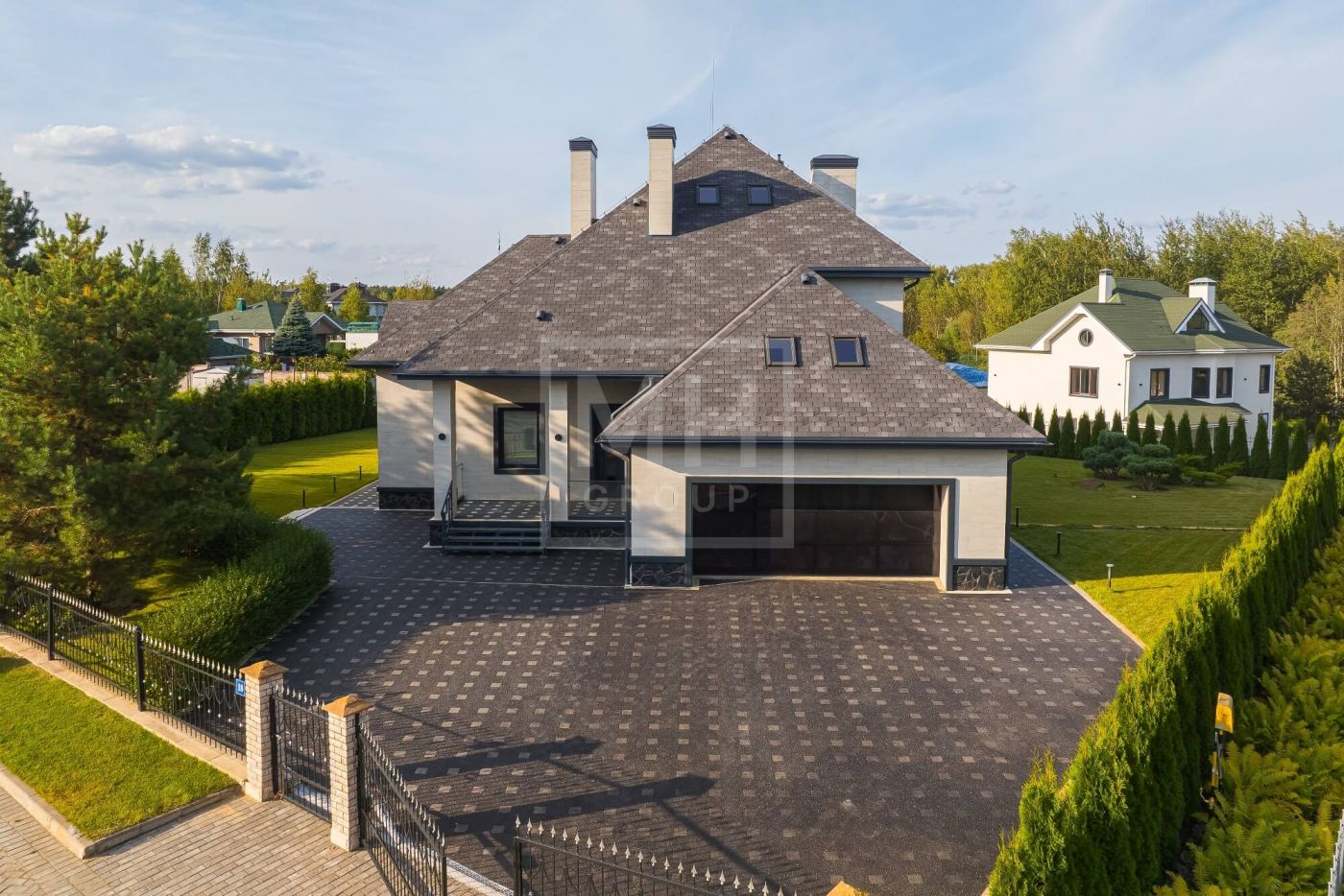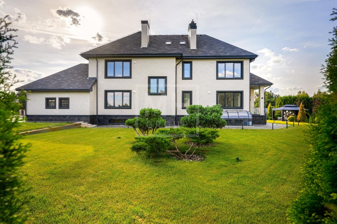 Стильный дом 870 кв.м на зеленом участке 19 соток в коттеджном поселке Крона в 25 км от МКАД по Новорижскому шоссе.В доме: 5 спален, 7 с/у, гостиная, кухня-столовая с выходом на террасу, бассейн, спа-зона, кинотеатр с баром, кабинет, лестничный холл, котельная, постирочная, гардеробная для сезонных вещей, гараж на 2 м/м, подсобные и технические помещения.