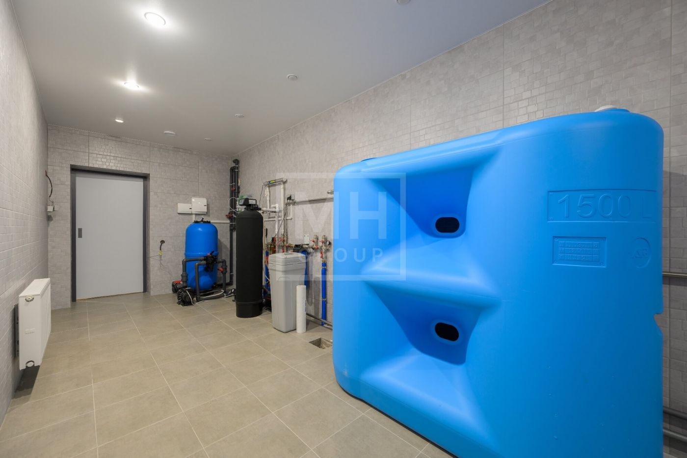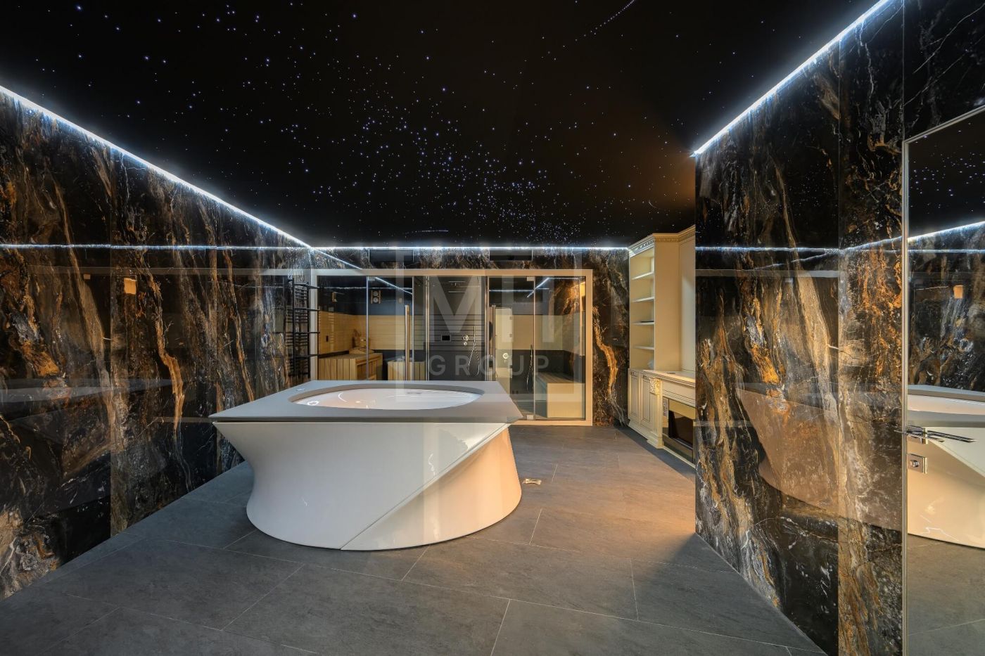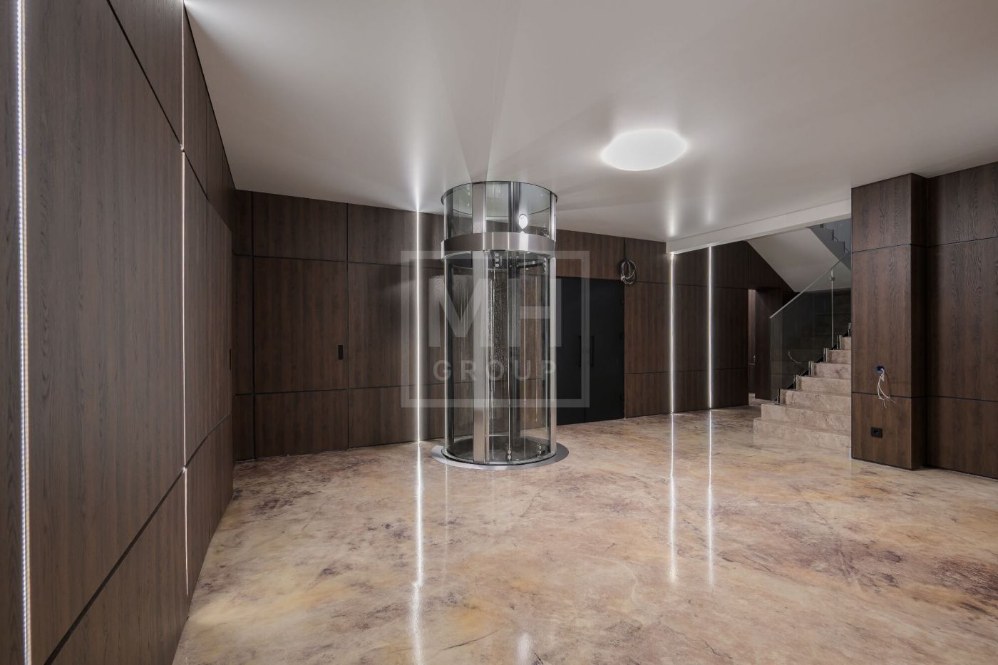 В доме установлен стеклянный лифт на 3 этажа, панорамные окна, второй свет 6,5 м в гостиной, бассейн (7*3 м глубиной 1,5 м, с подогревом, подсветкой и противотоком), спа-зона (джакузи, сауна, хамам, душ впечатлений и гидромассажная ванна на 4 человека), стеклянный купол в бассейне, мастер-этаж с двумя спальнями, бетонный бункер (сейфовая комната “паник-рум” с бронедверью, вентиляцией и интернетом).