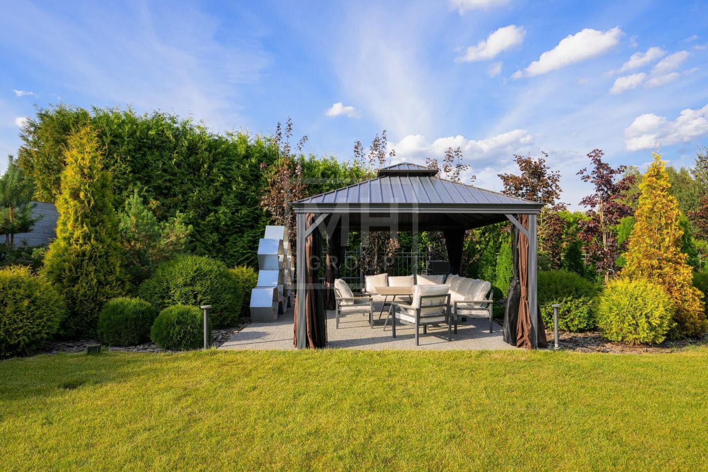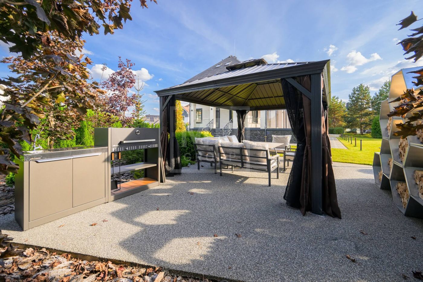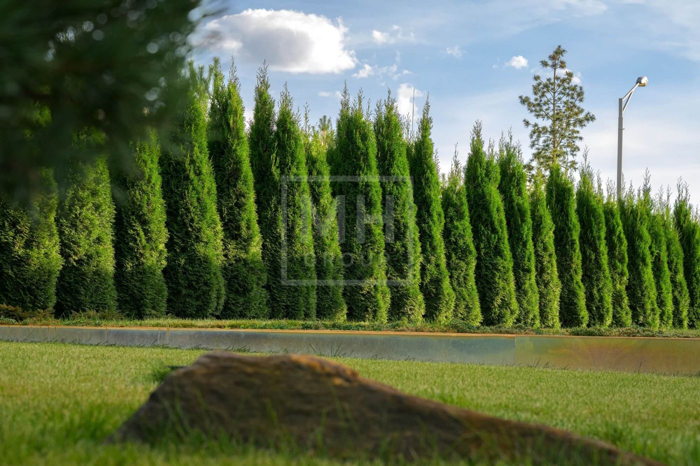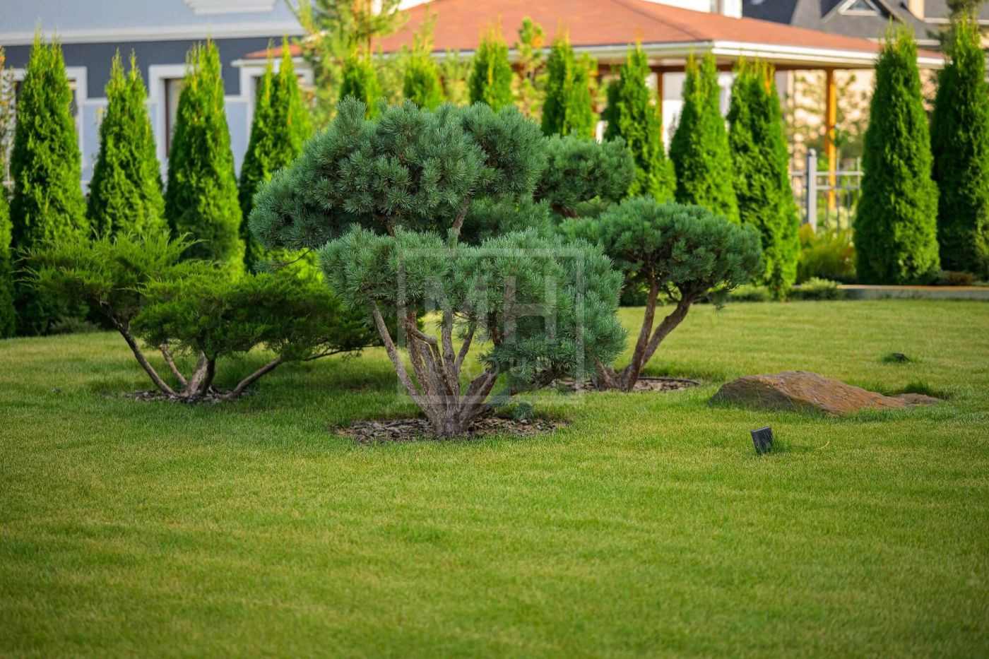 Участок 19 соток с дизайнерским ландшафтом. Организован автополив, выполнена подсветка, уложен газон. Вся отмостка и въездная группа (850 кв.м) - с подогревом. По периметру высажен плотный ряд туй. На участке - большая беседка с барбекю-зоной, диванной группой, обеденным столом на 6-8 персон, дизайнерской дровницей.
