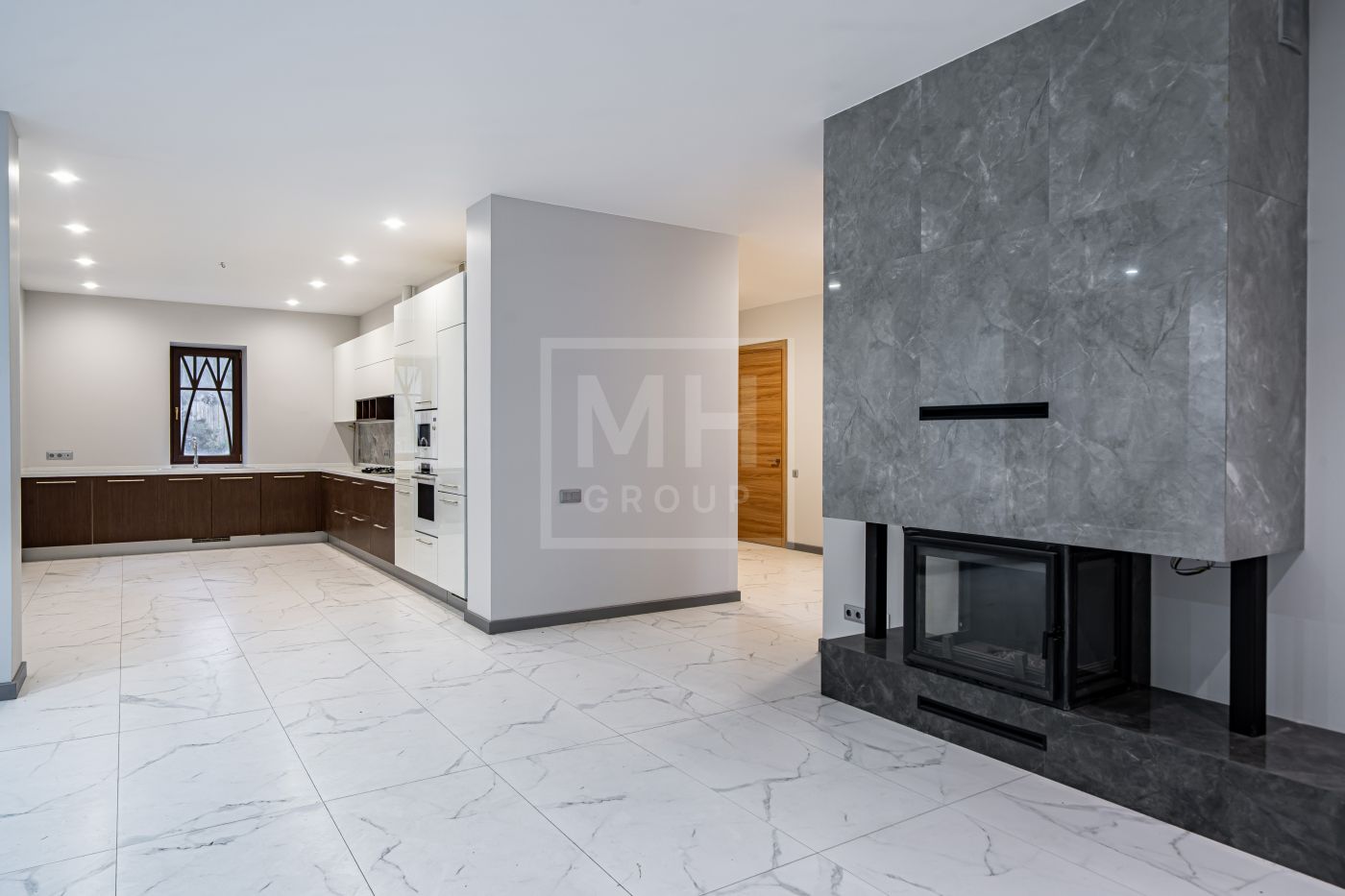 Этаж 1: Холл, гардеробная, спальня с санузлом, гостиная с камином, кухня, гараж, котельная.