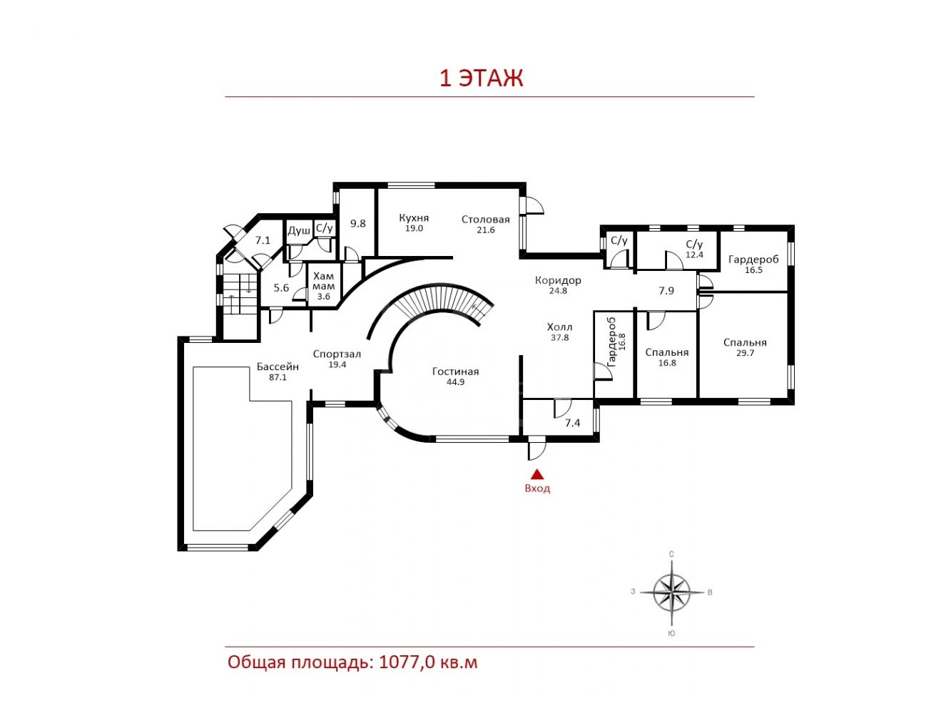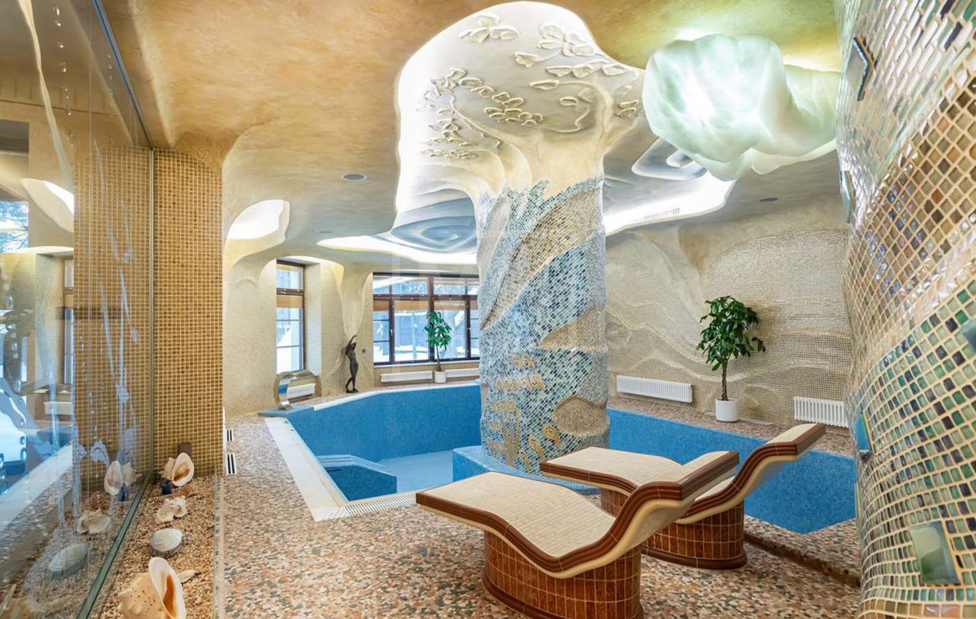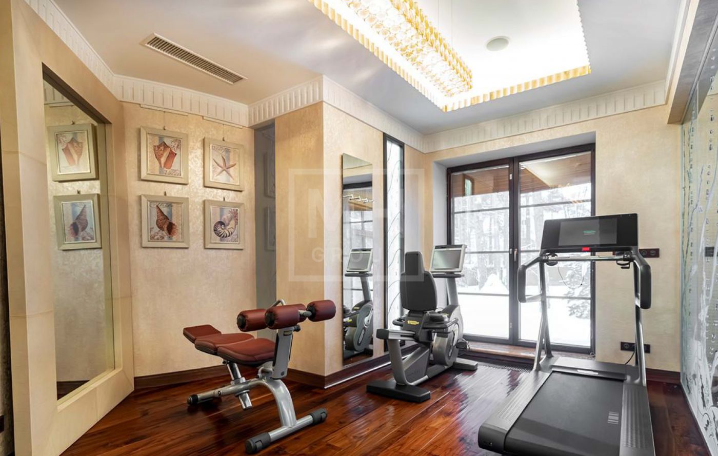 Просторный зимний сад в марокканском стиле, две спальни со своими санузлами и гардеробными. На третьем этаже находится овальный кабинет хозяина,отделанный карельской березой, махагоном и орехом.