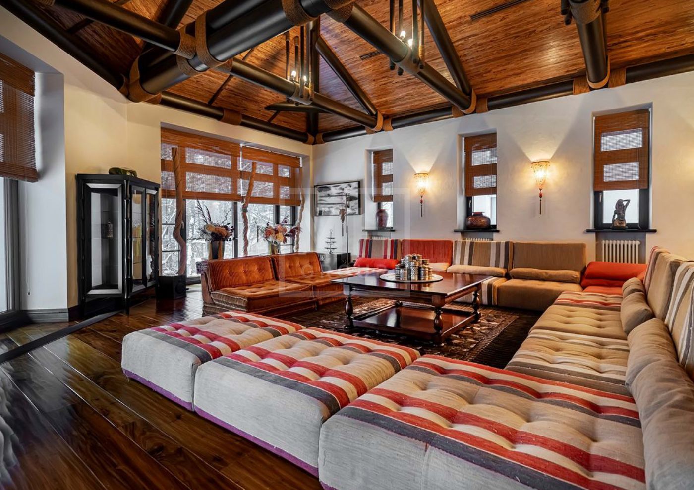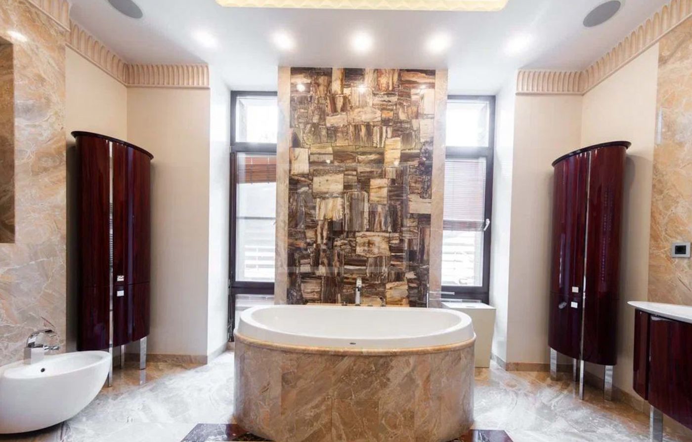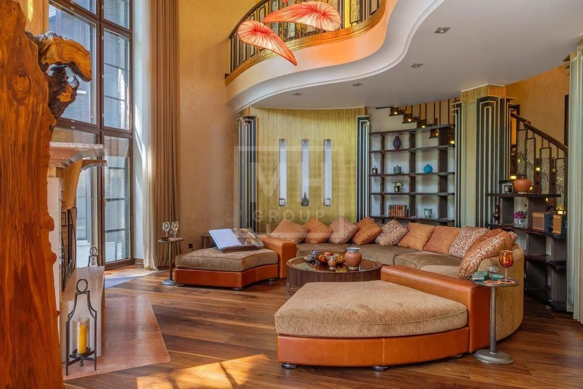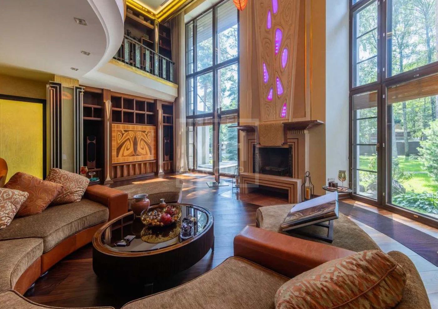 Роскошная гостиная с дровяным камином, вторым светом и панорамными окнами. Мастер-спальня с собственной гардеробной и санузлом, украшенным панно из полудрагоценного камня – Pertified Wood.
