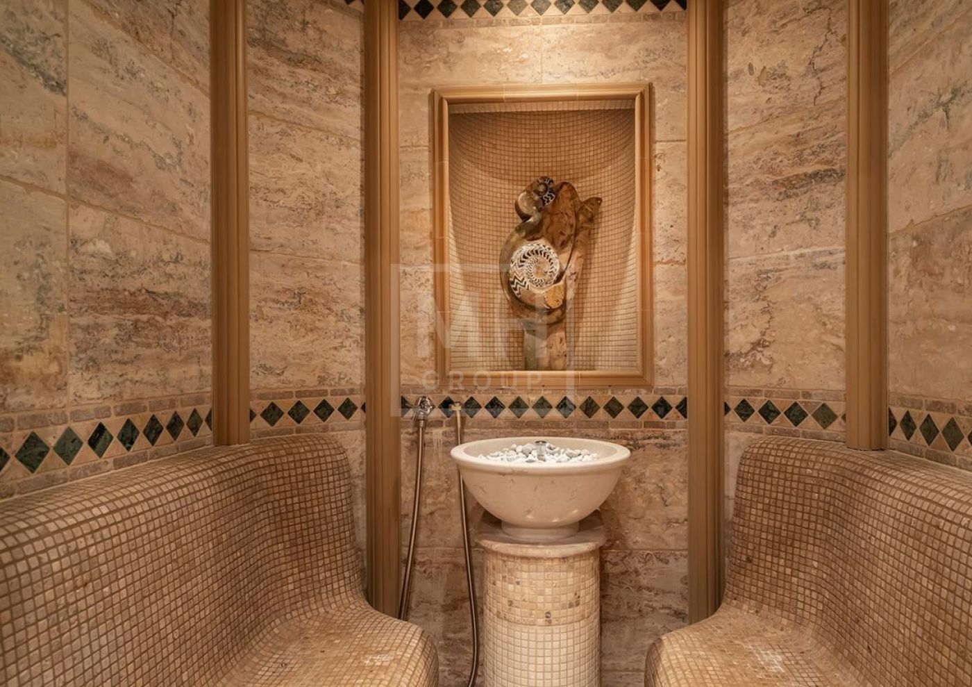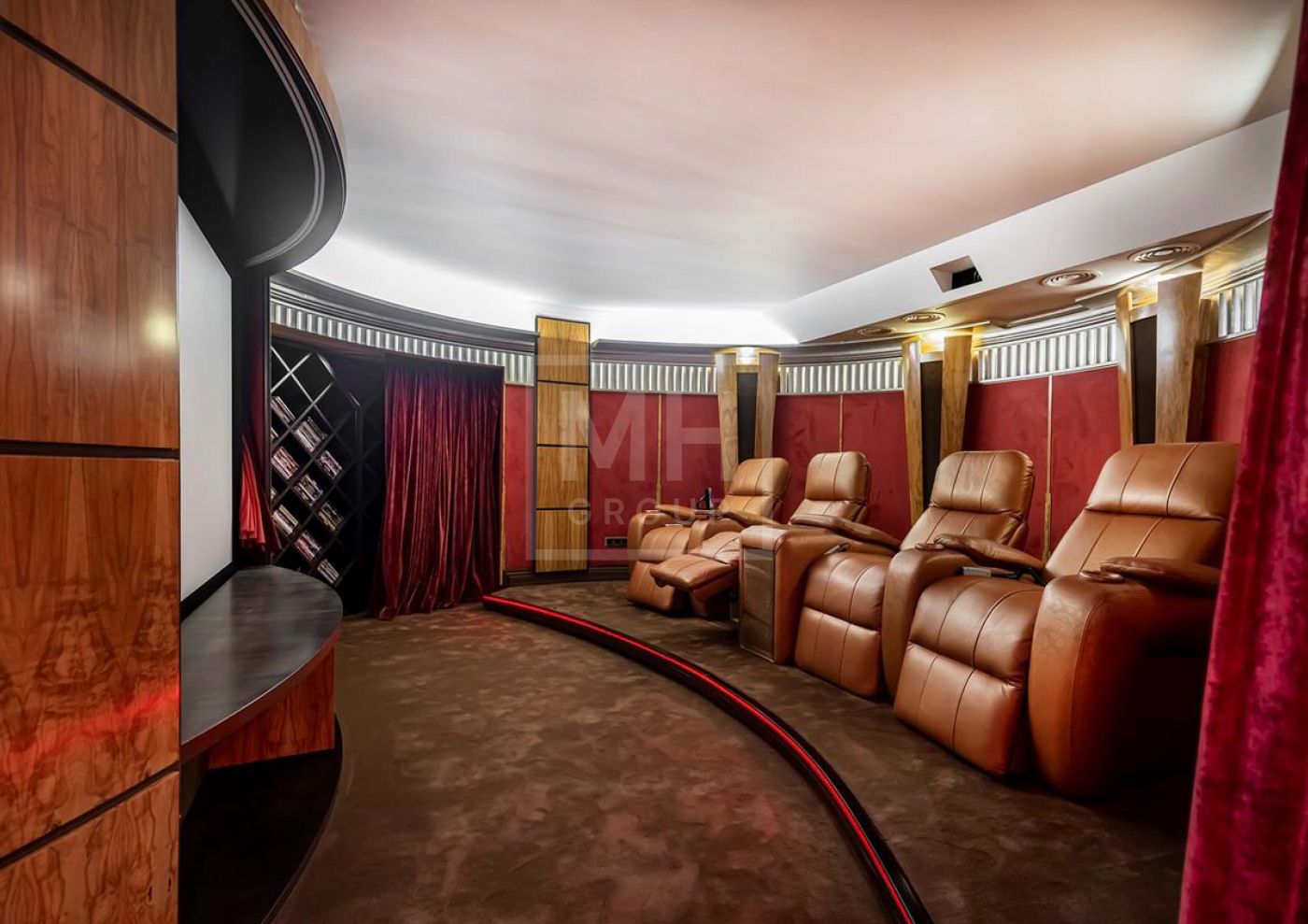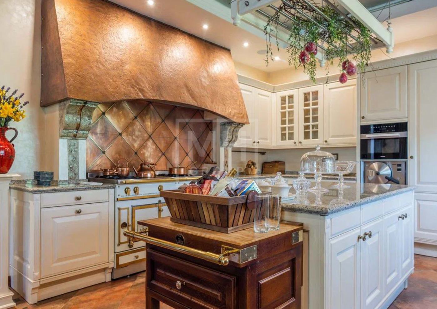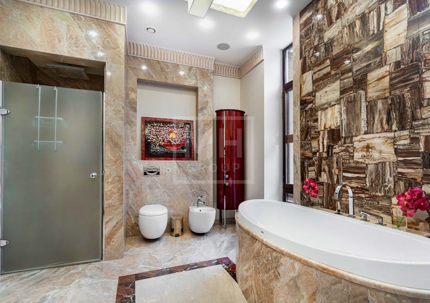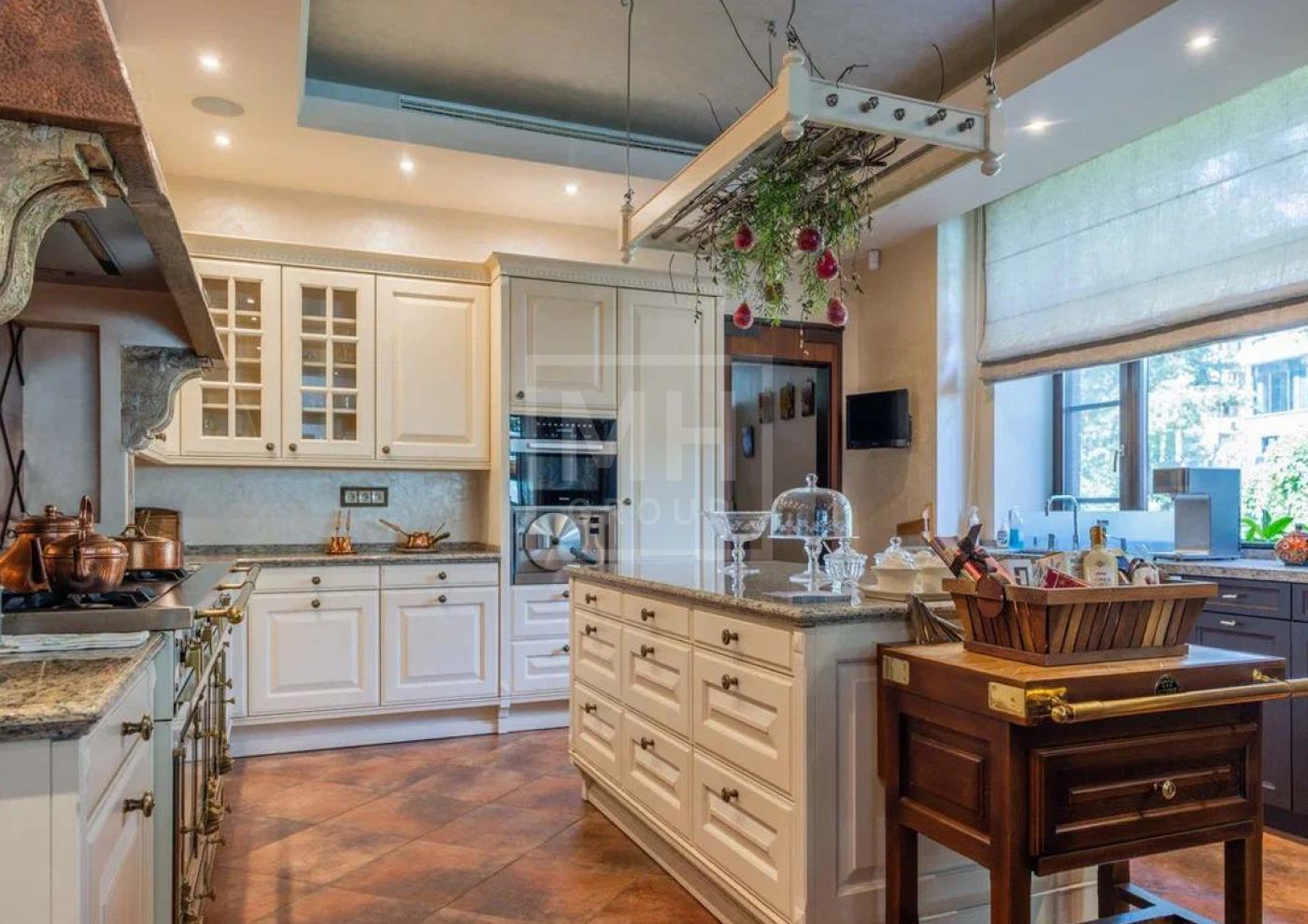 Восхитительная кухня, с нотками стиля Прованс, имеет панорамные окна в пол и выход на уютную террасу, оборудована профессиональной печью La Cornue (Франция), над которой выполнен вытяжной зонт, декорированный медью в старинной технике французских кухонь. Зона библиотеки и арт объектов, мастер-спальня со своей просторной гардеробной и санузлом с джакузи, который полностью облицован ониксом медового оттенка – слэбами и в мозаике.