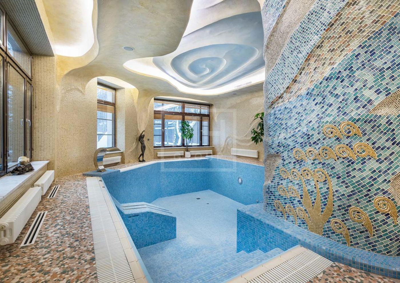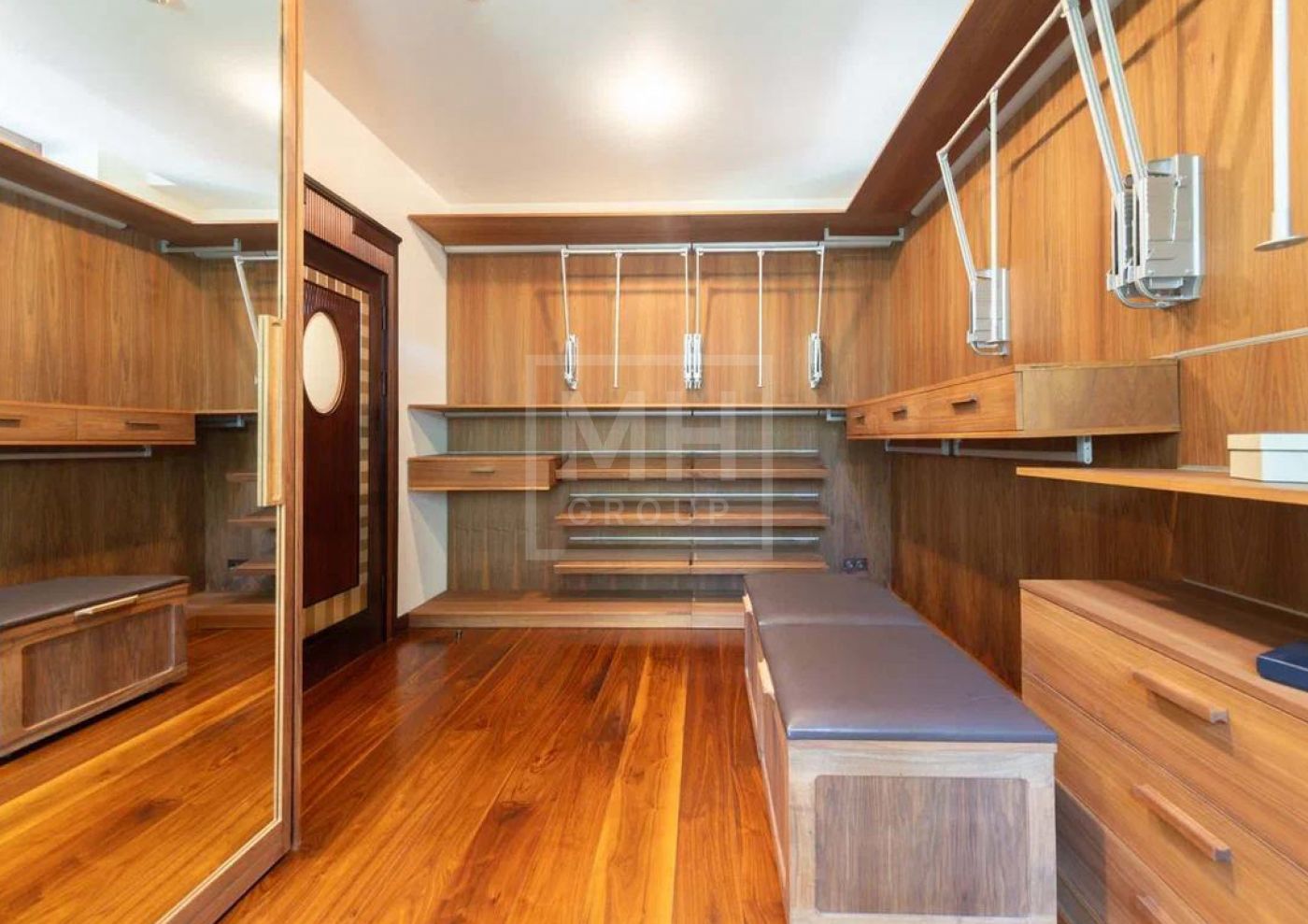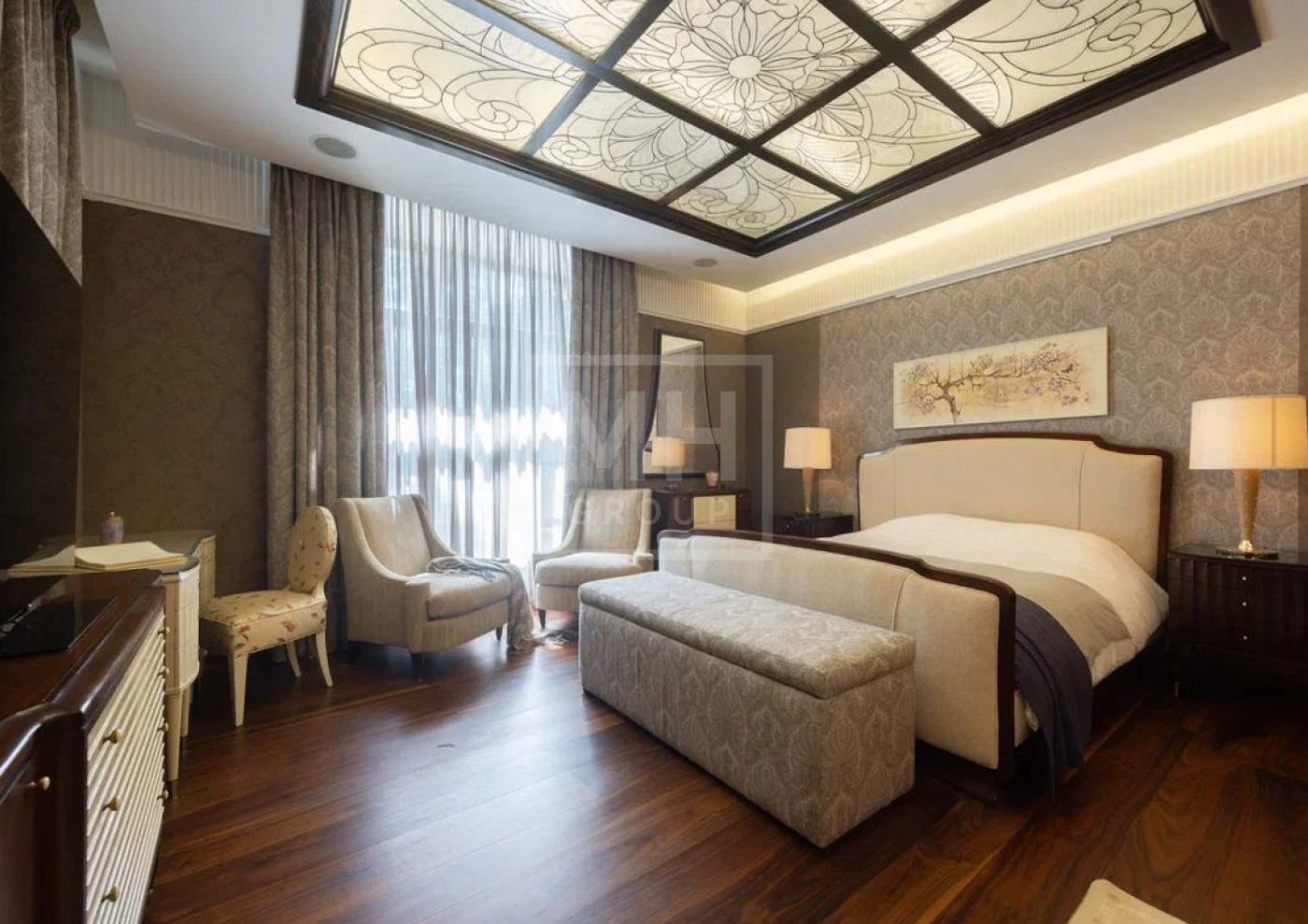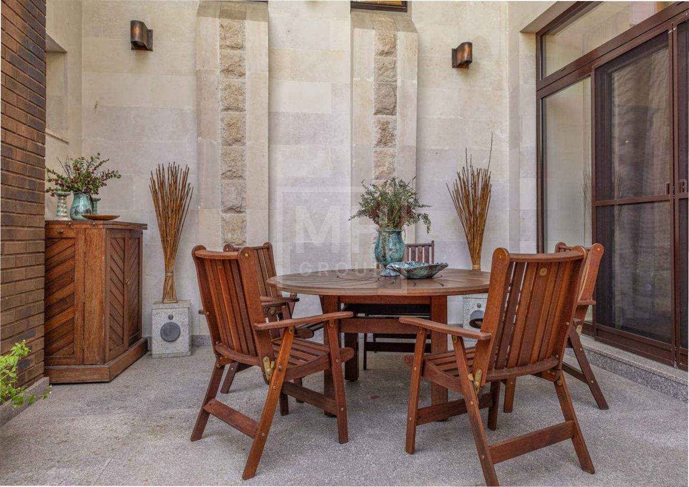 Восхитительная кухня, с нотками стиля Прованс, имеет панорамные окна в пол и выход на уютную террасу, оборудована профессиональной печью La Cornue (Франция), над которой выполнен вытяжной зонт, декорированный медью в старинной технике французских кухонь. Зона библиотеки и арт объектов, мастер-спальня со своей просторной гардеробной и санузлом с джакузи, который полностью облицован ониксом медового оттенка – слэбами и в мозаике.